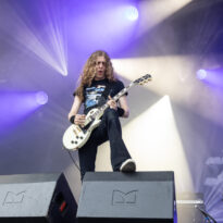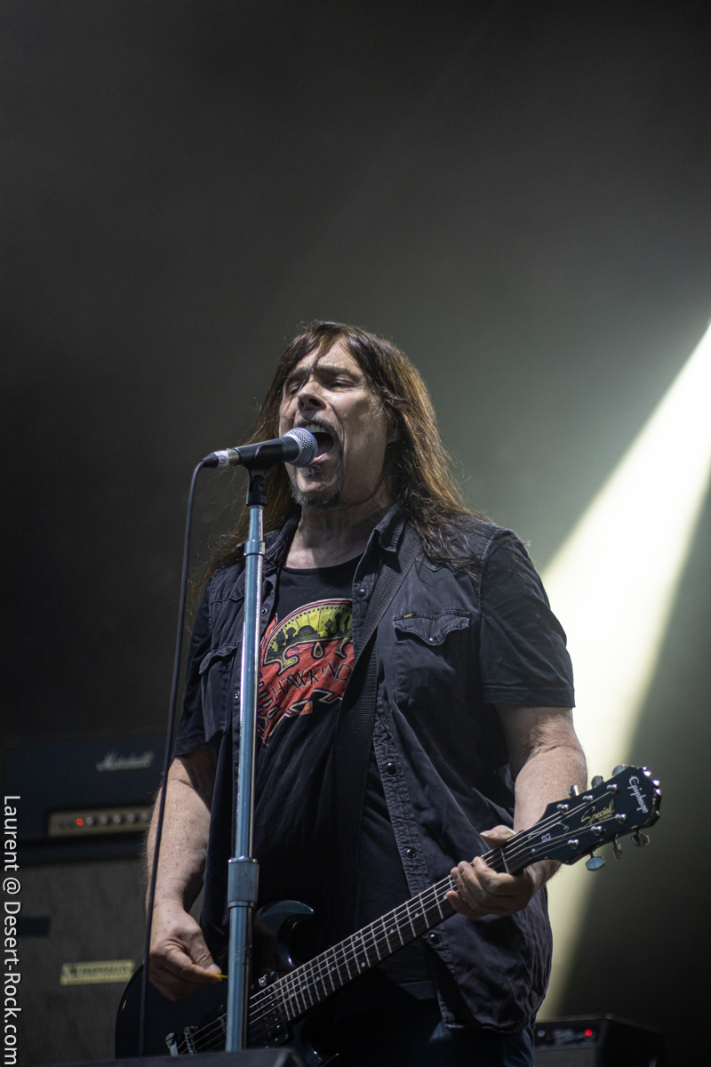 Qu’écrire au sujet de Monster Magnet qui n’ait jamais été écrit ? Routinière du Hellfest, la bande à Dave Wyndorf se retrouve en avant-dernière position sur une affiche oú elle aurait pu tout aussi bien comme de par le passé s’inscrire en headliner. Comme à son habitude le combo historique déroule un set d’un grand professionnalisme, en particulier dans l’interprétation : s’appuyant sur un light show efficace mais sobre (notons ici la qualité du support « lights » apporté aux groupes sur tout le week-end, y compris dès la matinée !), les musiciens sont évidemment impeccables (dont le nouveau bassiste Alec Morton, qui a notamment traîné ses pattes d’eph’ chez les extraordinaires Raging Slab, et qui est ce soir sobre scéniquement mais efficace soniquement), solides dans l’interprétation et dans le jeu de scène, Wyndorf en tête, en leader évident et assumé de la formation. Côté set list, on a cru à une grosse surprise avec une entame déstabilisante (la reprise « Born to Go » de Hawkwind, et le vieux et rare « Superjudge »), mais c’est finalement l’efficacité absolue qui a été visée, avec une set list qui va majoritairement piocher dans les pépites de Powertrip (dont le plutôt rare « Bummer ») et de Dopes to Infinity. Le set d’une heure se passe à une vitesse folle. Le public, qui s’agglomère petit à petit au fil du set (en commençant pendant le set des très attendus Iron Maiden, on perd l’opportunité de capter un certain nombre de curieux !), constitue d’abord une fosse relativement calme bien que réceptive et branlante du chef, avant de se lâcher un peu plus en fin de set, voire se laisser aller à quelques gentils slams. L’explosion de « Spacelord » sonne le glas du concert, malgré l’ambition du groupe de porter quelques titres supplémentaires. Le public, ignorant de ce dernier fait, repart le sourire aux lèvres et le pied léger.