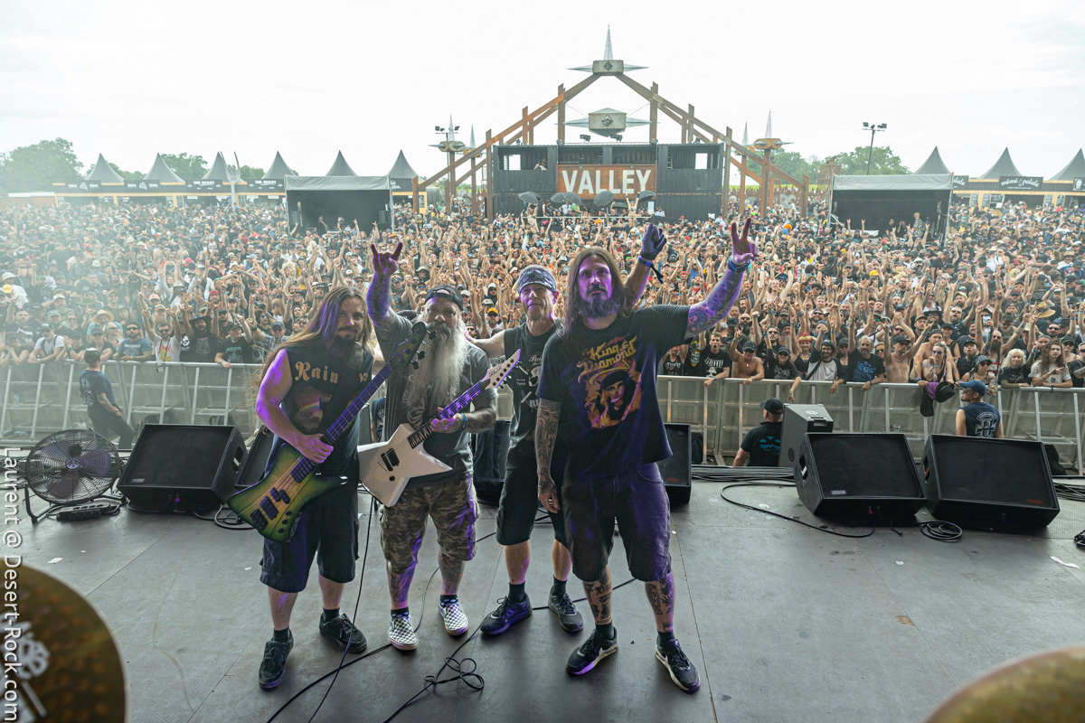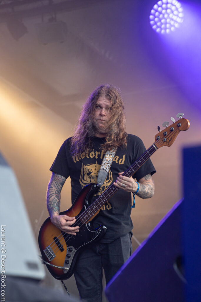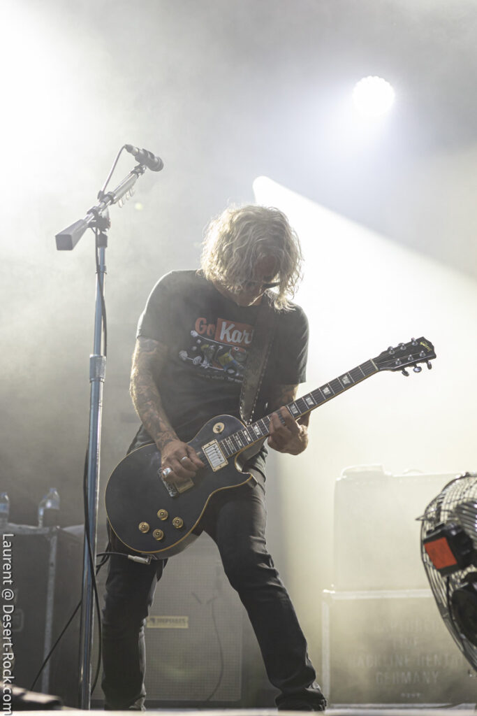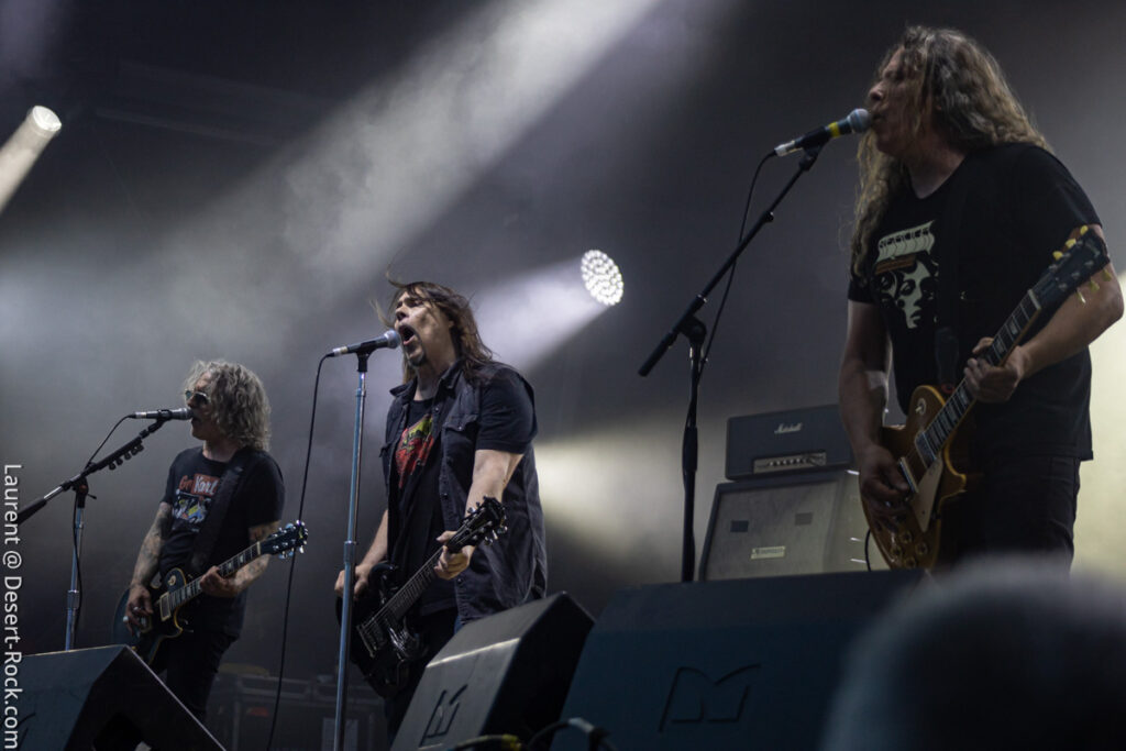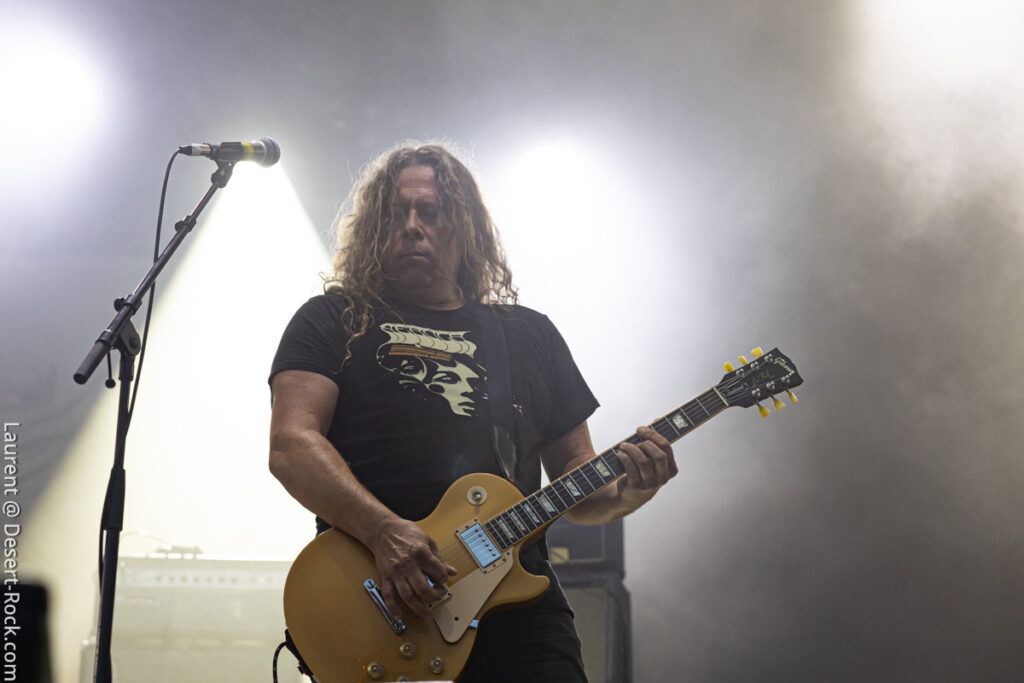 Depuis le temps que les américains jouent dans le coin (Main stage, Valley, Main Stage, Valley,…), rien d’étonnant à ce que la foule se masse compacte au pied de la scène (clairement l’assistance la plus dense rencontrée sur tout le week-end) pour savourer l’arrivée du groupe sur l’habituelle bande son de leur reprise du « Money » de Chuck Brown. Bonne surprise : c’est le bassiste de Fu Manchu, Brad Davis, qui remplace Dan Maines (ce dernier étant retenu chez lui pour des questions « personnelles »). Il faudra trois titres puis l’arrivée de « Earth Rocker » pour que le public cède totalement aux appels de Neil Fallon, qui depuis la scène multiplie, comme à son habitude, les postures et gestes d’illustration de son chant toujours aussi bien porté – notons sa prestation vocale en tous points impeccable tout du long du set. A ses côtés, Tim Sult et Davis sont postés en fond de scène, inamovibles, occupés à distiller les riffs pour l’un, le groove emblématique du quatuor pour l’autre (Davis parvient sans peine à mimer l’attitude scénique du titulaire du poste). Dans le même temps, derrière, Jean-Paul Gaster défonce son kit comme à son habitude, dans une grâce et une subtilité sans équivalence dans le circuit musical contemporain – le bonhomme est hypnotisant. Les headliners s’emparent de l’âme de la foule qui ne demande pas mieux que de se sacrifier sur l’autel du stoner au son de « Pure Rock Fury » et autres classiques des set lists du groupe. Jamais exactement là où on les attend (sauf concernent le niveau qualitatif), le quatuor dégaine deux petites raretés extraites de leur premier album, des titres qui ont presque trente ans et s’intègrent à la perfection dans le set (même si peu connus du public). En conclusion d’une journée d’anthologie, le public reprend en chœur « Electric Worry », qui sera enchaîné au moins percutant « The Face » pour conclure cette soirée.