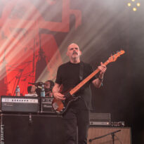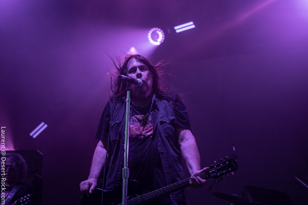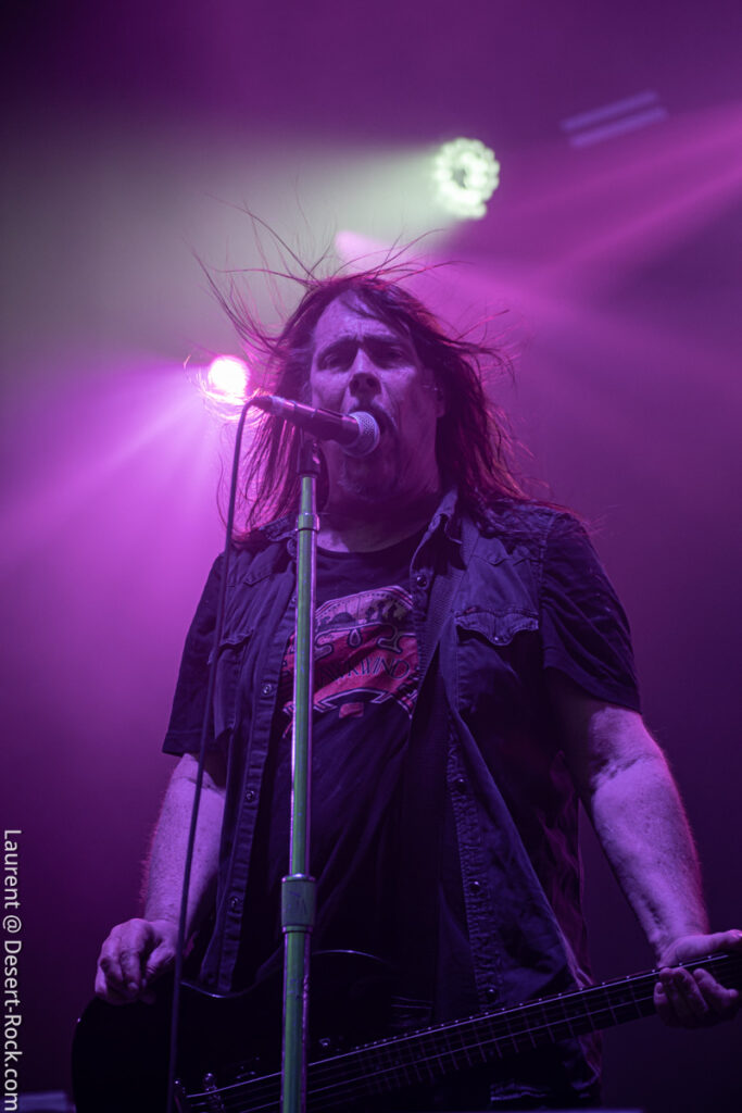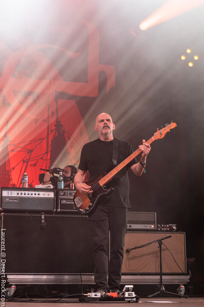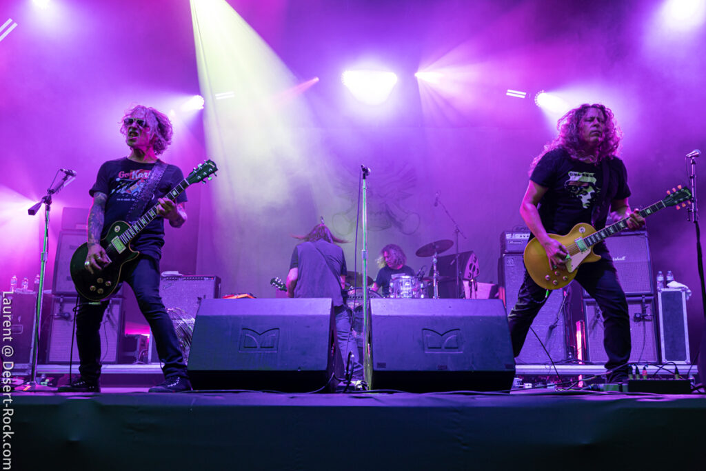Depuis le temps que les américains jouent dans le coin (Main stage, Valley, Main Stage, Valley,…), rien d’étonnant à ce que la foule se masse compacte au pied de la scène (clairement l’assistance la plus dense rencontrée sur tout le week-end) pour savourer l’arrivée du groupe sur l’habituelle bande son de leur reprise du « Money » de Chuck Brown. Bonne surprise : c’est le bassiste de Fu Manchu, Brad Davis, qui remplace Dan Maines (ce dernier étant retenu chez lui pour des questions « personnelles »). Il faudra trois titres puis l’arrivée de « Earth Rocker » pour que le public cède totalement aux appels de Neil Fallon, qui depuis la scène multiplie, comme à son habitude, les postures et gestes d’illustration de son chant toujours aussi bien porté – notons sa prestation vocale en tous points impeccable tout du long du set. A ses côtés, Tim Sult et Davis sont postés en fond de scène, inamovibles, occupés à distiller les riffs pour l’un, le groove emblématique du quatuor pour l’autre (Davis parvient sans peine à mimer l’attitude scénique du titulaire du poste). Dans le même temps, derrière, Jean-Paul Gaster défonce son kit comme à son habitude, dans une grâce et une subtilité sans équivalence dans le circuit musical contemporain – le bonhomme est hypnotisant. Les headliners s’emparent de l’âme de la foule qui ne demande pas mieux que de se sacrifier sur l’autel du stoner au son de « Pure Rock Fury » et autres classiques des set lists du groupe. Jamais exactement là où on les attend (sauf concernent le niveau qualitatif), le quatuor dégaine deux petites raretés extraites de leur premier album, des titres qui ont presque trente ans et s’intègrent à la perfection dans le set (même si peu connus du public). En conclusion d’une journée d’anthologie, le public reprend en chœur « Electric Worry », qui sera enchaîné au moins percutant « The Face » pour conclure cette soirée.