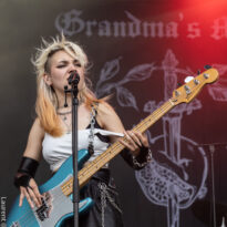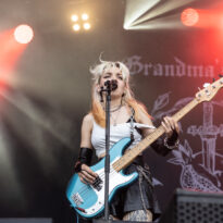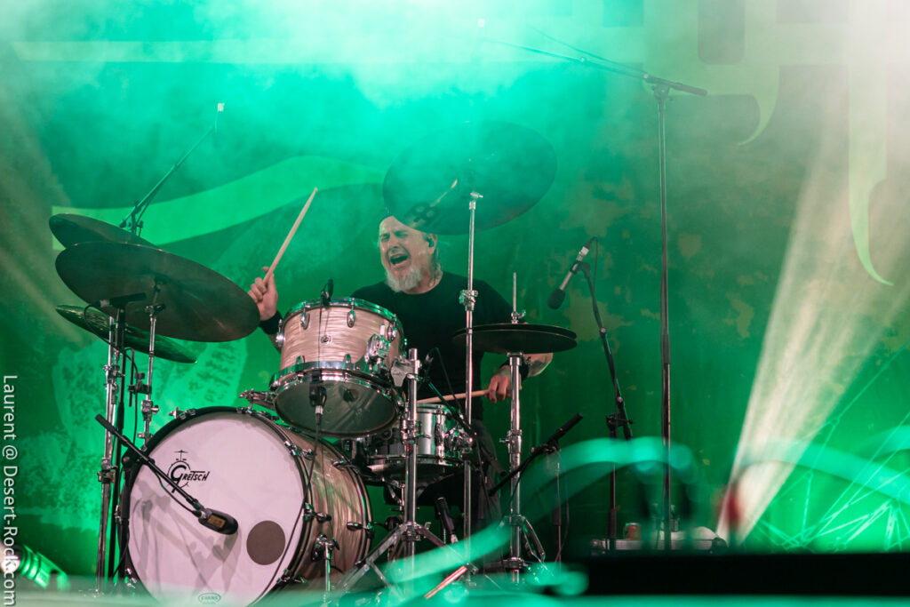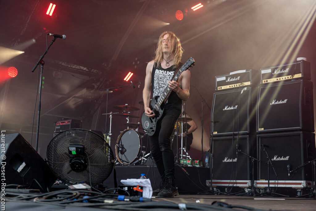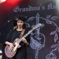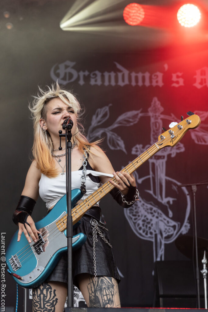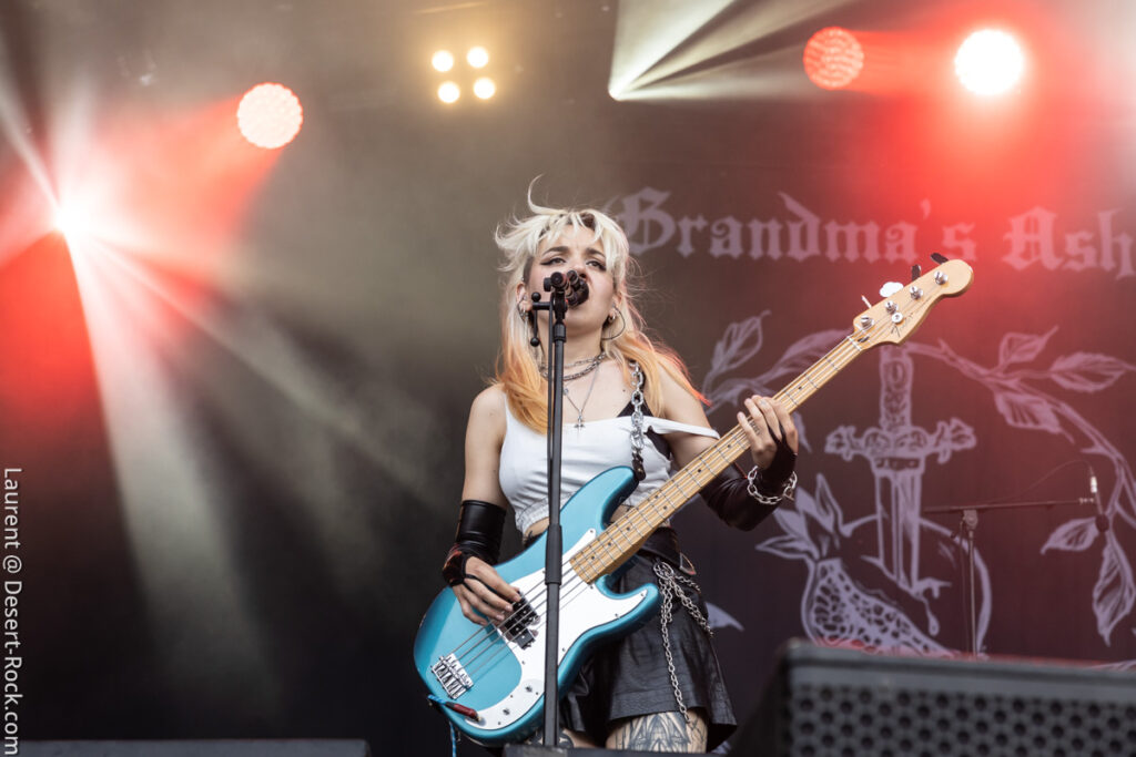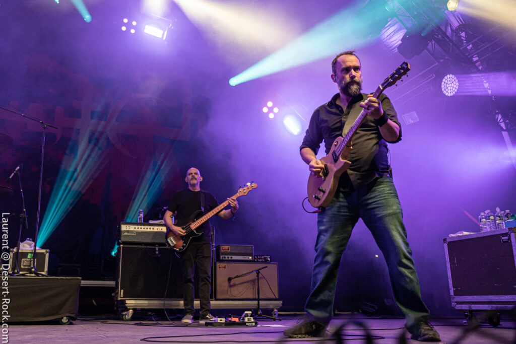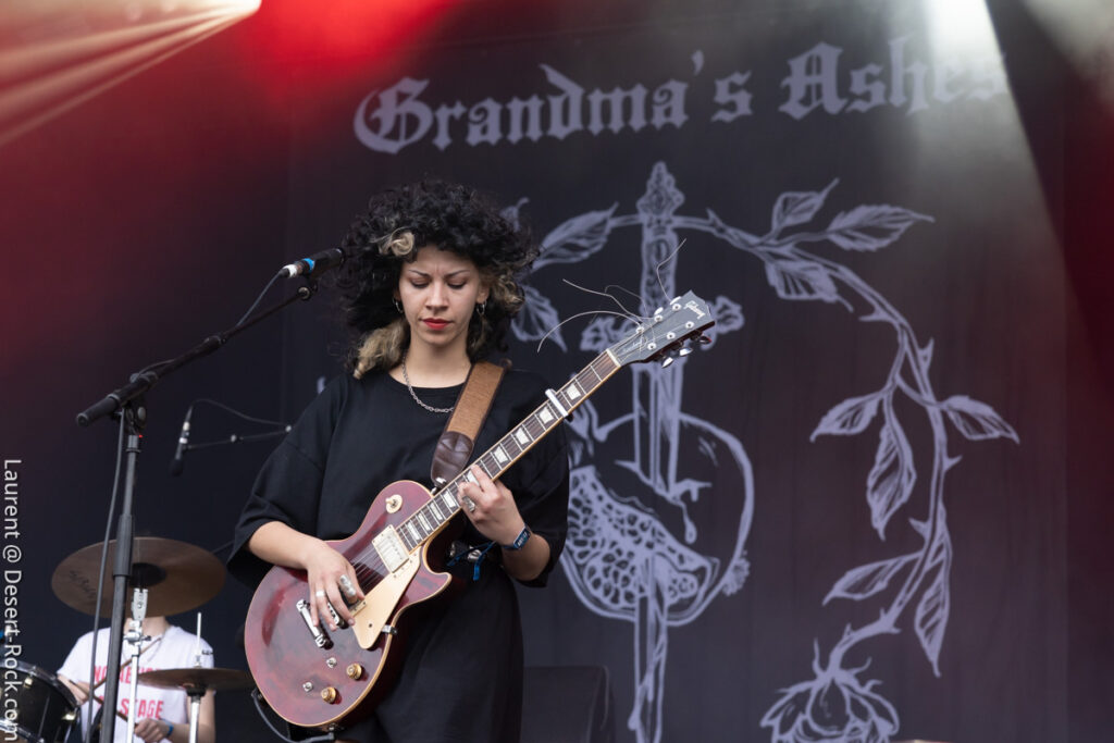 Invité de dernière minute, le trio hexagonal se retrouve propulsé sur un créneau très visible en raison de l’annulation de la venue des ukrainiens de Stoned Jesus, retenus au pays en application de récentes évolutions des contraintes administratives, imposées par leur pays belligérant. Coincé entre deux pointures de la scène stoner, dans un style musical un peu décalé (une sorte d’indie rock chaloupé aux accents psych-grungy) Grandma’s Ashes relève ce challenge avec brio, devant un public curieux ne connaissant majoritairement pas leur répertoire. Pari tenu, pari gagné.