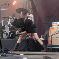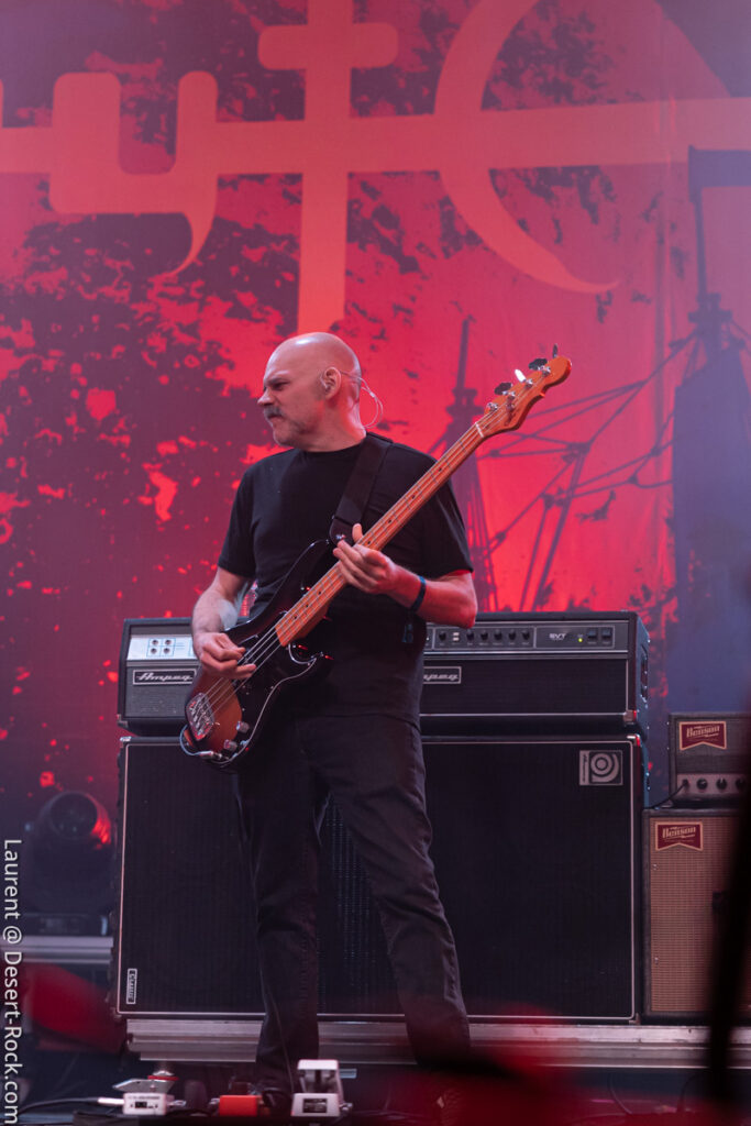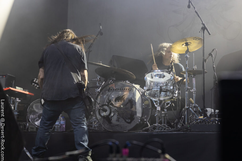 Un set hors norme attend le public qui ne le sait pas. Depuis la sortie de son excellent dernier album Night Parade Of One Hundred Demons, on est habitué à ce que le trio propose en live au moins l’un ou les deux morceaux-titres issus de ce dernier (part 1 & 2). C’est le cas aujourd’hui, et c’est un sacré signe de courage et de confiance dans la qualité de son dernier ouvrage : pour une première venue au Hellfest, et dans un format contraint et court, la tendance pour un groupe consiste généralement à caler un max de compos, et de proposer une sorte de best of. En proposant direct deux titres de 20 minutes et quelques chacun, Earthless pose ses attributs sur le billot et attend la sentence… et elle est immédiate : l’adhésion du public est directe, dès lors qu’Isaiah Mitchell lâche sa première décharge de leads fuzzés, à grands renforts de wah-wah de l’espace. Que l’on puisse bouder le groupe en studio cela s’entend (à peine), qu’on ne fasse pas corps avec lui en live c’est totalement impossible. Après avoir interprété la reprise « Stoned Out of your Mind » (de Speed, Glue & Shinki, une cover assez récurrente dans leurs set lists – on l’avait déjà entendue plusieurs fois), et vu qu’ils n’ont pas tergiversé et qu’il leur reste quatre à cinq minutes avant la fin de leur créneau, le groupe lui adjoint une salve complémentaire avec « Cherry Red » (une autre reprise, des Groundhogs). C’est toujours bon à prendre (sachant que plusieurs groupes au cours du week-end ont gâché de précieuses minutes restantes sur leur créneau), même si le trio n’a pas besoin de ça pour mettre tout le monde d’accord, des crash barrières jusqu’ à l’orée de la Warzone. La virtuosité de ce tiercé gagnant a fait mouche, les Hippies ont laissé tout le monde baba.