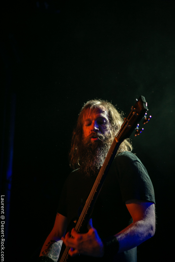 Dernier gros client de la journée, c’est au tour de High On Fire de faire crier les amplis. Après avoir été très déçus par les conditions du concert de Berlin (allez voir la chronique, mais pour résumer le son ne rendait pas service au groupe), on a vraiment voulu aller à cette date pour voir le groupe dans un autre contexte. Quel grand bien nous a pris ! L’intro fut la même, à savoir ce « Sons of Thunder » et son tonnerre de grosse caisse sur lit de gratte, qui fait bien le job en annonciateur de la tempête à venir. Et tempête il y eut, avec un déferlement en début qui ne laissera personne de marbre (« The Black Plot »/ « Carcosa » / « Fertile Green », rien que ça), et une suite de set en forme de best of de la carrière du trio. L’ambiance est certes plus pesante et sérieuse que pour Church of Misery (la musique est un peu moins « fun » d’une certaine manière), mais dans le pit, c’est la guerre dès les premiers accords. Le son est impeccable : puissant, juste assez gras et graisseux pour retranscrire l’effet bulldozer attendu, et juste assez clair pour sentir le poids respectif des riffs coup-de-poing de Matt Pike, ainsi que des rythmiques de Jeff Matz dès lors que Pike daigne nous gratifier d’un de ces soli perçants dont il a le secret. Bon, les vocaux de ce dernier manquent un peu de relief (toujours un peu le même style hein, dans un champ tonal qui éveille des parfums de bitume chaud, de tessons de bouteille et de houblon un peu frelaté, le tout en mode beuglage…) mais pas de mauvaise surprise pour les aficionados en tous les cas.