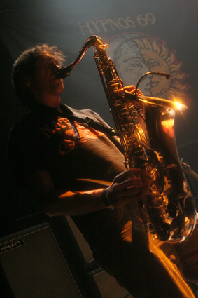 Il est très difficile pour moi de définir notre musique car lorsque nous jouons ensemble, cette musique est le résultat de nos quatre personnalités, nous ne nous disons jamais « faisons un truc dans ce style-ci ou dans ce style-là », nous commençons à jouer et ce qui en sort est une combinaison de nos états d’esprit à ce moment-là. Il n’y a pas vraiment de leader, en tout cas musicalement, chacun vient avec ses idées et apporte sa touche. Steven, le saxophoniste, a par exemple une approche plus jazzy tandis que Dave ajoute ce groove heavy à la Bonham et c’est ce mélange qui donne le son d’Hypnos 69.