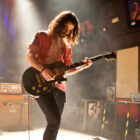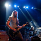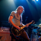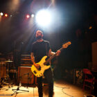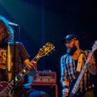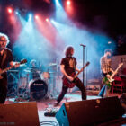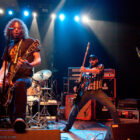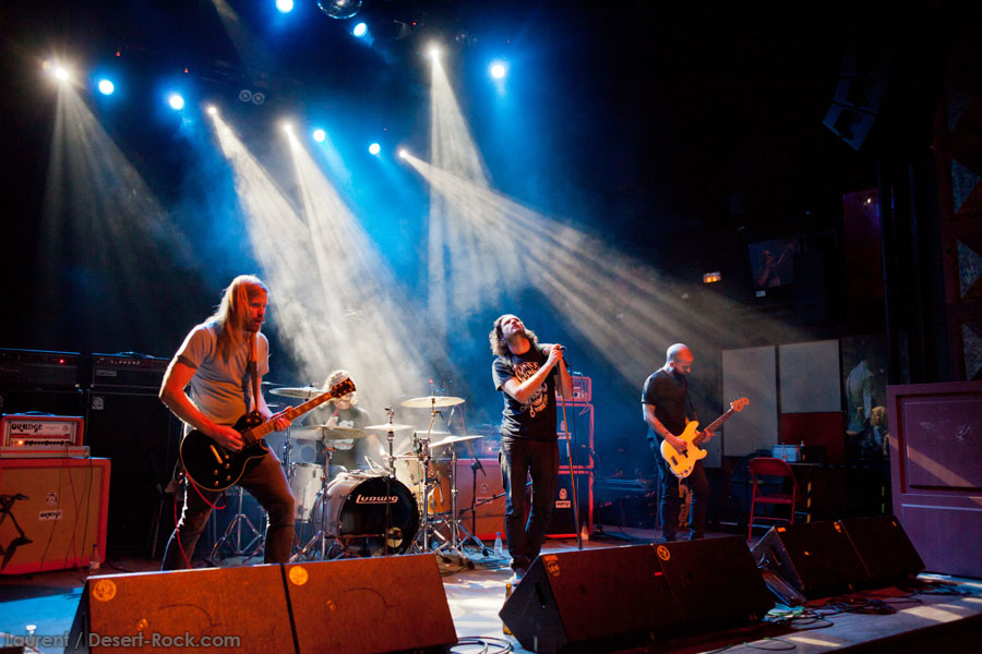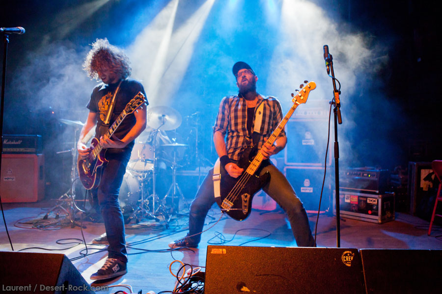 L’ingé son a un sens de l’humour bien particulier, n’hésitant pas à balancer du QOTSA pendant le court quart d’heure qui suffira à STEAK pour investir la scène et faire son line-check rapido-presto. Un peu trop rapido peut-être, étant donné que le quatuor briton bataille pendant les deux premiers titres pour ajuster ses retours et qu’en salle le son n’est pas encore au top. Mais les choses rentrent vite dans le rang, et la salle, désormais quasi pleine, commence à voir apparaître la cohérence musicale de cette belle affiche : clairement, Steak ce soir représente le chaînon manquant entre le stoner rock « européen » (un petit peu « à la scandinave », quoi) et le desert rock U.S. le plus aride. Scéniquement, les zicos sont quand même assez introspectifs, surtout la section rythmique, qui illustre complètement le concept de flegme britannique. Reece Tee abat un boulot sur ses parties de guitare qui le dispensent de facto de faire le mariole sur scène : ses rythmiques tranchantes n’ont d’égales que ses soli percutants. Kippa, le chanteur capilairement approximatif ce soir (il est assez rare en y réfléchissant de trouver des vocalistes dédiés parmi les groupes que nous affectionnons, cette tâche revenant souvent au gratteux le moins mauvais, voire, pire, à un bassiste…), assure lui aussi son rôle de frontman, malheureusement sans trop communiquer avec le public, évoluant étrangement sur scène (voir ce titre joué devant les retours, côté public mais… dos au public !), le plus souvent les yeux fermés. Côté compos, les titres sont longs et sinueux, et pour ma part je retiendrai dans ce schéma le toujours somptueux « Liquid Gold ». Le public est bien dedans, mais toujours dans cet « entre-deux » un peu étrange que génère la musique de Steak sur scène : on n’est jamais dans un ennui profond, mais jamais non plus dans la folie qu’on les croit toujours capable de générer. Toujours ce satané groupe qui ne parvient pas à transformer l’essai (scéniquement ou sur album – voir leur dernier album, très bon mais toujours pas excellent), alors qu’on est tous persuadés de leur talent. On reste patient en attendant l’explosion, mais va pas falloir qu’ils nous fassent végéter longtemps non plus… Plus étonnant que pour Komatsu, c’est seulement 35 minutes qui sont allouées aux anglais, qui auraient sans doute, eux, tiré profit d’un petit rab d’un ou deux titres…