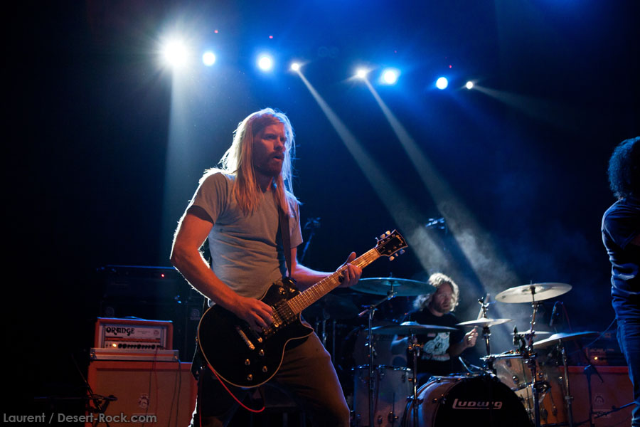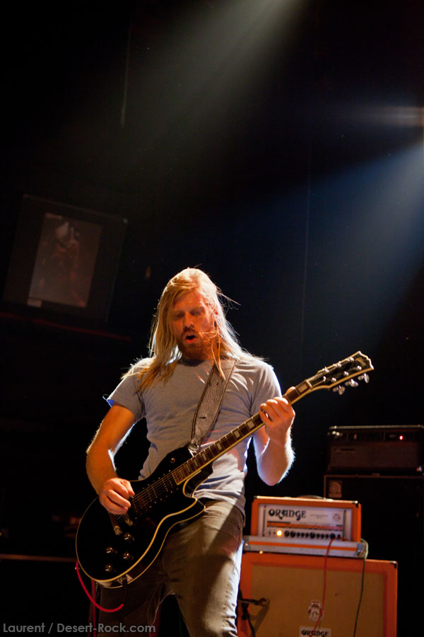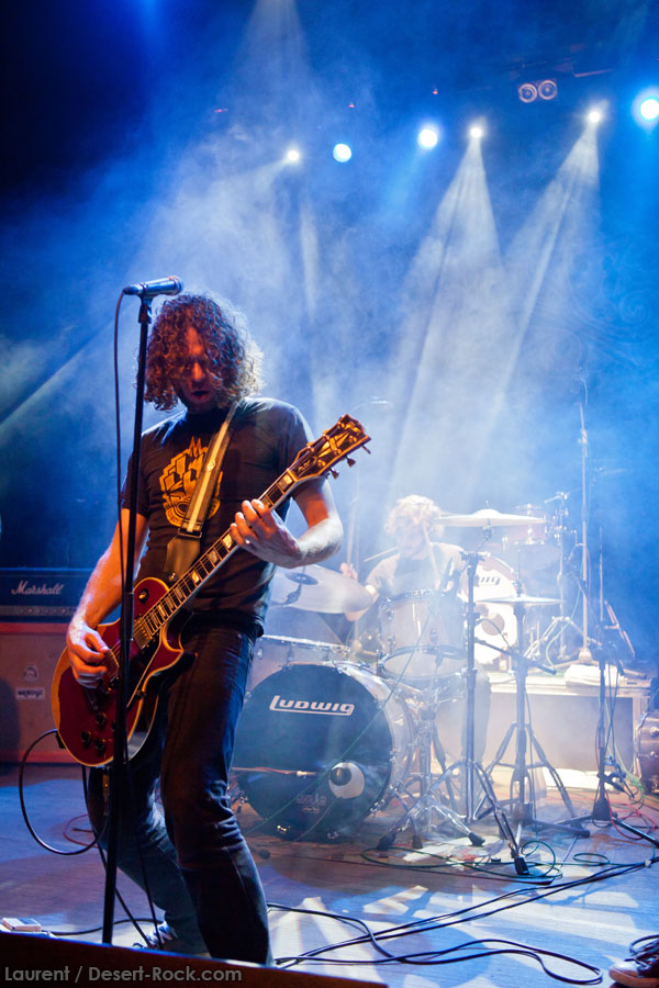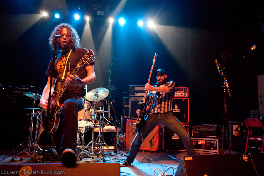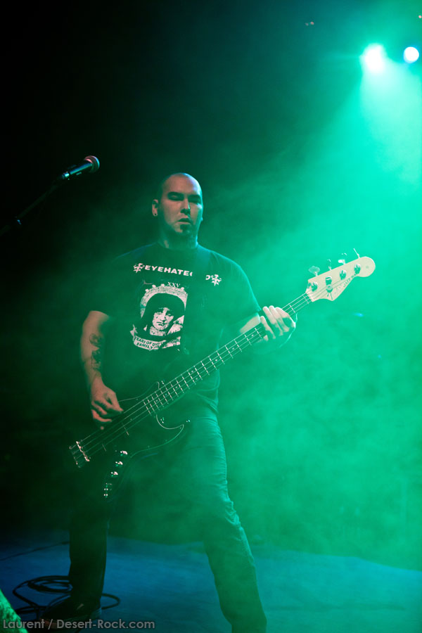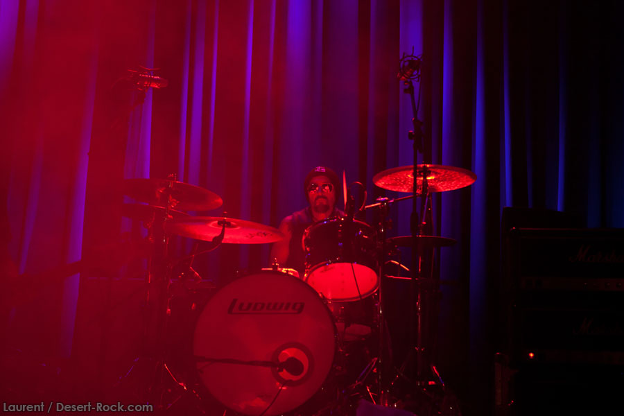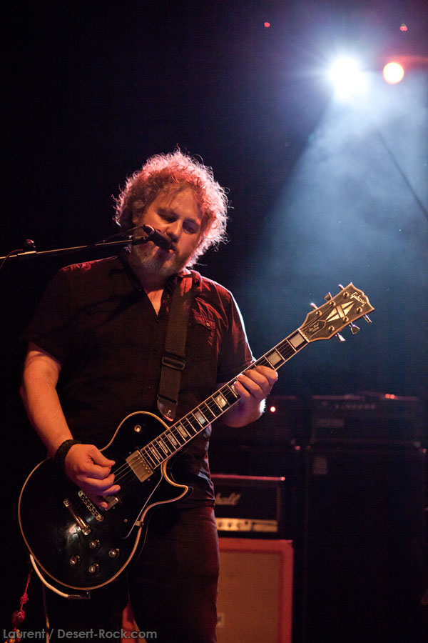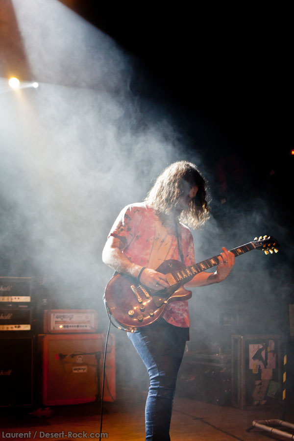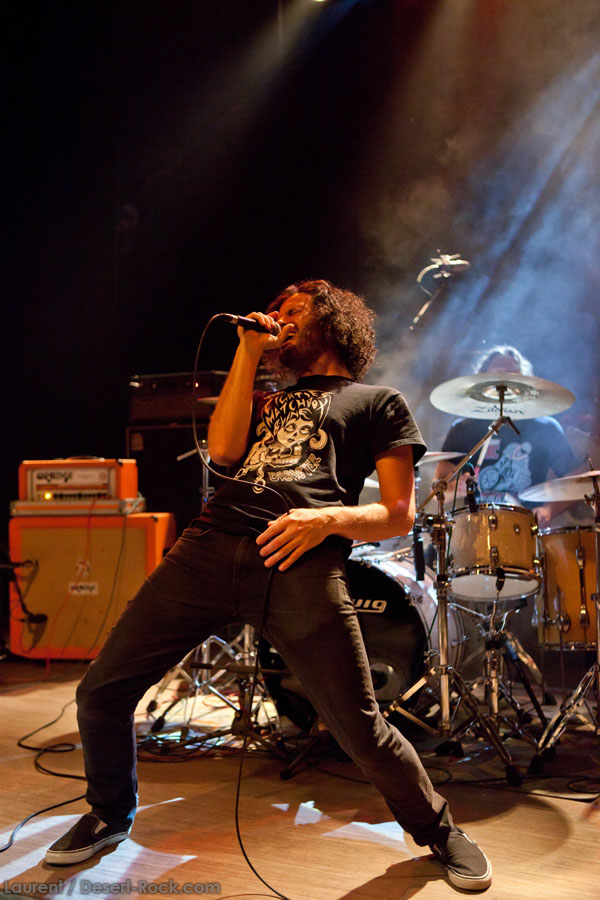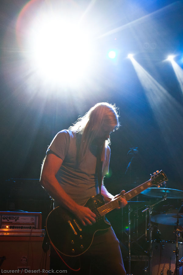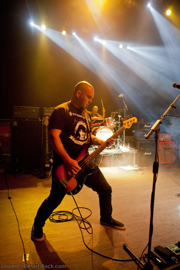 Aux deux tiers du set environ, Garcia s’éclipse pour mieux mettre en lumière ses trois compères, qui s’illustrent alors sur un titre instrumental bien charpenté (clairement pas improvisé : un titre bien carré, efficace, à l’image de ce qu’auraient pu composer les Karma To Burn de leur vivant, en plus répétitif peut-être). Faut dire que nos lascars n’avaient jusqu’ici pas vraiment marqué le public : même si impeccables musicalement, on ne peut pas dire qu’on ait été jusque là étouffés par la densité scénique du trio, exception faire de Greg Saenz, un tueur à la batterie. Mike Pygmie fait le taf et évolue sur ses 2 mètres carrés de scène avec sa mine renfrognée et en regardant aléatoirement ses baskets, son manche de basse, ou le fond de la scène. Le bât blesse un peu plus face au guitariste Ehren Groban, guitariste très doué par ailleurs, mais doté du charisme d’une crêpe au sucre. Il n’y a que quand il lève le pied pour appuyer sur une pédale d’effet qu’on est sûr qu’il ne s’est pas endormi sur son manche, objet de toute sa concentration… Heureusement son t-shirt « tie dye » importé en droite ligne des pires heures des eighties nous pique assez les yeux pour ne pas nous endormir quand on lui adresse un regard…