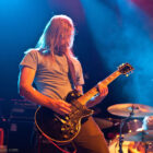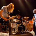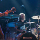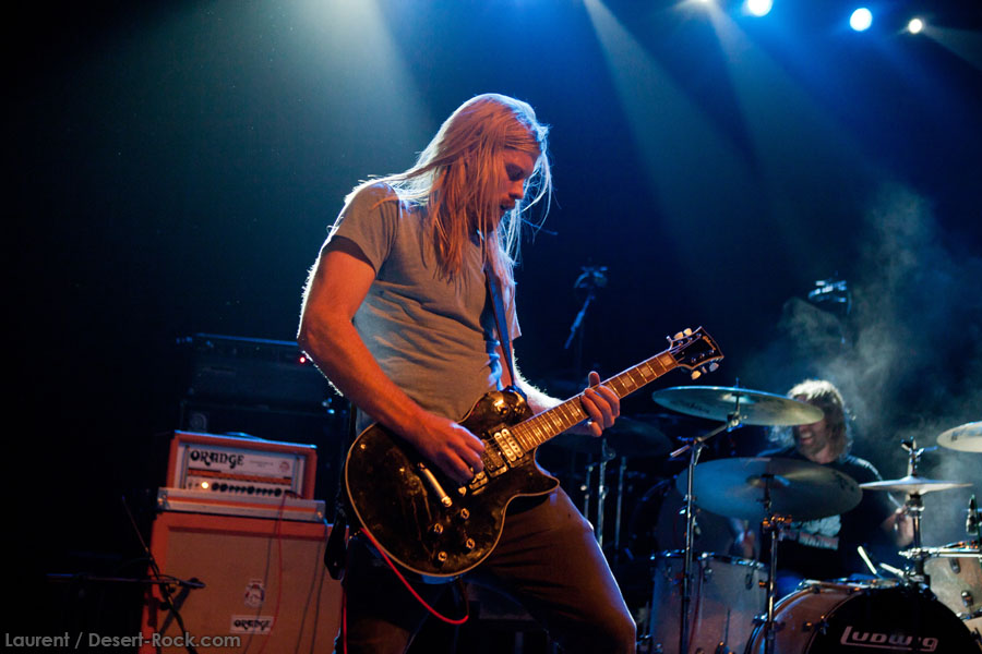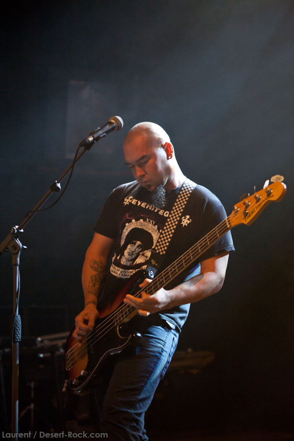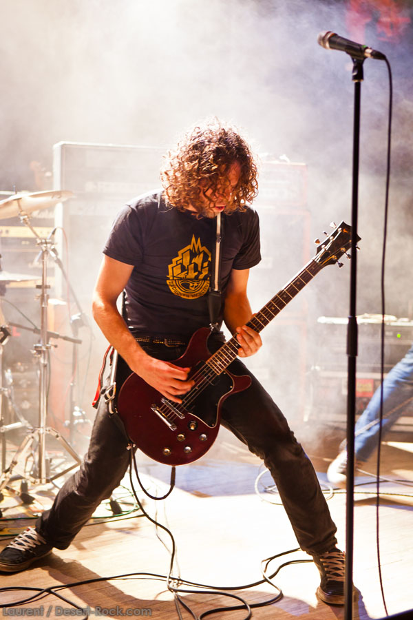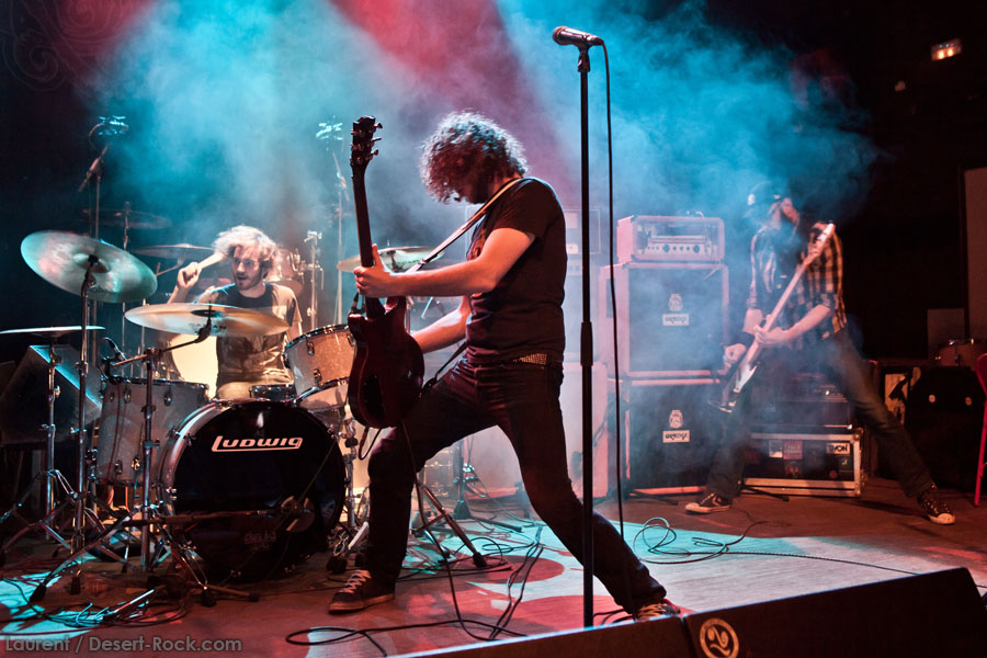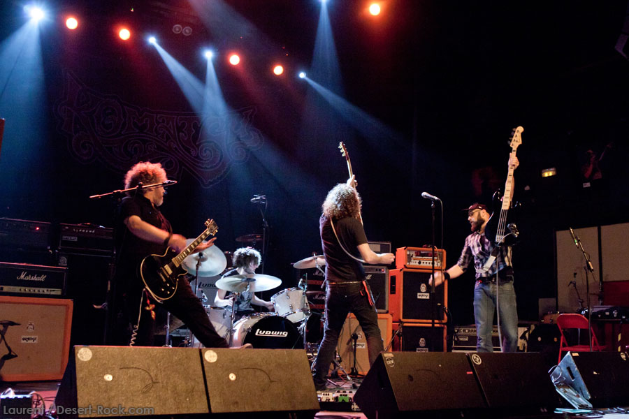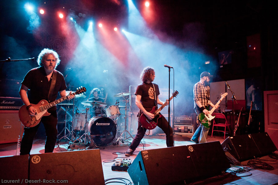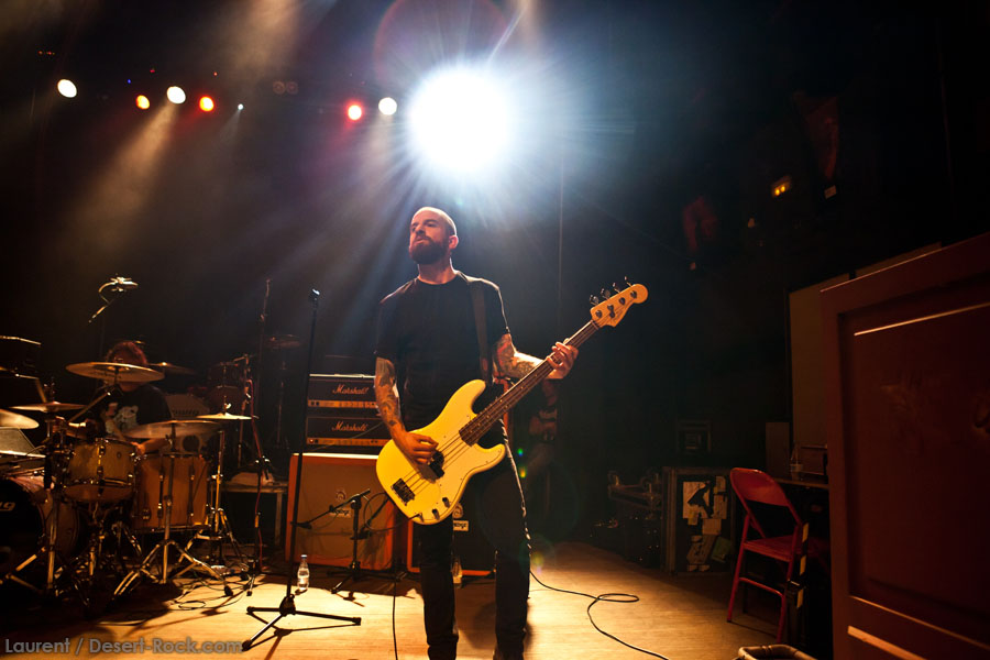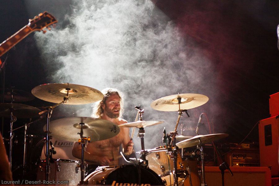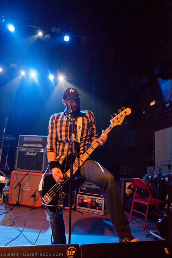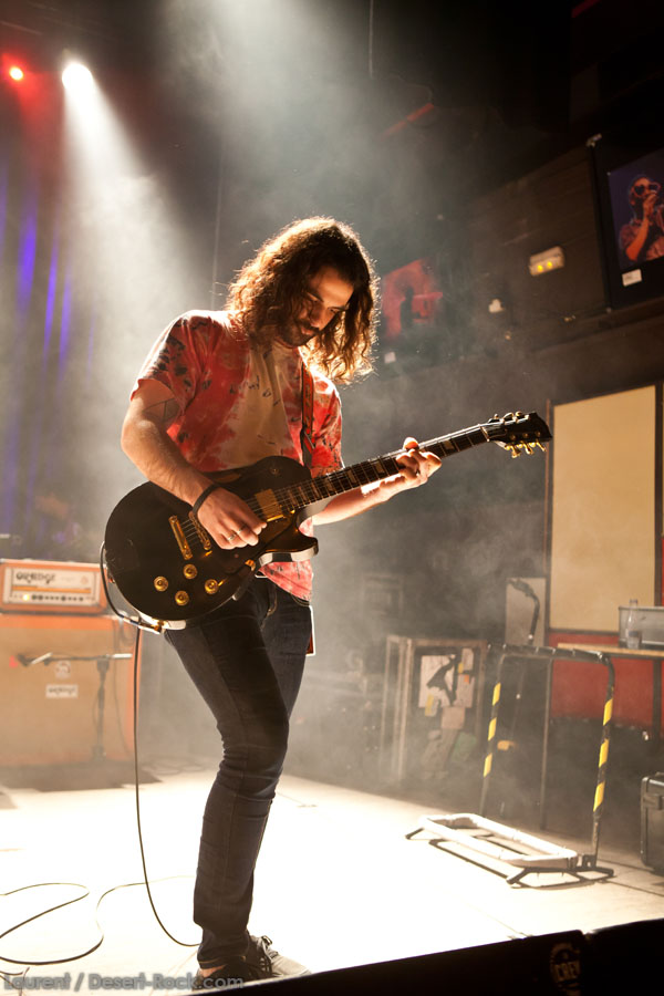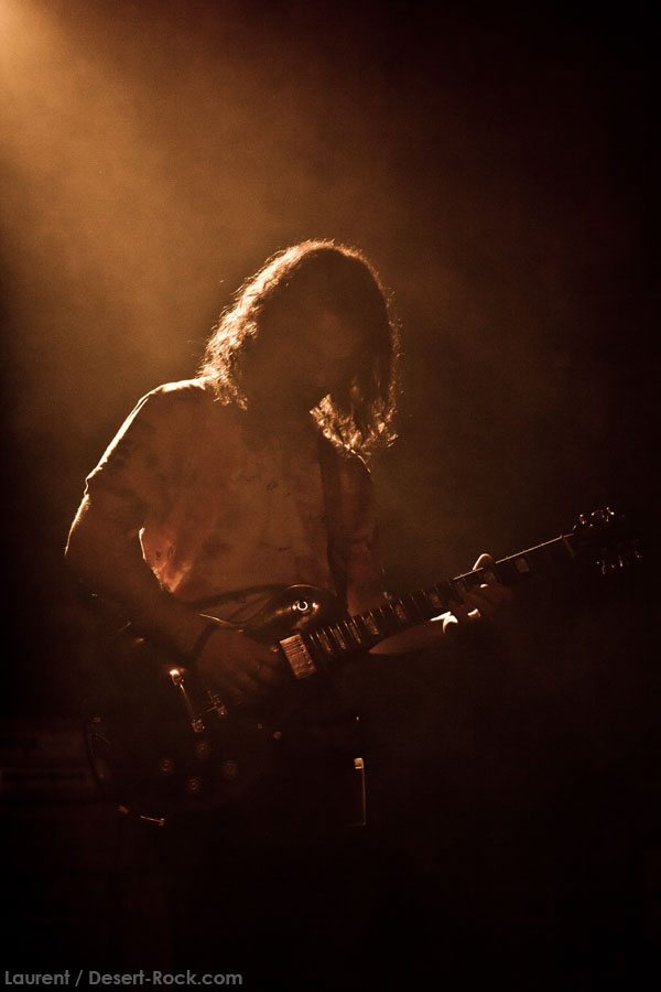Aux deux tiers du set environ, Garcia s’éclipse pour mieux mettre en lumière ses trois compères, qui s’illustrent alors sur un titre instrumental bien charpenté (clairement pas improvisé : un titre bien carré, efficace, à l’image de ce qu’auraient pu composer les Karma To Burn de leur vivant, en plus répétitif peut-être). Faut dire que nos lascars n’avaient jusqu’ici pas vraiment marqué le public : même si impeccables musicalement, on ne peut pas dire qu’on ait été jusque là étouffés par la densité scénique du trio, exception faire de Greg Saenz, un tueur à la batterie. Mike Pygmie fait le taf et évolue sur ses 2 mètres carrés de scène avec sa mine renfrognée et en regardant aléatoirement ses baskets, son manche de basse, ou le fond de la scène. Le bât blesse un peu plus face au guitariste Ehren Groban, guitariste très doué par ailleurs, mais doté du charisme d’une crêpe au sucre. Il n’y a que quand il lève le pied pour appuyer sur une pédale d’effet qu’on est sûr qu’il ne s’est pas endormi sur son manche, objet de toute sa concentration… Heureusement son t-shirt « tie dye » importé en droite ligne des pires heures des eighties nous pique assez les yeux pour ne pas nous endormir quand on lui adresse un regard…