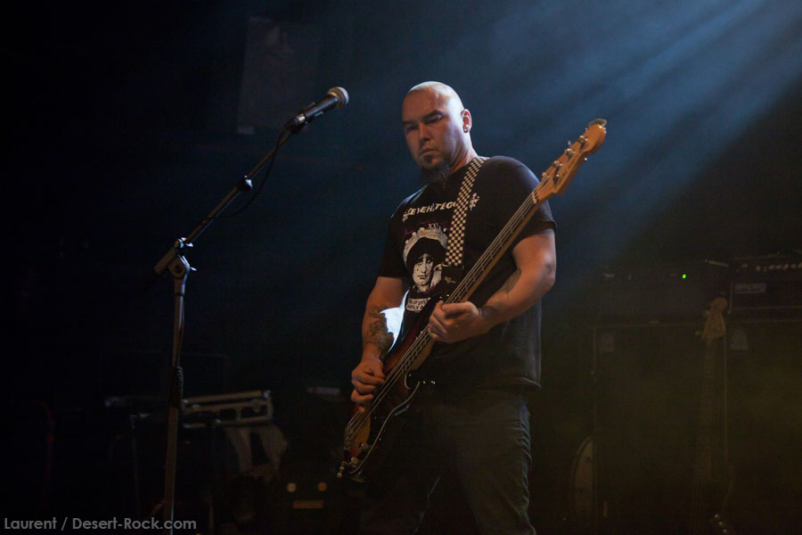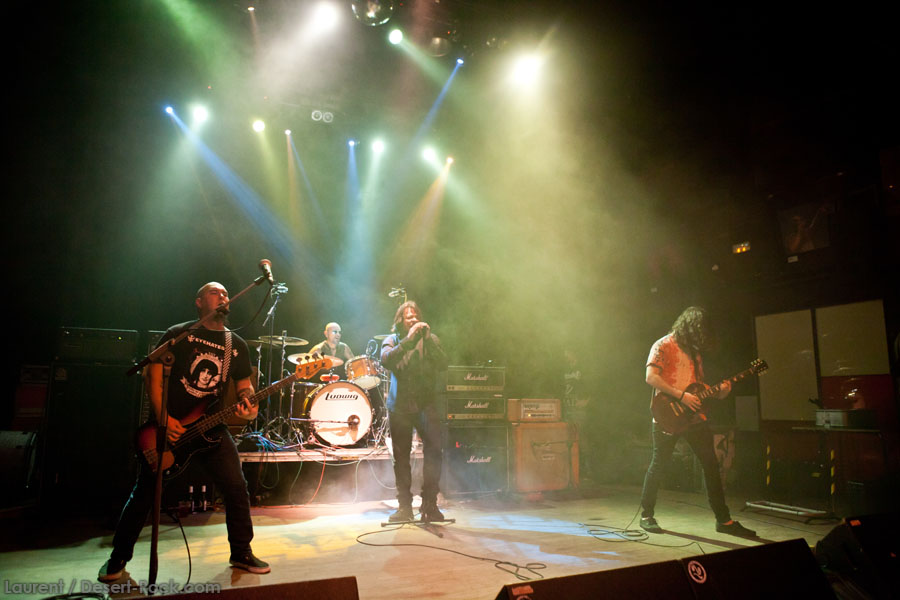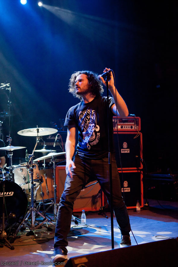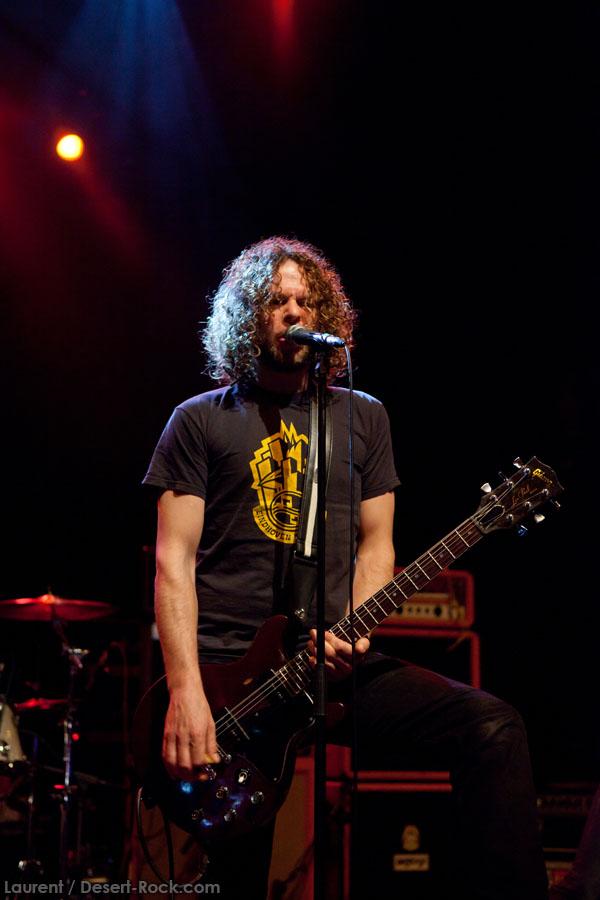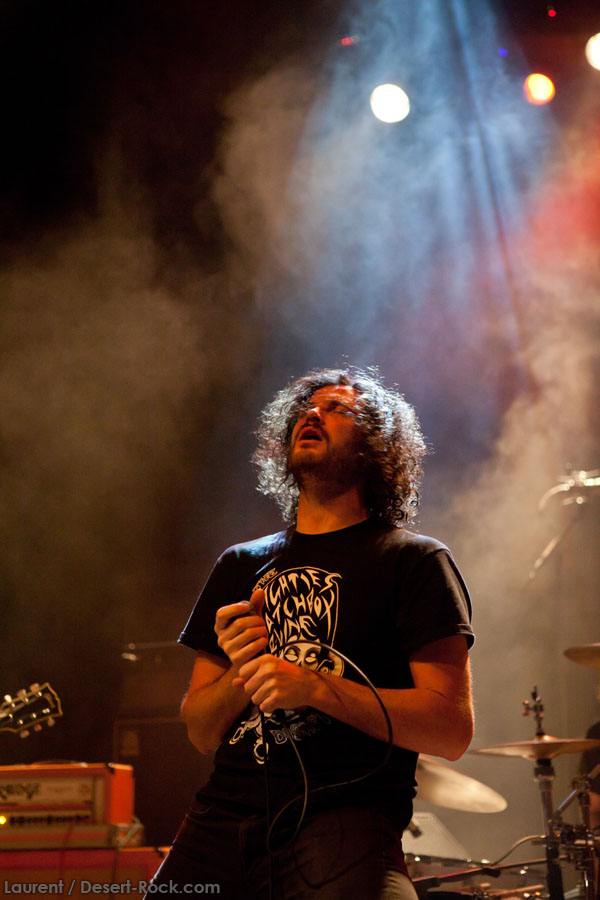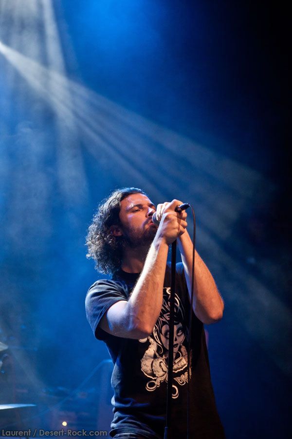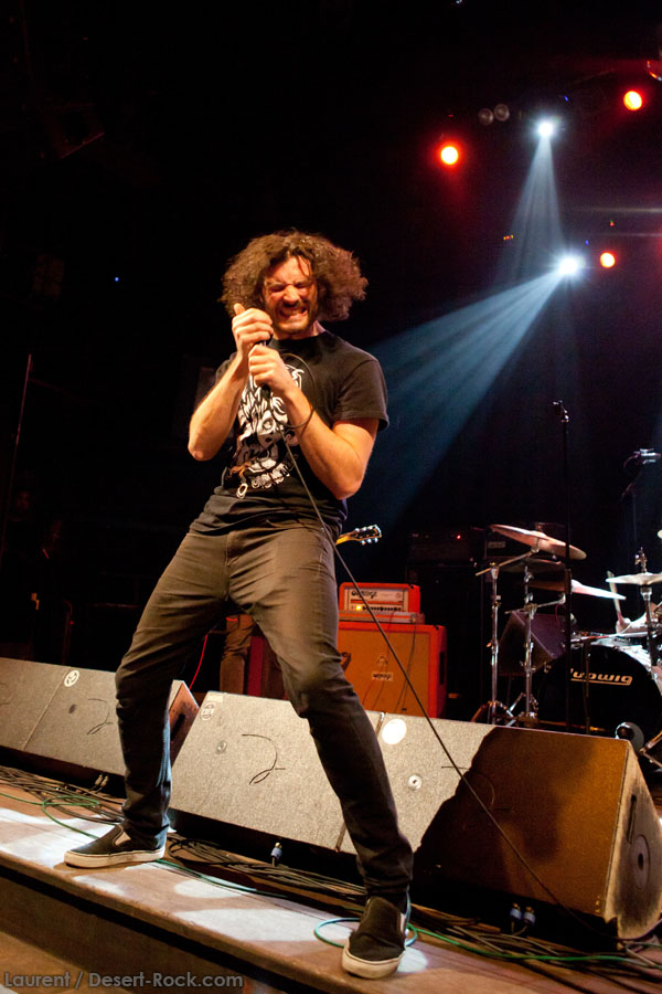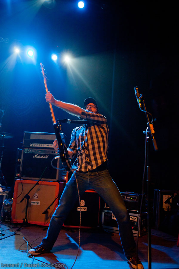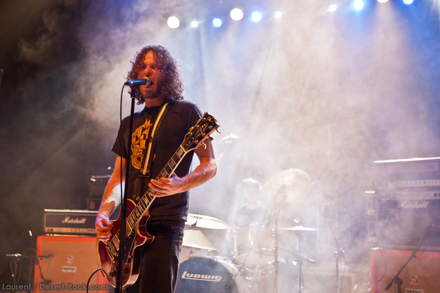 Mais le public s’en fiche, au final il est venu pour Garcia, et il a ce qu’il voulait, même si une set list plus orientée « Kyuss » aurait forcément plus cartonné. Une doublette Slo-Burn plutôt maline pointe le bout du nez vers la fin du set, avec « July » (qui tombe un peu à plat devant un public finalement pas si averti que ça) enchaîné avec la version « Garcia » de « Cactus Jumper » (« All these walls »). Et là, constat effarant (qui ne nous avait pas marqué jusqu’ici), Dieu ouvre la bouche à destination de ses apôtres ! Et oui, il aura fallu attendre une grosse heure de set, une petite quinzaine de chansons, pour que Monsieur Garcia s’enquérisse de l’humeur de son public en lui adressant la parole pour la première fois de la soirée ! Alors qu’il engage un « Supa Scoopa… » des familles, on se dit que les planètes sont alignées et que l’explosion attendue est imminente. Et… fini ! Le groupe quitte la scène… Un petit moment de doute passe avant de voir le public revenir pour ce qu’on imagine un baroud d’honneur en bonne et due forme, sentiment confirmé par le choix d’un « Green Machine » qui fait de sérieux dégâts dans un pit devenu incandescent. Pouvant se reposer sur des braises ardentes, c’est le moment que choisit le groupe pour… quitter à nouveau la scène, sans rappel cette fois ! Toujours pas de « Whitewater », prévu sur la set list quasiment chaque soir…