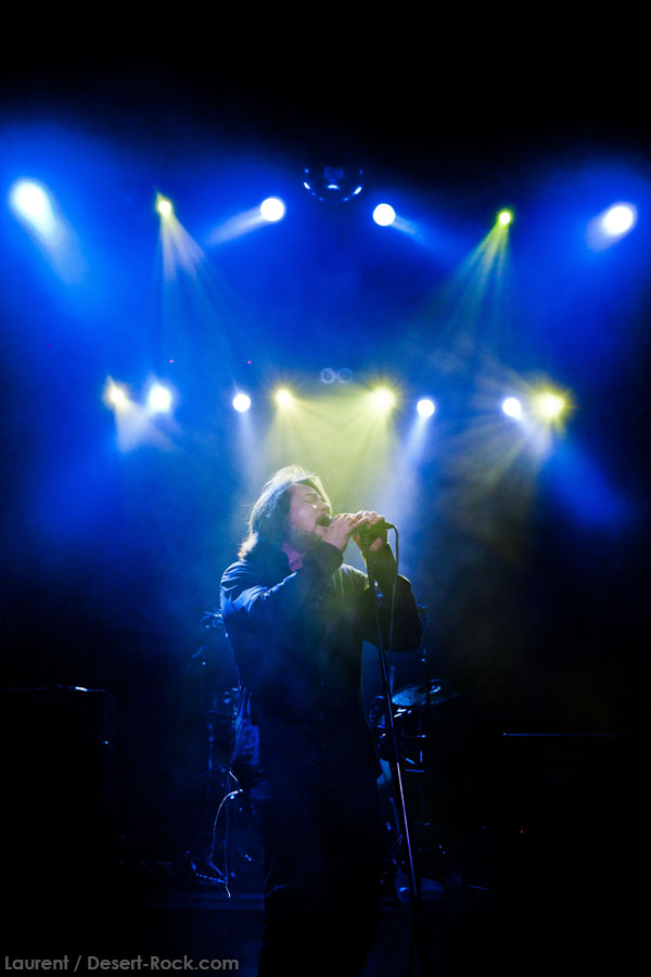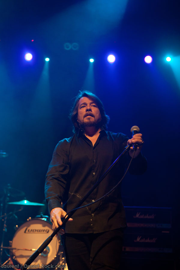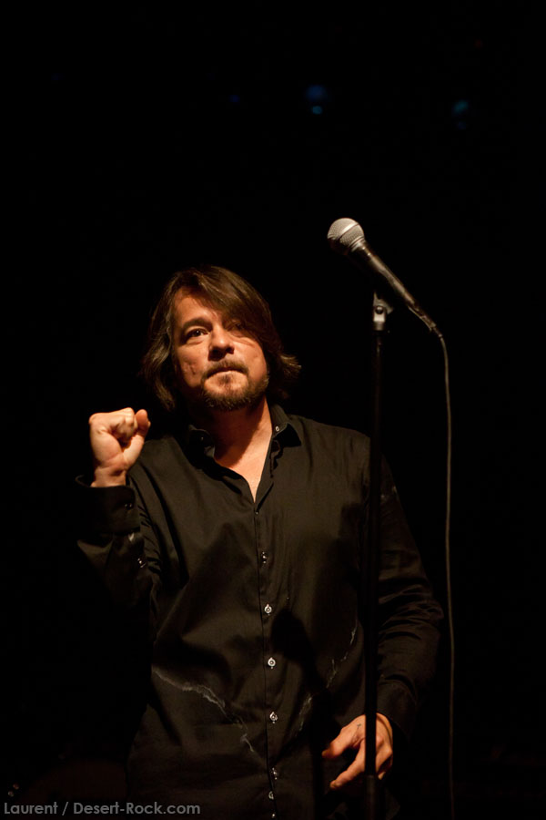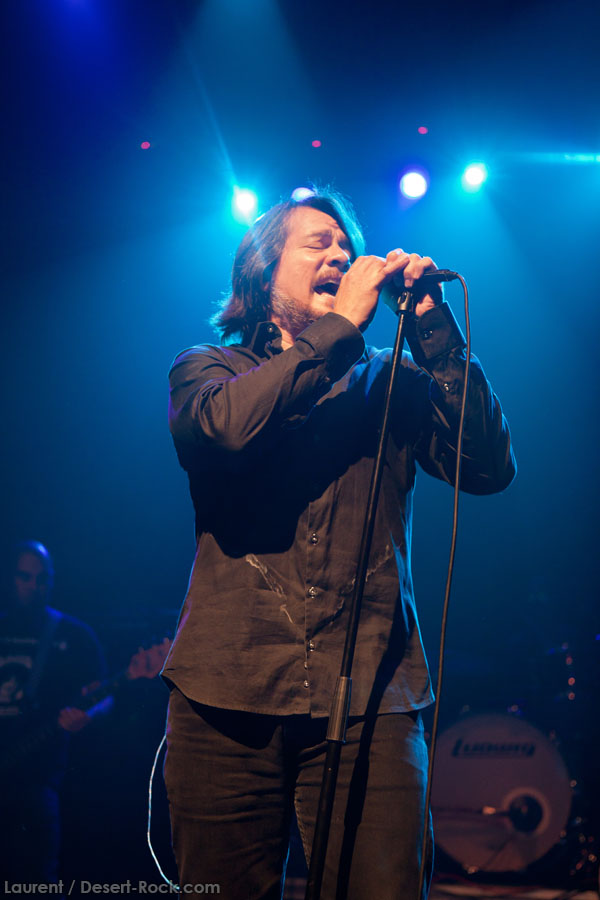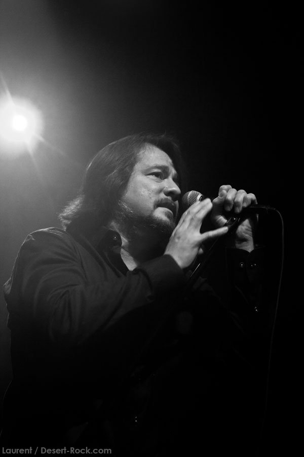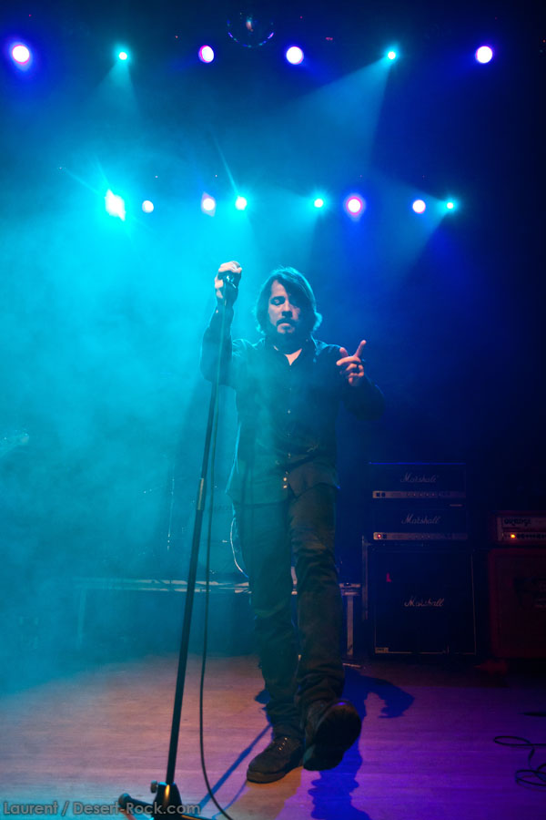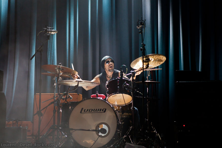 C’est sur un instru vaguement dérivé du pourtant attendu « Caterpillar March » que le trio instrumental du backing band de JOHN GARCIA entame son set. Et c’est sur le groovy « Rolling Stoned » que le desert messiah rejoint le trinôme. Le gaillard est en forme, bien plus que sur certaines de ses récentes interventions Vista Chino-iennes notamment : déhanchements et manipulations de pieds de micros caractéristiques, sourires occasionnels… Il revit ! Alors qu’il glisse très rapidement un « One Inch Man » dans la set list (carton assuré dès l’intro), c’est quand même sur son catalogue propre qu’il forge son set, le constat ne souffre d’aucune contestation. « My Mind », « The blvd », « Flower »… Et les autres ! Au final, seuls deux ou trois extraits de sa galette solo ne seront pas jouées ce soir. D’un autre côté, difficile de lui en vouloir, on sait les titres pas mauvais, et par ailleurs, force est de constater qu’ils passent haut la main l’épreuve du live. Mention spéciale à « 5000 Miles » qui fonctionne particulièrement bien. En revanche, les vrais pics d’effervescence du public (qui désormais blinde la grande salle) sont atteints sur les différentes occurrences Kyussiennes, ne nous leurrons pas. Le chanteur se livre par ailleurs à une revue très particulière de la carrière de Kyuss, avec de gros focus sur « Blues… » et sur « … Circus »… (c’est râlant de voir ainsi presque zappé « Sky Valley », uniquement représenté par le modeste « Supa Scoopa and Mighty Scoop »).