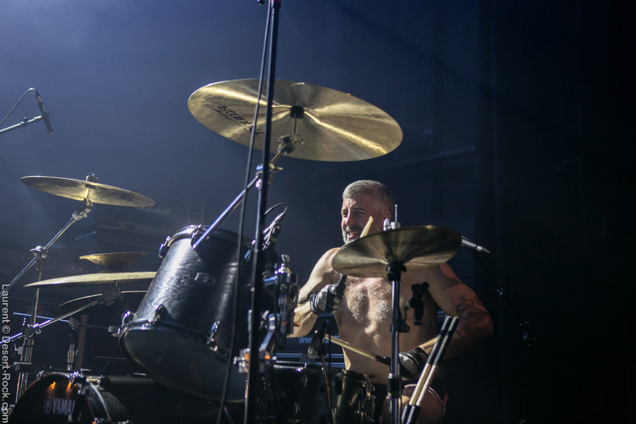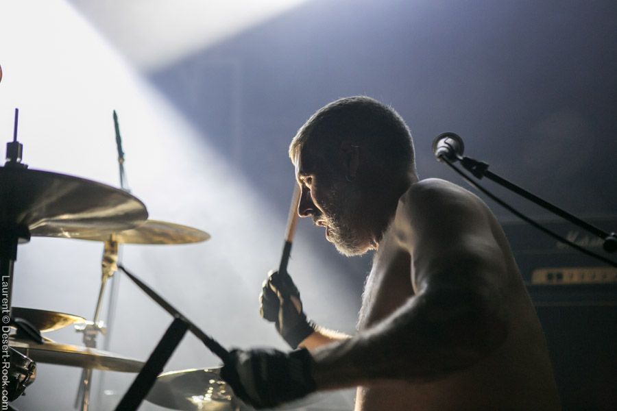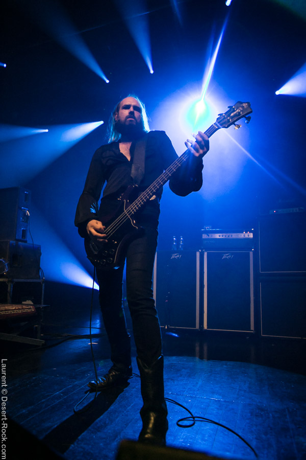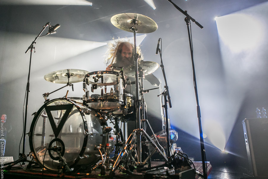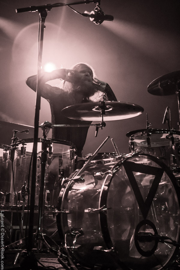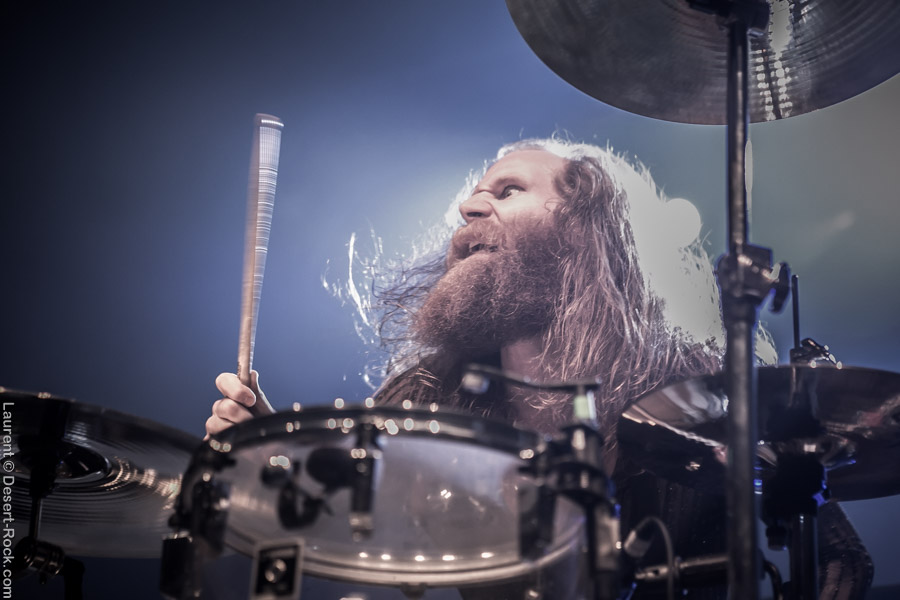 Clairement, c’est Kadavar qui a rameuté le monde ce soir, et il suffit que le groupe dégaine les premiers accords du pourtant moyen « Rough Times » pour susciter sourires et premiers hochements de têtes dans le public. Le son est énorme, clair, massif, aux petits oignons. Et scéniquement, le groupe a encore fait un pas vers la maîtrise absolue : on peut louvoyer comme on veut, on peut, derrière la meute, crier à qui veut l’entendre que les derniers albums sont mauvais, ce qu’on veut. Mais il est un terrain sur lequel il serait malhonnête de faire preuve de la même mauvaise foi : sur scène, le groupe est impérial. Lupus est toujours impeccable : même si pas démonstratif pour un sou (un comble pour un frontman), statique qu’il est derrière son muret de retours, il enquille les soli avec une virtuosité remarquable, et son chant puissant et juste fait mouche. Sur le côté, le français Simon « Dragon », anciennement plutôt introverti, est déchaîné, martelant sa basse avec une vigueur inédite, bien aidé en cela par une mise en son royale, ronde et claire, rendant honneur à son jeu, trop souvent sous-estimé. Mais le maître de la soirée est clairement – qui l’eut cru – Tiger : le filiforme batteur, posté devant au ras du bord de scène, monté sur piédestal, haut perché sur son tabouret fait bien plus que le job. Le barbu chevelu développe un jeu particulièrement visuel (avec un kit transparent, effet garanti), grimace, toise le public, sourit… Expressif jusqu’à l’outrance, il focalise tous les regards, et il se trouve que le gaillard est solide techniquement, donc on serait bien en peine de le critiquer sur son comportement.