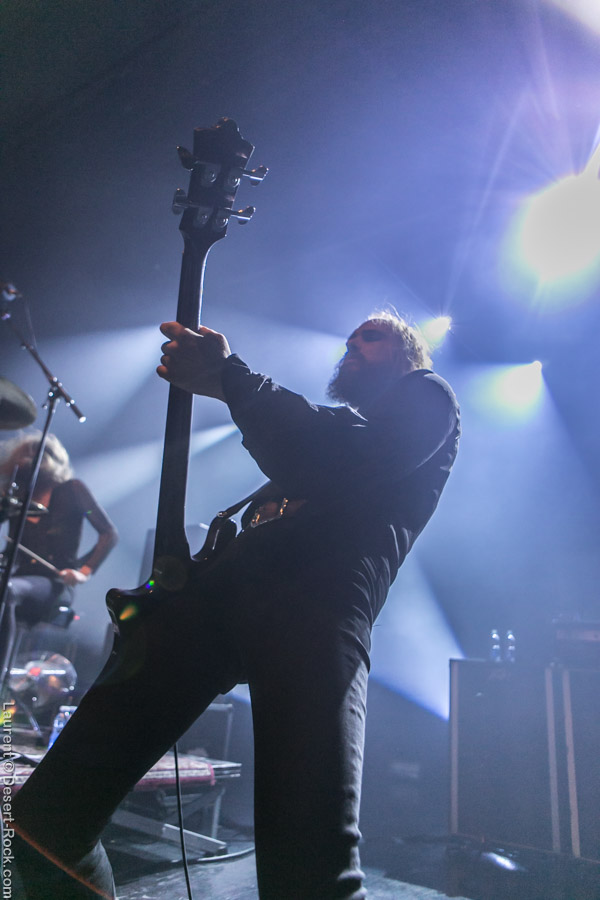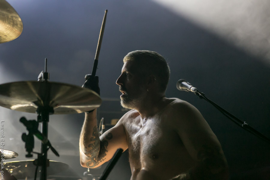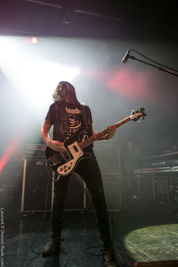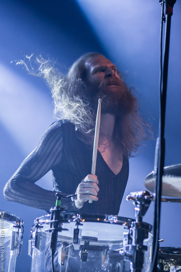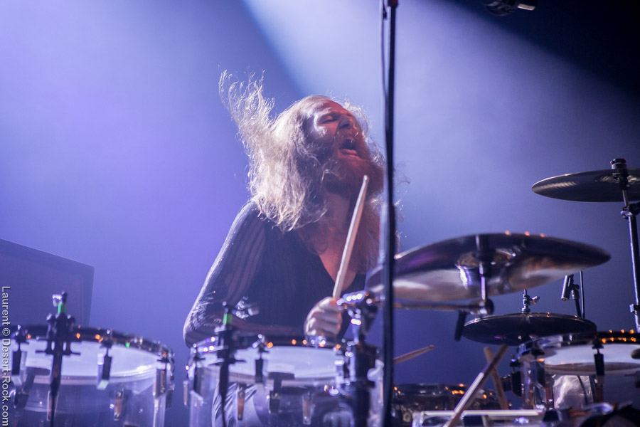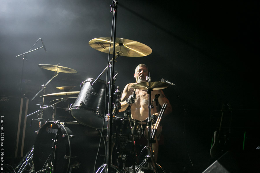 Clairement, c’est Kadavar qui a rameuté le monde ce soir, et il suffit que le groupe dégaine les premiers accords du pourtant moyen « Rough Times » pour susciter sourires et premiers hochements de têtes dans le public. Le son est énorme, clair, massif, aux petits oignons. Et scéniquement, le groupe a encore fait un pas vers la maîtrise absolue : on peut louvoyer comme on veut, on peut, derrière la meute, crier à qui veut l’entendre que les derniers albums sont mauvais, ce qu’on veut. Mais il est un terrain sur lequel il serait malhonnête de faire preuve de la même mauvaise foi : sur scène, le groupe est impérial. Lupus est toujours impeccable : même si pas démonstratif pour un sou (un comble pour un frontman), statique qu’il est derrière son muret de retours, il enquille les soli avec une virtuosité remarquable, et son chant puissant et juste fait mouche. Sur le côté, le français Simon « Dragon », anciennement plutôt introverti, est déchaîné, martelant sa basse avec une vigueur inédite, bien aidé en cela par une mise en son royale, ronde et claire, rendant honneur à son jeu, trop souvent sous-estimé. Mais le maître de la soirée est clairement – qui l’eut cru – Tiger : le filiforme batteur, posté devant au ras du bord de scène, monté sur piédestal, haut perché sur son tabouret fait bien plus que le job. Le barbu chevelu développe un jeu particulièrement visuel (avec un kit transparent, effet garanti), grimace, toise le public, sourit… Expressif jusqu’à l’outrance, il focalise tous les regards, et il se trouve que le gaillard est solide techniquement, donc on serait bien en peine de le critiquer sur son comportement.