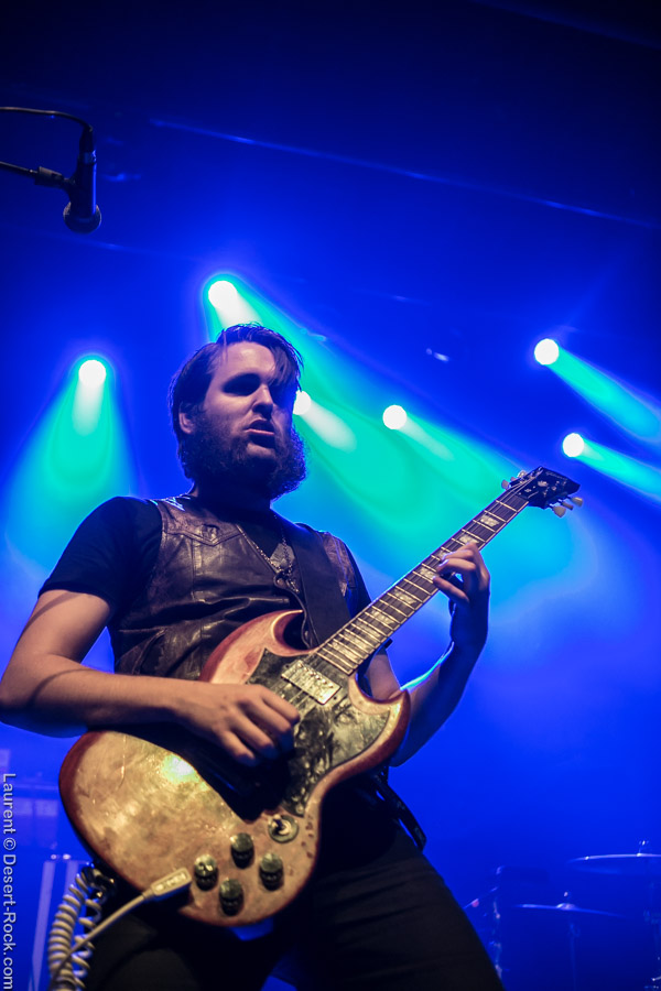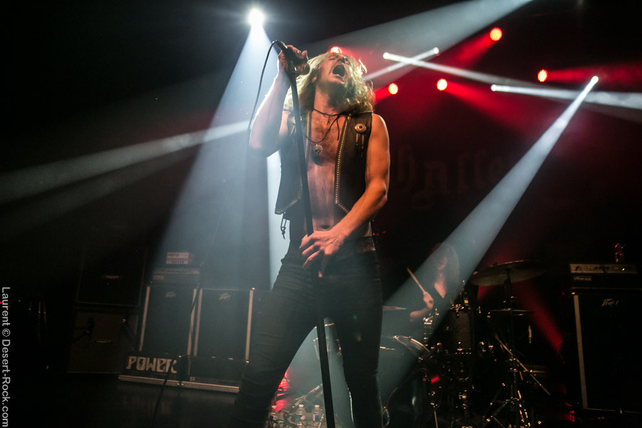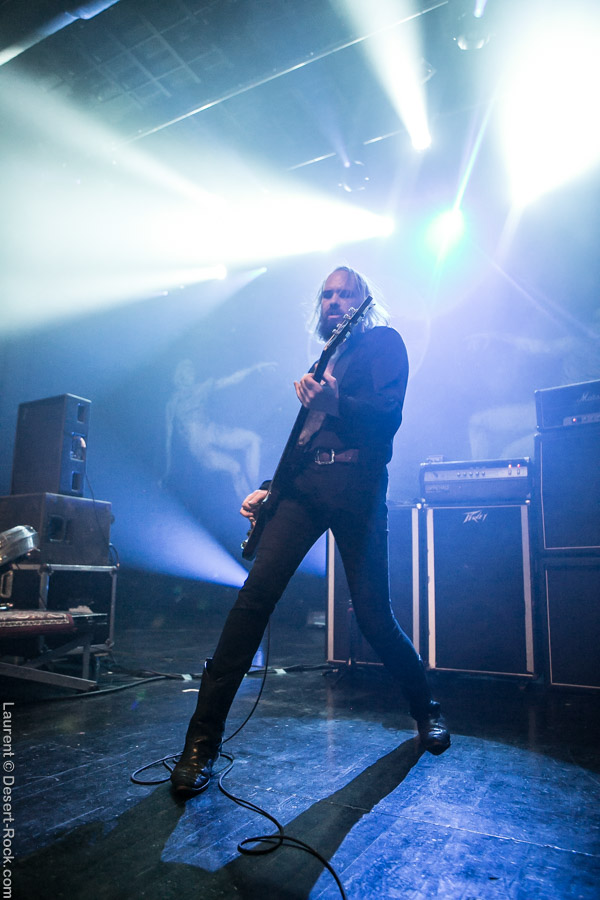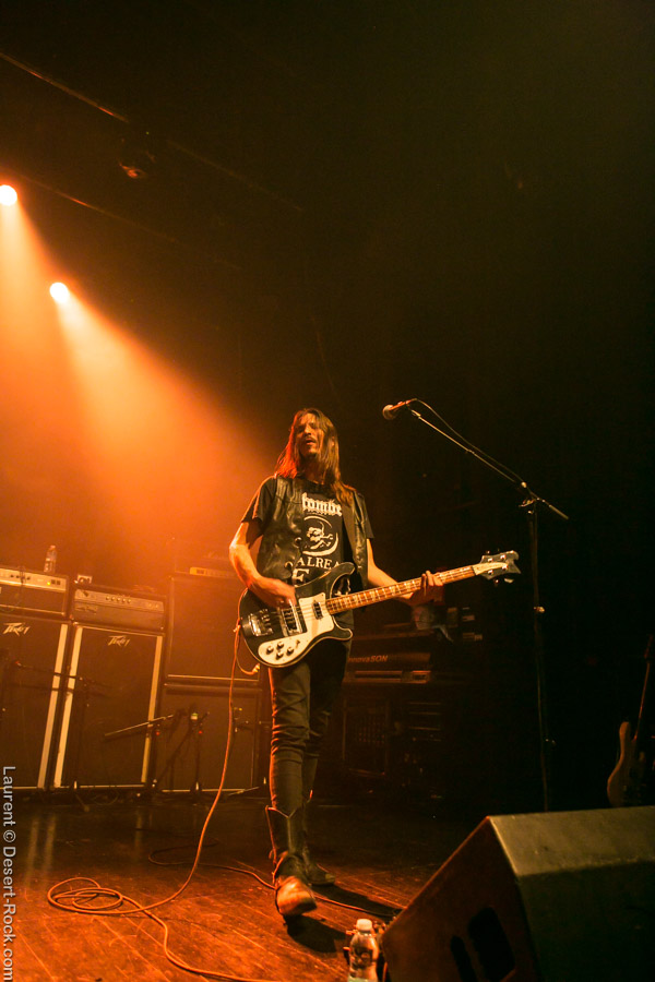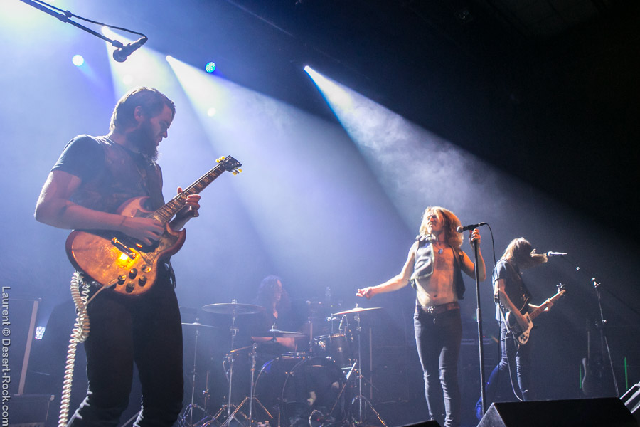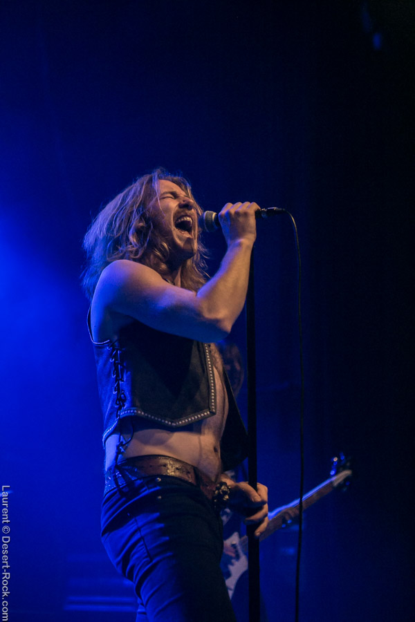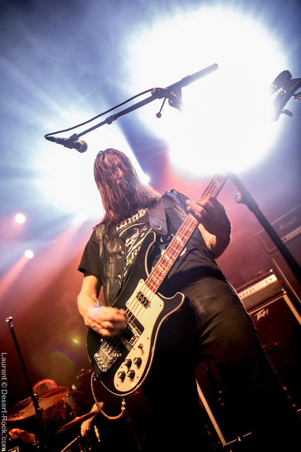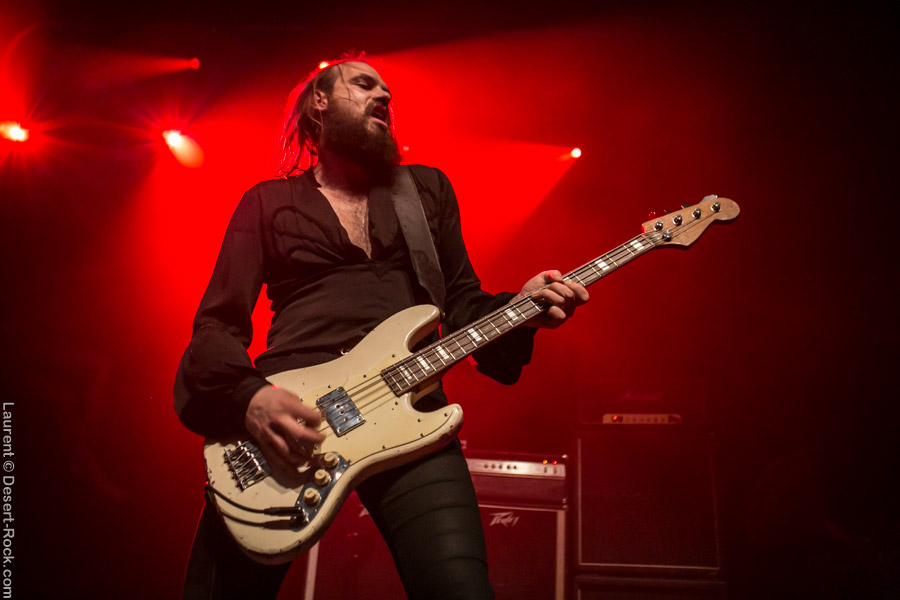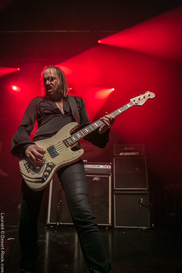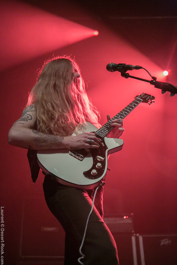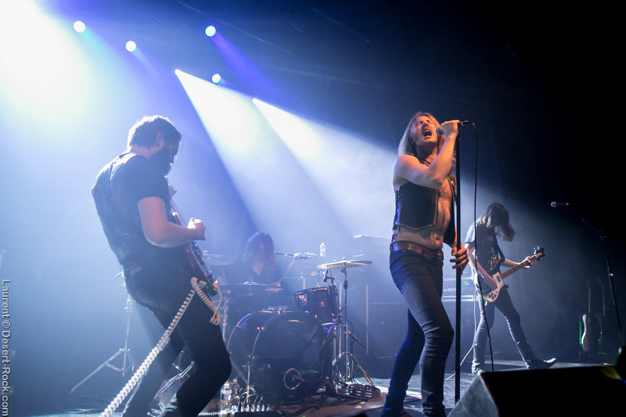 On n’est donc logiquement pas seuls au Krakatoa ce soir : la salle de l’agglomération bordelaise ne fait pas complètement le plein, mais son remplissage est loin d’être ridicule. Lorsque le set de Death Alley commence, la première partie de cette tournée, déjà quelques centaines de personnes se rassemblent devant la scène pour assister au set des bataves. Scéniquement, Death Alley c’est un peu l’assurance tous risques : même si l’on n’est pas fan du genre musical pratiqué par nos quatre lascars (oui, c’est encore du hard rock vintage 70’s, version amphétaminée cependant), force est de constater que sur scène les compos prennent une toute autre dimension, grâce à l’énergie déployée. C’est clairement Douwe Truijens, frontman emblématique du groupe, qui attire tous les regards et génère bonne humeur et dynamisme à l’ensemble : le chanteur, véritable cliché sur pattes (longs cheveux blonds, veste à franges sans manche sur torse nu, grosse moustache…), mène le jeu de scène et incarne le groupe, arpentant la scène de long en large, dansant, le tout avec un sourire ultra-brite et surtout un chant impeccable, juste et puissant ! Derrière, ça joue solide, et en particulier le MVP de l’ombre, Oeds Beydals : l’ancien guitariste des cultes The Devil’s Blood se fait plaisir, dégaine des sons de guitare venus de nulle part et crache les soli par pack de 12. Le groupe termine son généreux set par l’épique « Supernatural Predator », qui démontre au moins deux choses : le talent des zicos déjà (qui s’y entendent impeccablement pour animer ce gros morceau retors qui repose sur une apothéose instrumentale / jam space rock), mais aussi le potentiel du groupe à se frotter à d’autres genres musicaux « annexes » (et donc un potentiel d’évolution que d’autres n’ont pas forcément). Espérons que le groupe parvienne à solidifier son line up et enfin décoller sur la scène européenne, après quelques années ponctuées par des ratés et faux démarrages.