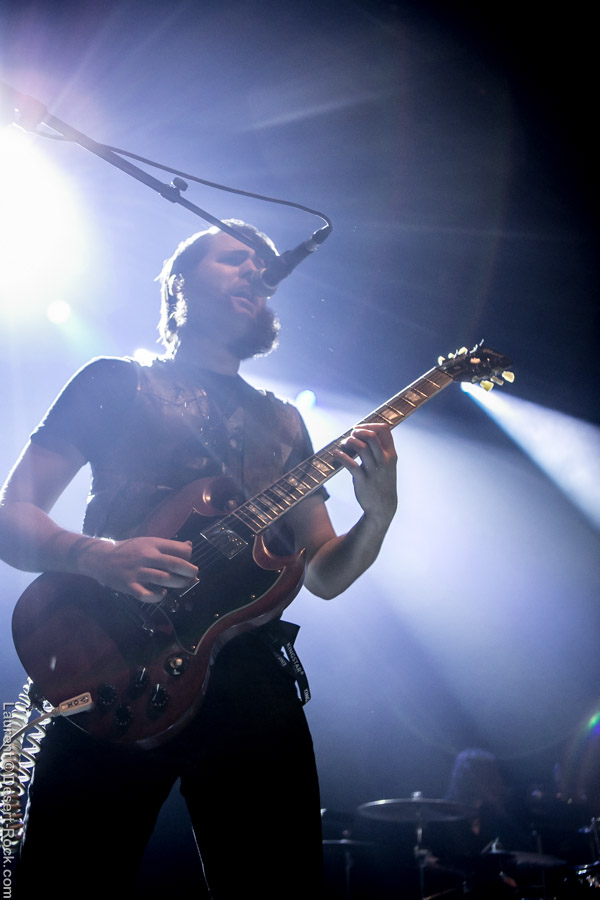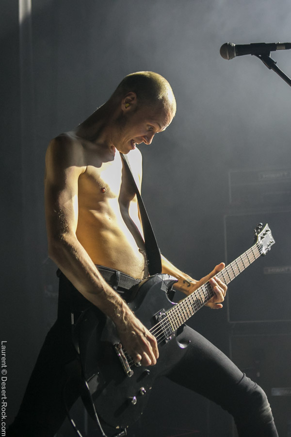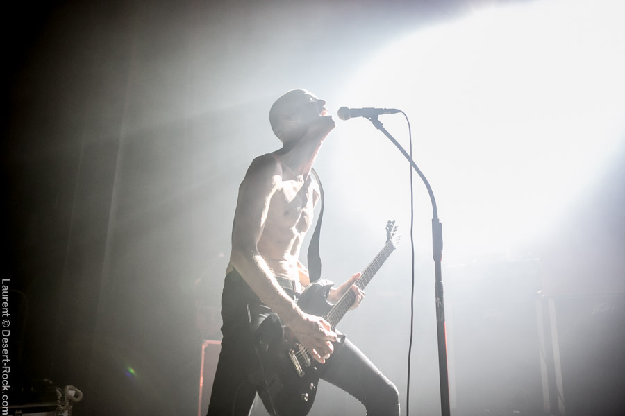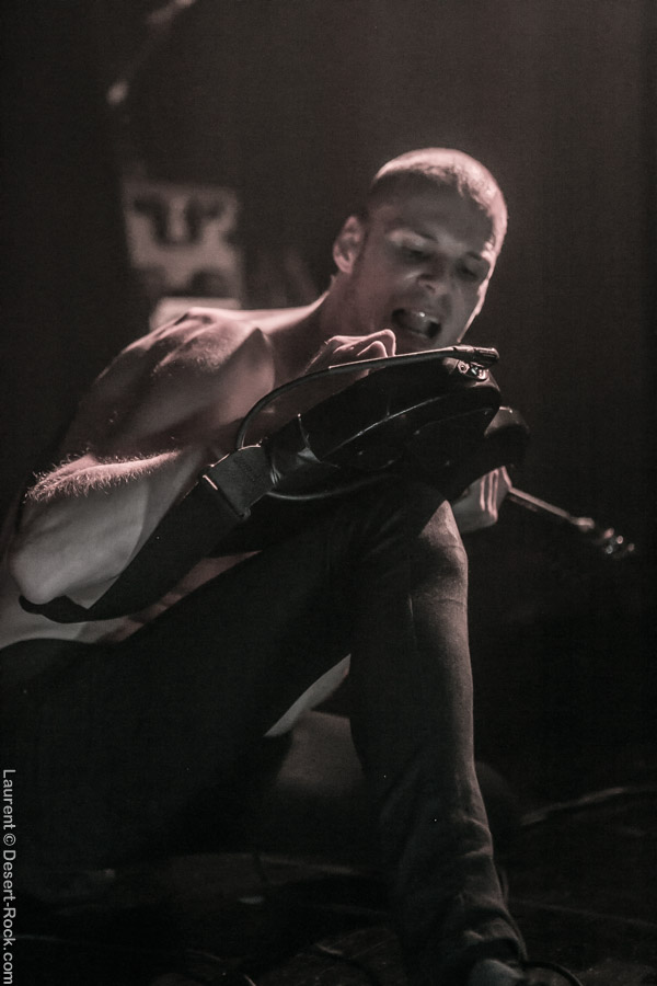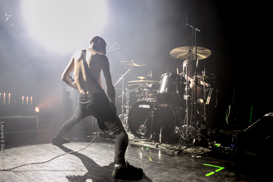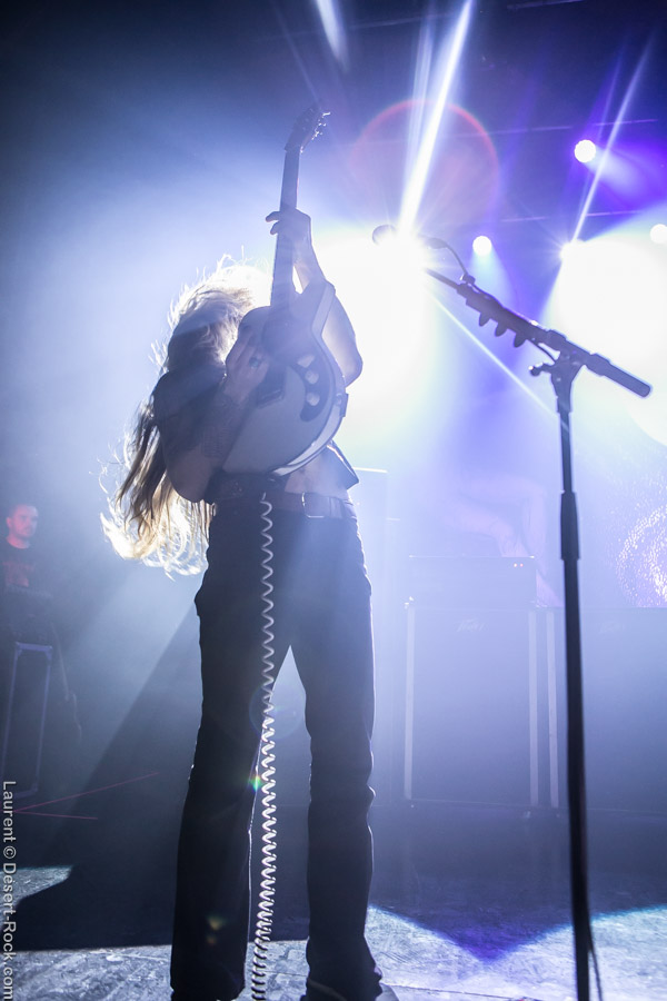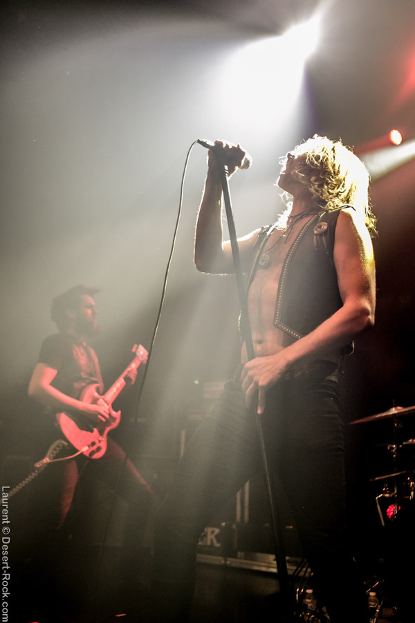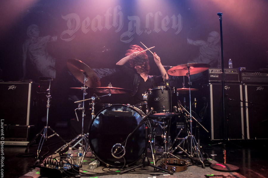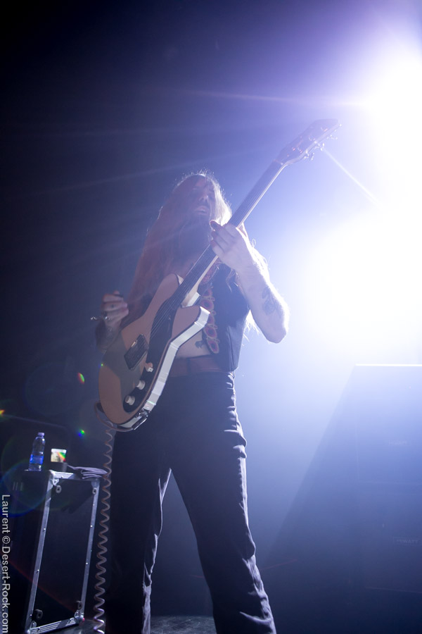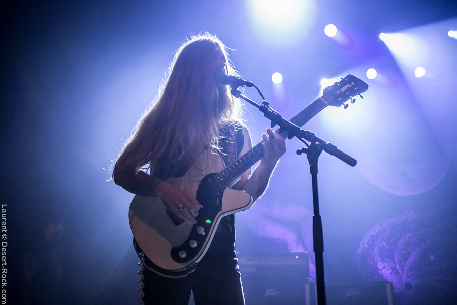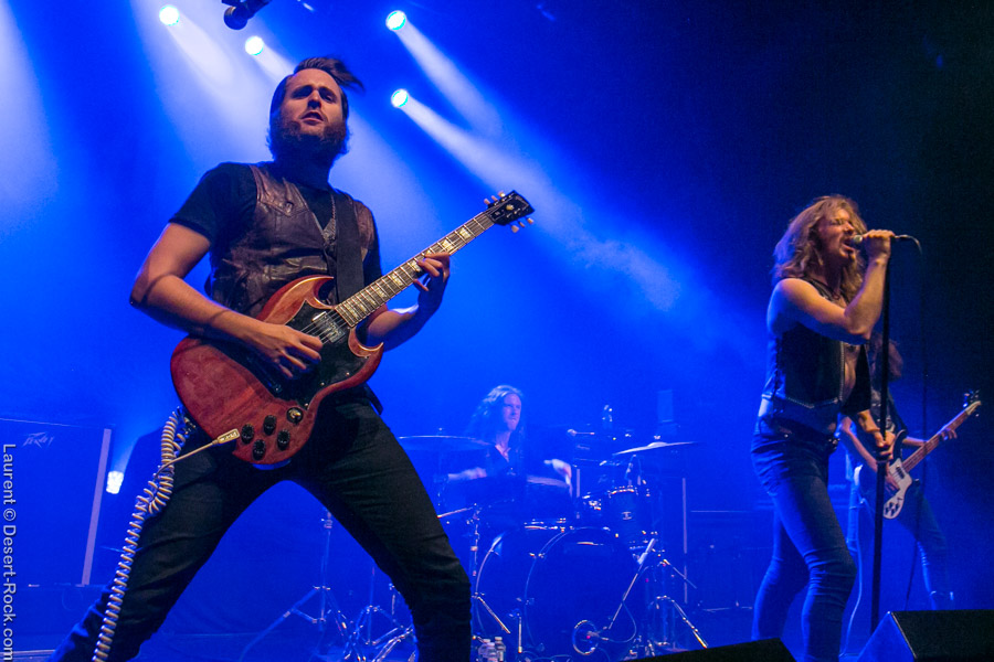 On n’est donc logiquement pas seuls au Krakatoa ce soir : la salle de l’agglomération bordelaise ne fait pas complètement le plein, mais son remplissage est loin d’être ridicule. Lorsque le set de Death Alley commence, la première partie de cette tournée, déjà quelques centaines de personnes se rassemblent devant la scène pour assister au set des bataves. Scéniquement, Death Alley c’est un peu l’assurance tous risques : même si l’on n’est pas fan du genre musical pratiqué par nos quatre lascars (oui, c’est encore du hard rock vintage 70’s, version amphétaminée cependant), force est de constater que sur scène les compos prennent une toute autre dimension, grâce à l’énergie déployée. C’est clairement Douwe Truijens, frontman emblématique du groupe, qui attire tous les regards et génère bonne humeur et dynamisme à l’ensemble : le chanteur, véritable cliché sur pattes (longs cheveux blonds, veste à franges sans manche sur torse nu, grosse moustache…), mène le jeu de scène et incarne le groupe, arpentant la scène de long en large, dansant, le tout avec un sourire ultra-brite et surtout un chant impeccable, juste et puissant ! Derrière, ça joue solide, et en particulier le MVP de l’ombre, Oeds Beydals : l’ancien guitariste des cultes The Devil’s Blood se fait plaisir, dégaine des sons de guitare venus de nulle part et crache les soli par pack de 12. Le groupe termine son généreux set par l’épique « Supernatural Predator », qui démontre au moins deux choses : le talent des zicos déjà (qui s’y entendent impeccablement pour animer ce gros morceau retors qui repose sur une apothéose instrumentale / jam space rock), mais aussi le potentiel du groupe à se frotter à d’autres genres musicaux « annexes » (et donc un potentiel d’évolution que d’autres n’ont pas forcément). Espérons que le groupe parvienne à solidifier son line up et enfin décoller sur la scène européenne, après quelques années ponctuées par des ratés et faux démarrages.