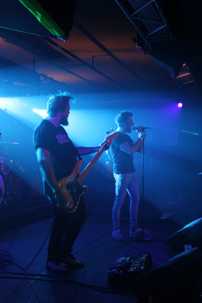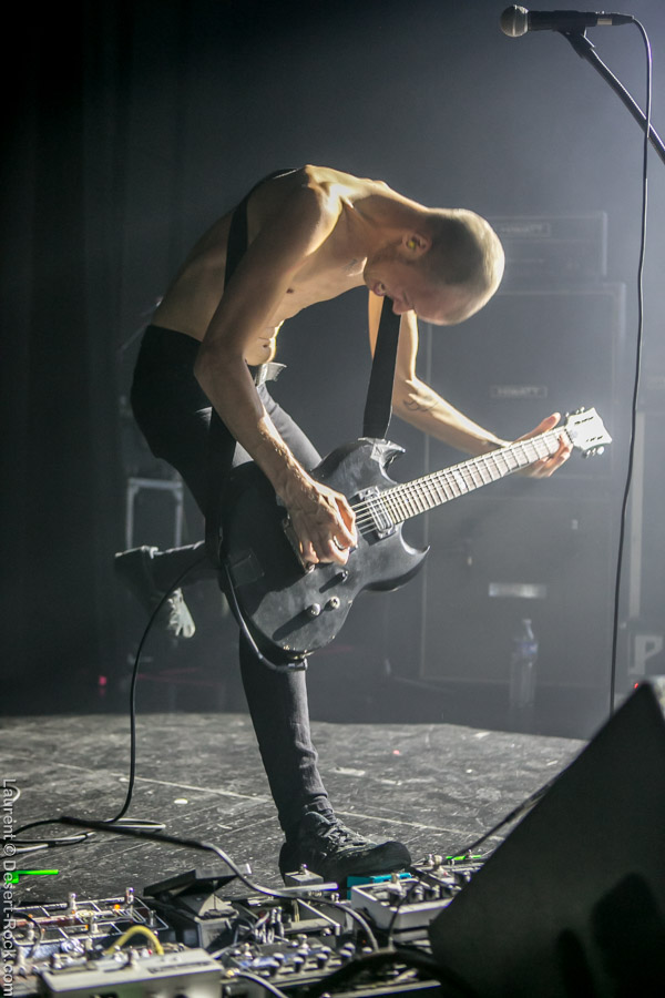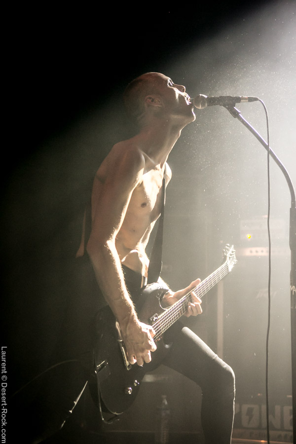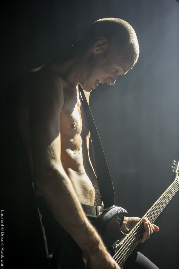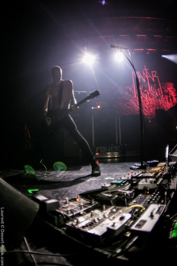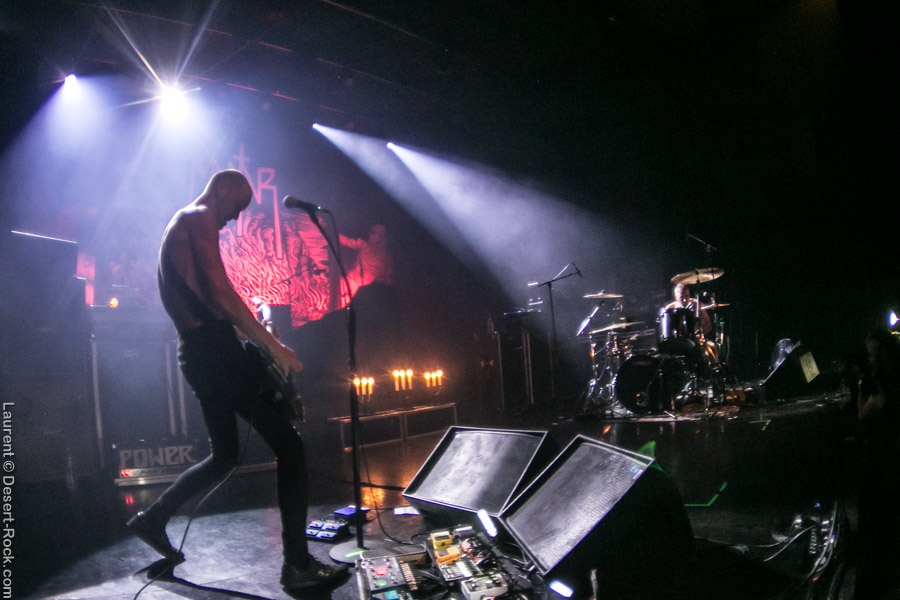 L’humeur est donc au beau fixe quand Mantar monte sur scène. Niveau ambiance musicale, en revanche, le sourire laisse vite sa place aux mâchoires serrées, pour faire face à l’énergie brute du groupe. Faire très vite très mal très fort, le leitmotiv du duo paraît clair. Hanno est déchaîné, une boule d’énergie pure. Toujours aussi maigre, crâne rasé, le chétif guitariste est phénoménal ce soir, encore une fois serait-on tenté de dire. Fusionnant avec sa six-cordes, il se crampe au micro à la moindre ligne de chant, monte à pied joint sur ses pédales d’effet, manipule son rack d’effets avec tous les membres disponibles (!) dans toutes les positions imaginables (!!), et dès qu’il a une seconde vient délivrer quelques riffs purulents au public, comme autant d’insultes crachées au visage. Jouissif. Erinc est fatalement plus sobre scéniquement, mais le taf enquillé derrière son kit de batterie est énorme. Terrassés au milieu de set, le filet de bave au coin de la bouche, on se retourne pour constater un léger problème : un léger décalage (euphémisme) entre la puissance délivrée sur scène et la réaction du public, modérée (euphémisme). Pourtant la set list est imparable, les plus grosses cartouches du groupe y passent, le groupe bénéficiant de plus de 45 minutes de jeu : « Praise the Plague », « Era Borealis », un très fat « Cross The Cross »… Le duo ne faiblit pas un instant malgré un accueil vaguement enthousiaste (euphémisme), là où d’autres auraient levé la pédale ; nouveau signe s’il en fallait un que Mantar est une bête de live. Bref, une très grosse claque… pour qui était disposé à la recevoir et la déguster.