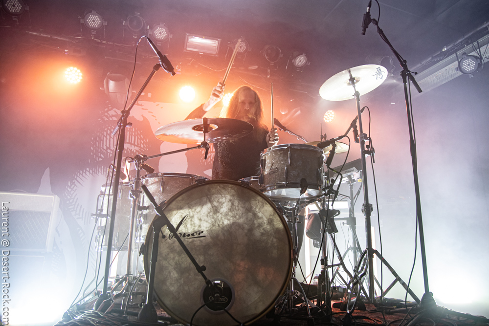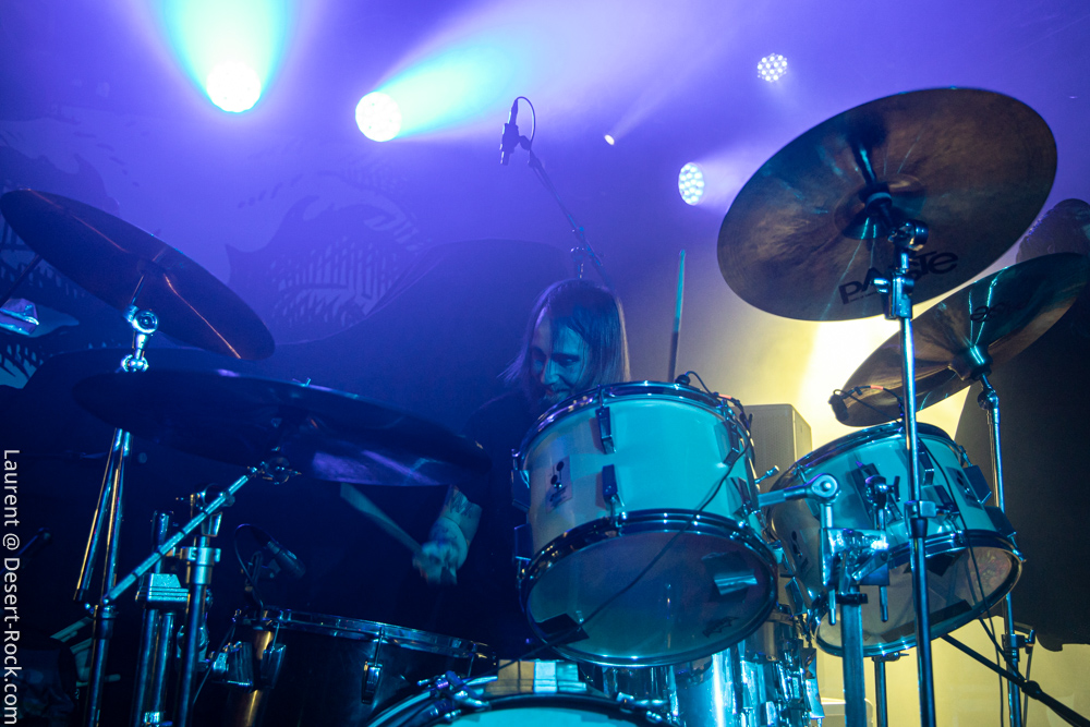 19h45 : pile à l’heure prévue, Hällas débarque dans la pénombre sans bruit et sans faire réagir le public qui ne les accueille même pas avec un petit applaudissement. Pas grave, les suédois en ont vu d’autres et ils ont une arme irrésistible pour s’attirer l’attention : un truc qui s’appelle « The Astral Seer »… Sauf que l’ingé-son doit être aux toilettes car on a l’impression que le groupe est en acoustique tellement le son est faiblard ! Heureusement, cela va s’améliorer au fil des 5 titres qui composeront leur set. Premier choc pour le néophyte d’Hällas que je suis : la voix, fulgurante et tétanisante, de Tommy Alexandersson. Pour le coup, il a réussi à me foutre les poils… Par contre, je peux aisément comprendre que ce genre d’organe puisse déranger et en rebuter certains mais pour ma part, j’adore ! 3 titres de l’album Excerpts From a Future Past, paru en 2017, seront de la partie ce soir (« The Astral Seer », « The Golden City Of Semyra » et le superbe « Star Rider » qui secouera l’assistance) ainsi que « Tear Of a Traitor », extrait de leur nouvel album à paraître fin janvier. Une belle découverte, saluée comme il se doit par un public qui a apprécié la prestation.