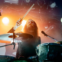Une toile tendue représentant la tronche d’un diable prêt à vous bouffer est disposée derrière le trio, les lumières se tamisent et nos 3 allemands foulent la scène de l’Alhambra. Il est alors 21h45 et les premiers accords de « The End » arrivent à nos oreilles. Puis « The Devil’s Master » est balancé sans sommation. Le son est dantesque, les lumières crachent dans tous les sens et l’auditoire balance ses attributs capillaires en cadence. Le côté cinématographique du nouvel album, For The Dead Travel Fast (un album qui divise également), prend ici tout son sens : les musiciens sont magnifiés comme jamais grâce à l’ingé-son et au responsable lumières. « Evil Forces » suit dans la même veine (avec un Lupus qui monte haut dans les tours…), avant un « Into The Wormhole », tiré du controversé Rough Times paru en 2017. Tiger se démène comme un beau diable sur ses fûts et gratifie le public des mimiques et grimaces habituelles. Lupus est comme toujours concentré sur ses riffs et Dragon, fier comme un paon, harangue la foule avec toute la classe qui le caractérise.