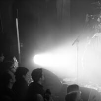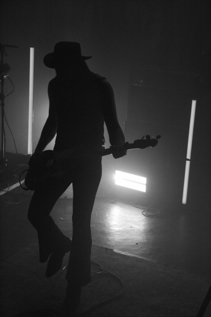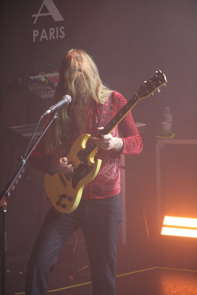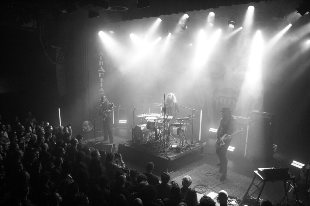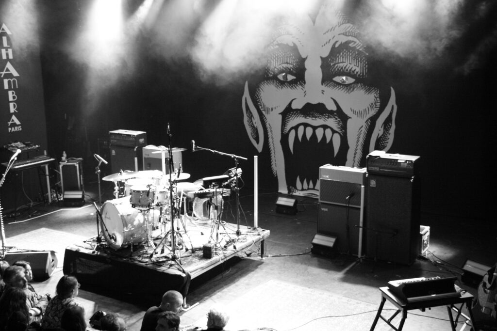 L’Alhambra est un théâtre de 700 places assises environ sauf que, bien évidemment, la fosse est debout ce soir. Dès l’entrée, vous avez le choix : soit vous pouvez rester debout à batailler pour bien vous placer au rez-de-chaussée ou vous pouvez monter à l’étage pour poser votre séant, peinard sur de confortables sièges rouge sang. Mon dos m’ayant honteusement lâché quelques jours plus tôt me supplie de le reposer et c’est donc depuis le balcon que je vivrais cette soirée (vous verrez quand vous aurez mon âge, bande de millenials !). La fosse se remplit doucement, la bière coule à flots, les premiers vinyles apparaissent dans les bras et la fumée qui recouvre la fosse se dissipe peu à peu. Des écrans de part et d’autre de la scène déroulent les concerts à venir… Oh putain ! Y a Chimène Badi le lendemain ! On a eu chaud !!!