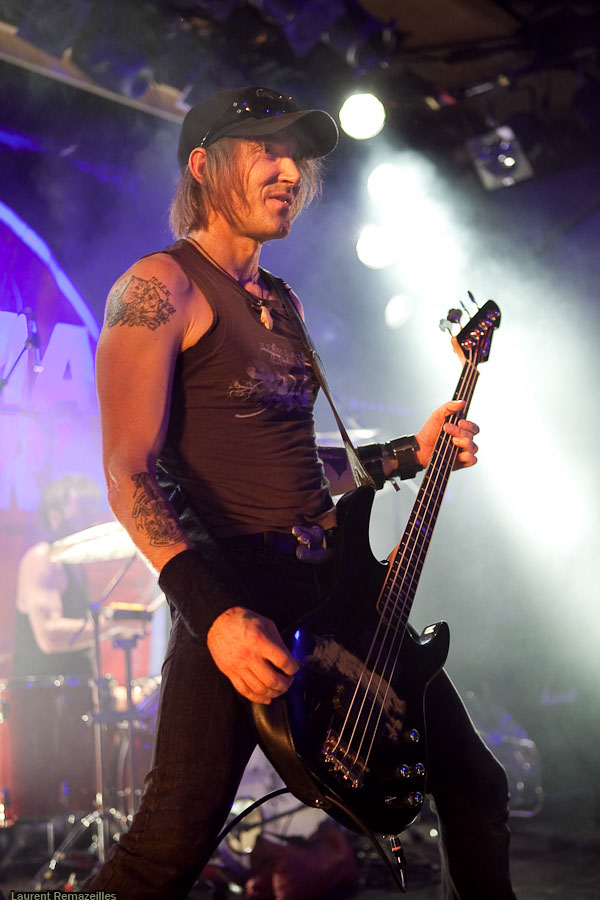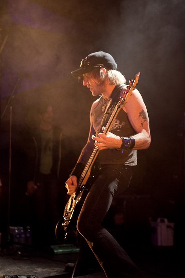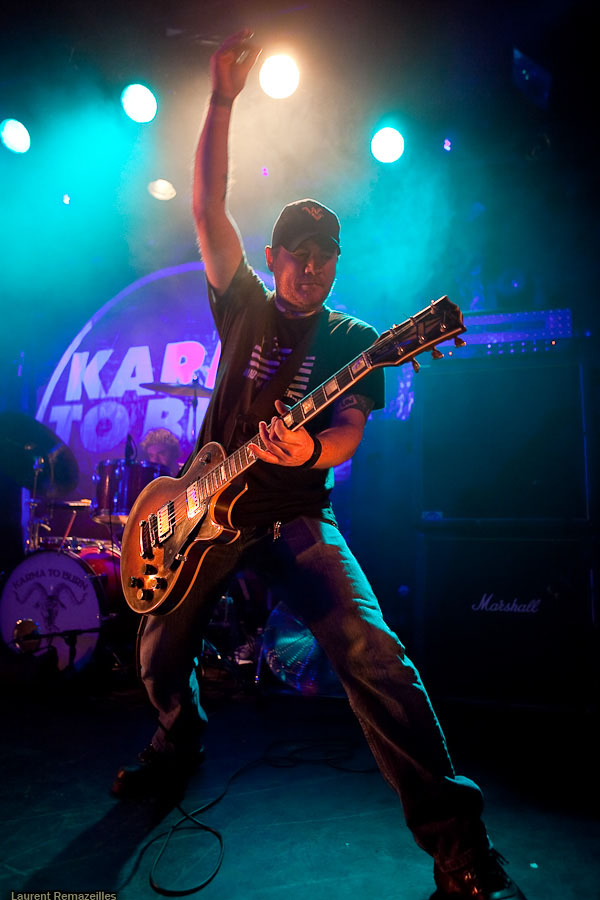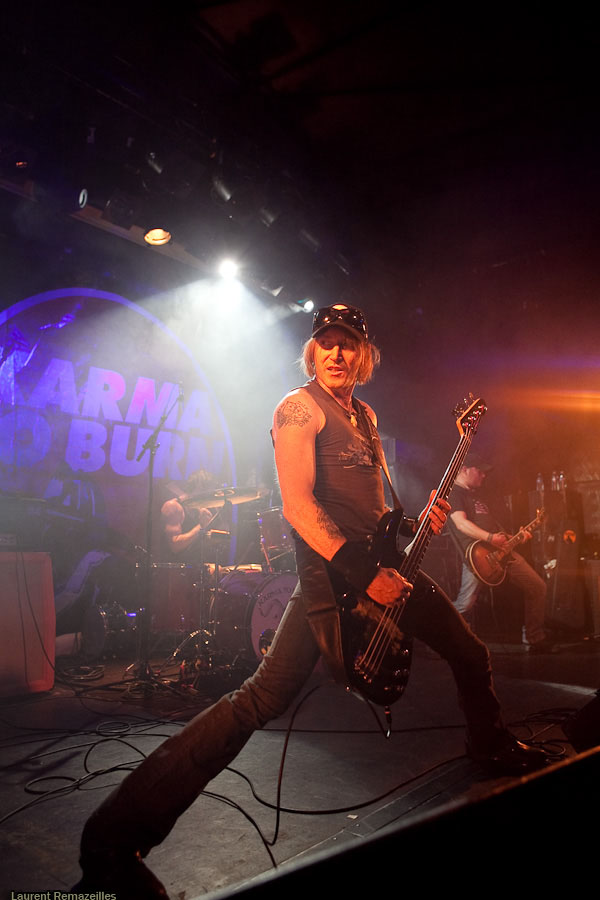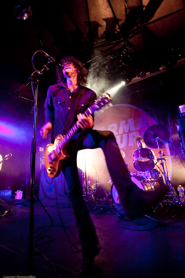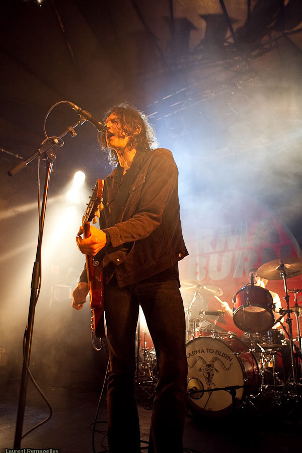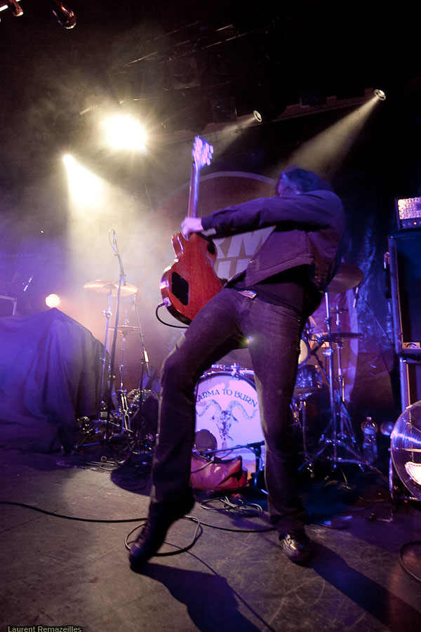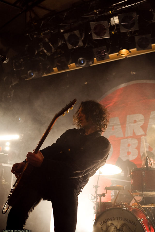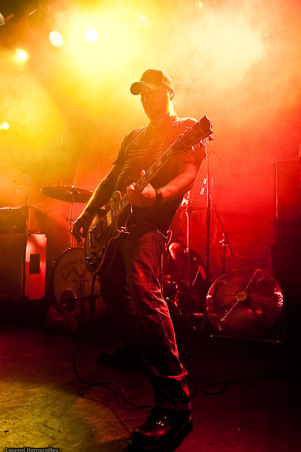 De manière assez étonnante, c’est donc à Yeah Right que revient l’honneur d’ouvrir pour Karma To Burn. La logique n’est pas pour rien dans le choix de ce groupe sur cette affiche, le trio parisien s’inspirant très clairement dans sa formule du trio ouest-virginien : du gros hard rock stonerien instrumental. L’avenir dira si ce choix est le bon, mais on se permettra quelques retenues sur le résultat final : la formule du power trio, déjà, est musicalement probablement la plus exigeante en soi. Si en plus l’on se départit des vocaux, le niveau musical requis grimpe en flèche. Et Yeah Right se confronte de plein fouet à ce problème : le moindre pain se détecte immédiatement (et il y en a parfois, à la gratte notamment). Le son très (trop ?) « propre » n’aide pas… Mon avis peut apparaître critique, mais n’oublions pas que ce groupe a été privilégié à Year Long Disaster pour disposer d’un set plus long et plus tard dans la soirée ! Ce privilège implique une responsabilité supérieure.