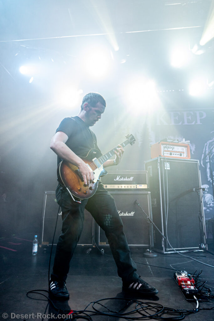 S’il est rare sur scène, le quatuor de doomsters de Chicago a ces dernières années fait chanceler l’un après l’autre les festivals européens qui comptent. Ils étaient d’ailleurs déjà au Keep It Low en 2019, alors que le fest se tenait dans un complexe munichois de plus petite taille que le Backstage. Voir la dimension prise par le groupe, en constatant cette immense salle Werck blindée, est finalement logique, chacune de ses prestations ayant laissé des traces. Sur scène, comme d’habitude, pas d’esbroufe : des amplis au fond, 3 pedal boards, une batterie, aucun pied de micro. On allume les potards de volume et autres effets, on laisse le son dissonant des amplis préparer le terrain, et on laisse se produire le déluge. Le son, comme tous les concerts d’aujourd’hui comme d’hier, est massif, tout à fait en mesure de servir l’effet bulldozer de leur compo. Le set commence par le très surprenant « Worship », issu du vieux Satan Worship Doom, un titre qui reprend bien les caractéristiques « primaires » de leur répertoire : gros riffs, dynamiques évolutives, breaks dévastateurs… Effet garanti. La suite est tout aussi surprenante, le groupe déterrant le remarquable « Reefer Sutherland » du mal aimé Hippie Killer (album qu’ils ont récemment déterré pour quelques dates spéciales aux U.S.A.). Le dernier album est représenté par le très prévisible mais excellent « Nothing », avec 20 minutes à couper le souffle pour un final pour le moins rude ! On pouvait craindre l’effet « parenthèse » un peu trop atypique dans une programmation de la grande scène plutôt orientée stoner rock / retro rock aujourd’hui, mais il faut croire que le public avait bien besoin d’une petite claque derrière la nuque, car il s’y est donné à cœur joie – il faut le voir headbanguer comme des vagues de marée humaine, les yeux fermés, en semi-transe, sur « Nothing » … Ça défile ainsi pendant un peu moins d’une heure, dont tout le monde ressort exsangue et soufflé.