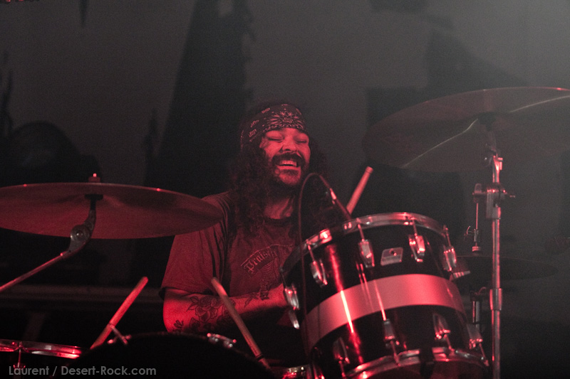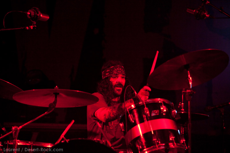 Le public, malgré la chaleur à la limite du supportable, est hyper réactif. L’ambiance est très bonne. Pour situer un peu les choses, il y avait très longtemps que je n’avais pas vu un public applaudir autant avant le rappel. Considéré comme acquis maintenant, j’ai remarqué que bien souvent le public attendait gentiment que les groupes reviennent sur scène et qu’il n’y avait jamais que quelques fans hardcores pour crier comme des damnés. Et bien ici, ce fût applaudissement nourris pendant la pause, ça fait plaisir. Et que dire de la fin de « Supa Scoopa and Mighty Scoop ». Sur les coups de batterie achevant ce morceau, le public est tellement réactif que Brant Bjork se prend au jeu et en rajoute une bonne dose, le public criant sur chaque coup de cymbales.