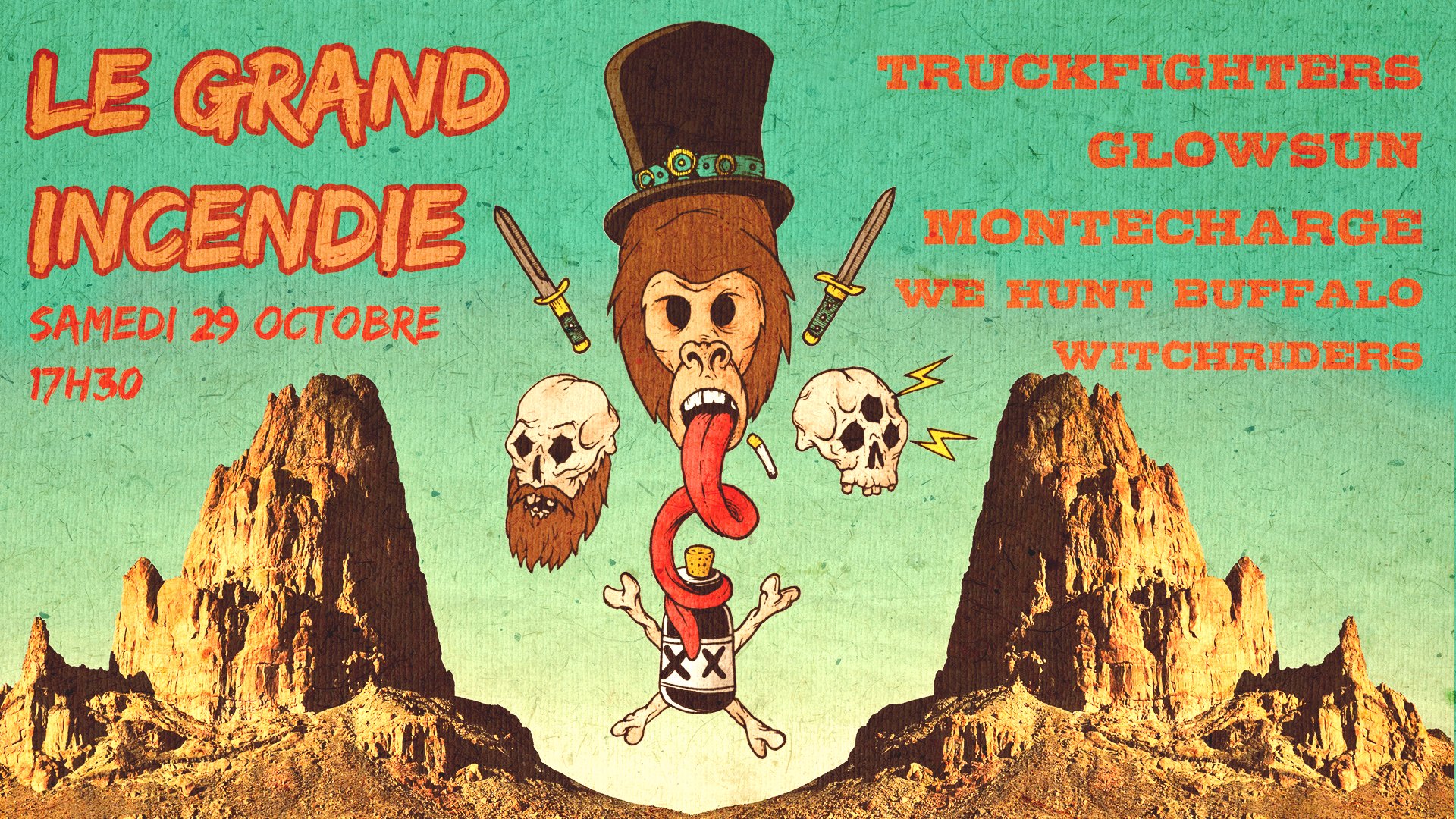 Pour le dessert, une farandole de sucreries avec Le Grand Incendie, première édition d’un festival qui, s’il trouve son chemin pourrait se pérenniser. A la vue de la prog de cette journée, c’est tout le mal qu’on lui souhaite. Regarde donc, jeune férue de musique ferreuse: Truckfighter, Glowsun, We Hunt Buffalo, Witchrider et Montecharge. Ca va donc fuzzer velu le 29/10, toujours en partenariat avec le Jack Jack et toujours pour un prix modique, genre 12 euros, genre, bagatelle.