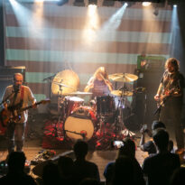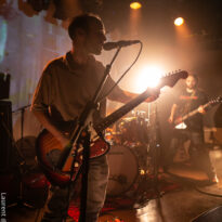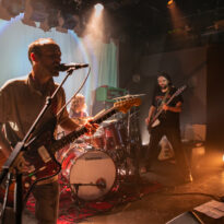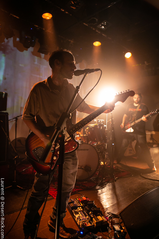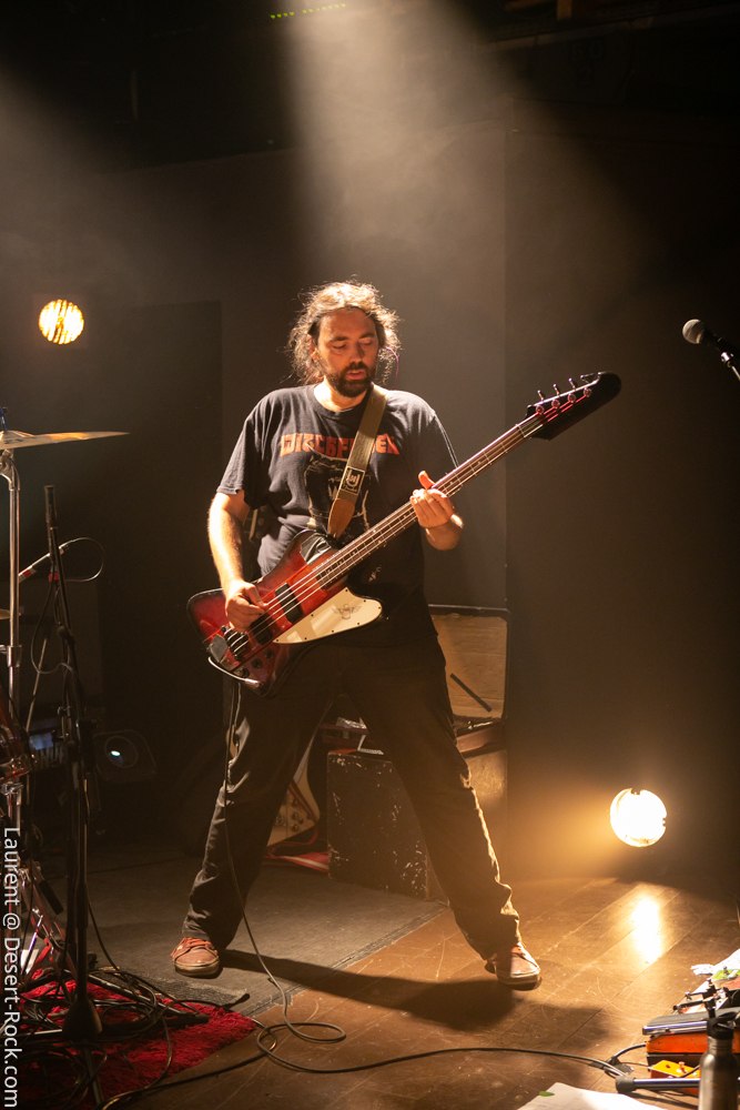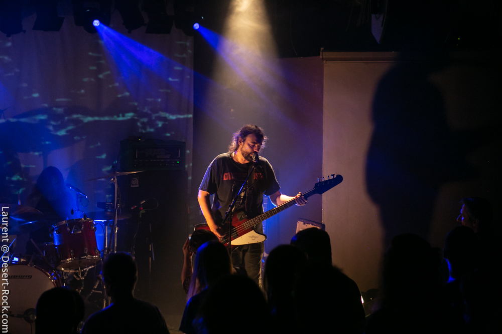 L’ambiance est cool, la chaleur de la journée se prolonge dans la cour de Rock & Chanson, la dynamique asso qui gère cette petite salle dans l’agglo bordelaise. Le bar fait le plein, la plupart des gens se connaissent et déconnent, on retrouve un petit stand de merch improvisé… Le houblon coule et les sourires sont au rendez-vous. L’heure du concert arrivant, la salle se remplit tranquillement, avant que le trio des régionaux de l’étape monte sur la petite scène. L’Antirouille est la salle parfaite pour cette petite sauterie : de petite capacité, elle offre pourtant des conditions scéniques impeccables (son, lights, projections…) à un petit public de happy few.