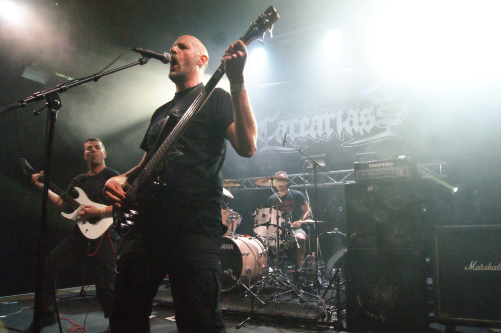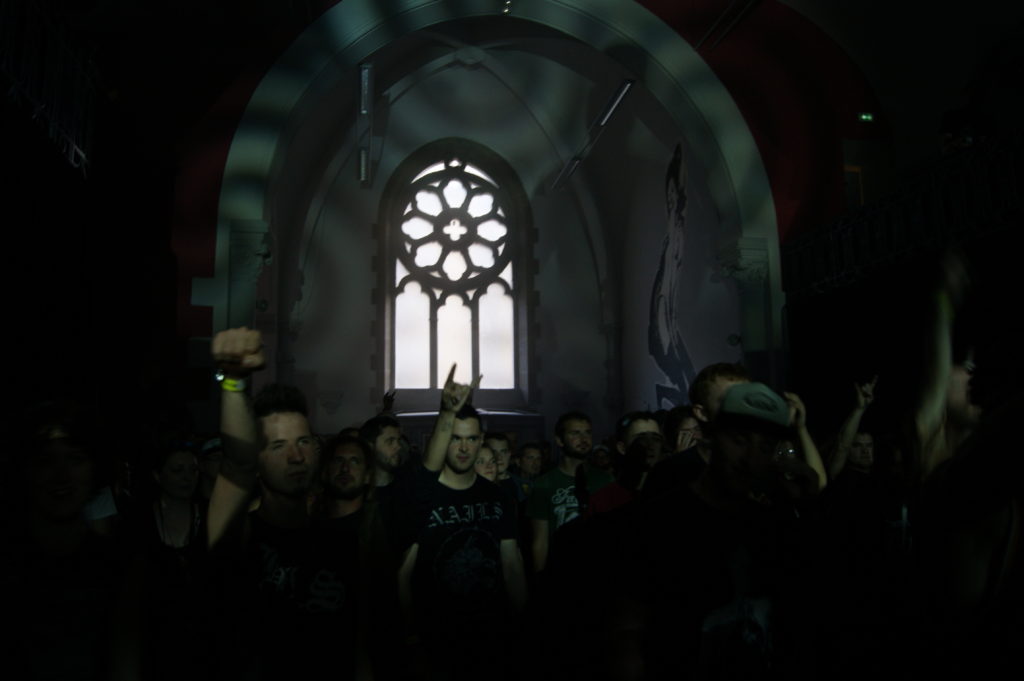 En début de soirée c’est Carcariass qui investit la chapelle. Je m’arrête un moment sur ce groupe bien que hors sujet ici. Ce groupe tout droit venu de mon adolescence, va être reçu comme un inconnu total par le public sans doute amnésique du Death technique tendance Prog. Le trio de Besançon va petit à petit reconquérir un public (Il faut dire que plus de dix ans d’absence représentent un gros challenge malgré un programmation au Hellfest l’an passé). Un guitariste à quatre bras, un batteur aux frontières du jazz le plus technique et un bassiste en tapping quasi intégral vont faire sortir les spectateurs de leur torpeur pour clôturer le set dans la joie et l’allégresse.