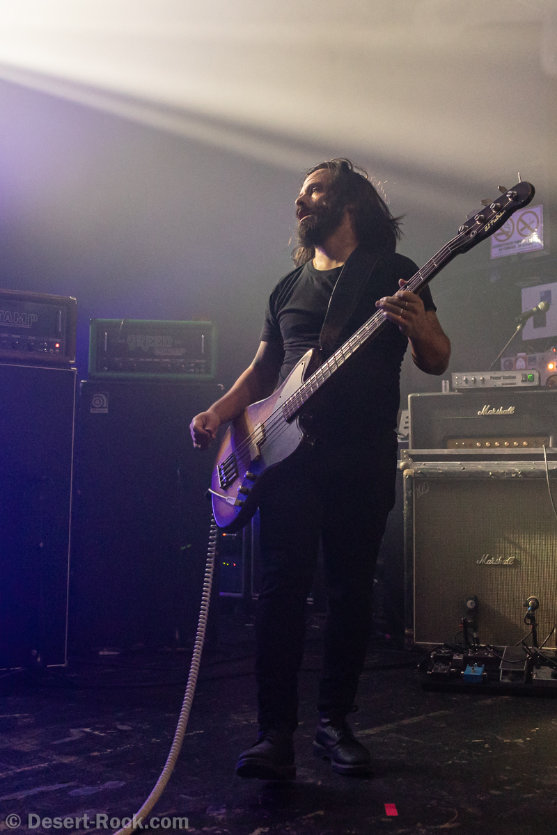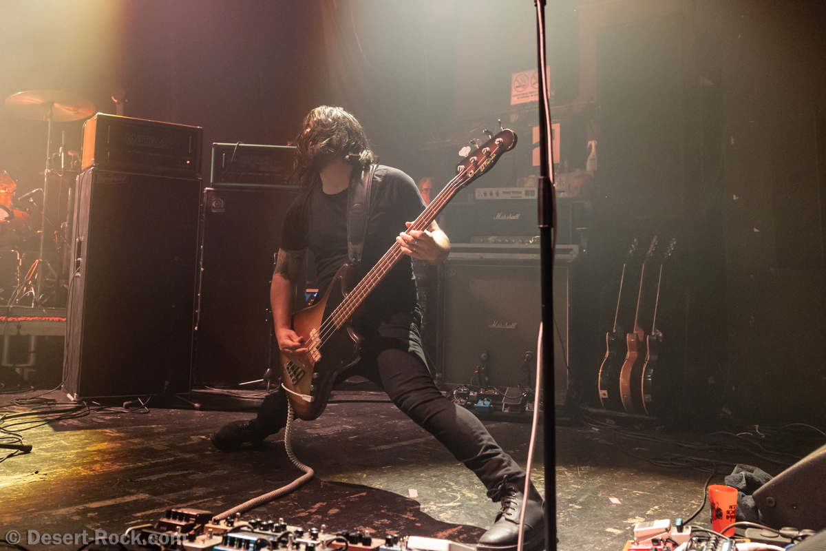 Le trio d’Eysines, à quelques encablures de la salle, a des fourmis dans les jambes, et prend la scène avec dix minutes d’avance. Se chauffant sur quelques mesures jammées, ils balancent vite les premiers accords de “Furies”, pied au plancher. Tant pis pour ceux qui pensaient pouvoir finir de siroter leur verre tranquillement au bar… La salle se remplit très vite. Évidemment, le concert de ce soir, calé le lendemain de la sortie de leur nouvel album, sur leurs terres, fait logiquement office de release party. Parfaite occasion de tester sur les planches le furieux “Conveyor” et “Summerchild”, issus de ce nouvel opus, qui trouvent très naturellement leur place dans le set. Un peu plus tard, c’est “Commotions” qui passe lui aussi brillamment l’exercice de la transposition scénique, avec toujours ce binôme de cordistes surexcités. Ces gars-là mêlent une énergie débordante et une maîtrise instrumentale jamais prise à défaut (les leads de Vincent, les “riffs de basse” de Clément…) et on ne s’ennuie jamais à les voir bouger et bondir en tous sens. Bien souvent on pense tenir là nos “Atomic Bitchwax français” (l’énergie, le talent), mais Red Sun Atacama trace son propre chemin, loin des références.