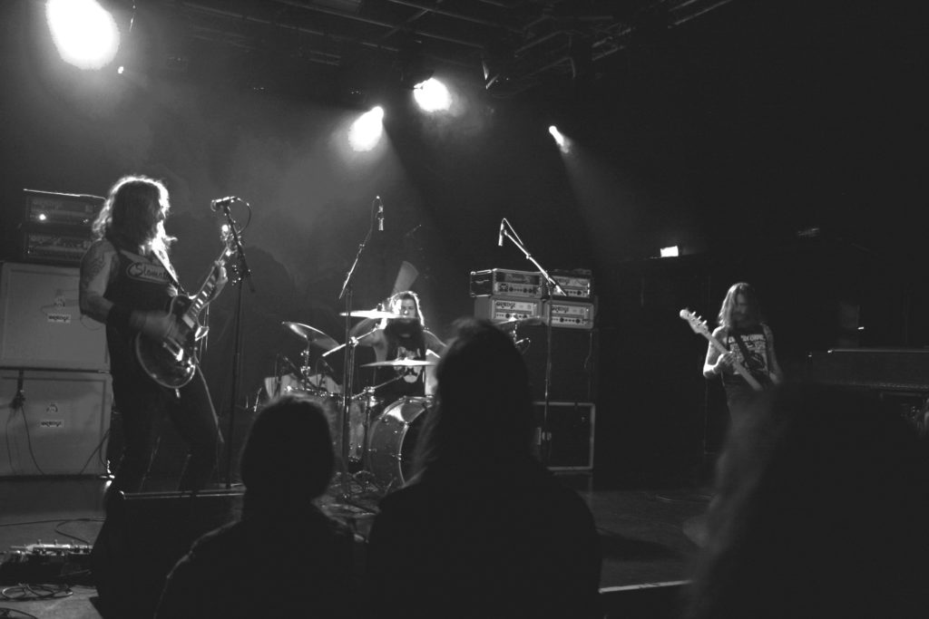La Cartonnerie possède 2 salles de concert : la plus grande, au deuxième étage, peut accueillir pas loin de 1000 personnes mais ce soir, ce sera dans la plus petite salle située au premier étage que les festivités vont se dérouler. Canapés aux coussins rouge vif taillés dans des cuves en zinc, assises design taillées dans la ferraille, bar attenant à la salle, ambiance intimiste aux lumières tamisées… un régal ! Et en plus, le son est réglé aux petits oignons… Bon allez, c’est pas le tout mais on est là pour prendre une cargaison de bûches dans la tronche, voici un trio de chevelus qui s’avance…
