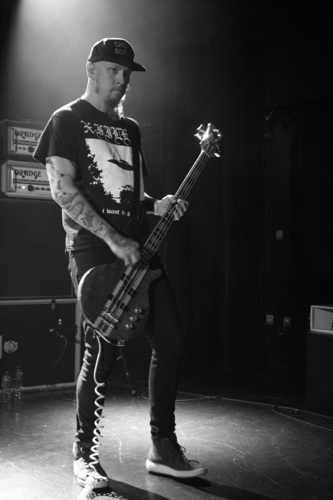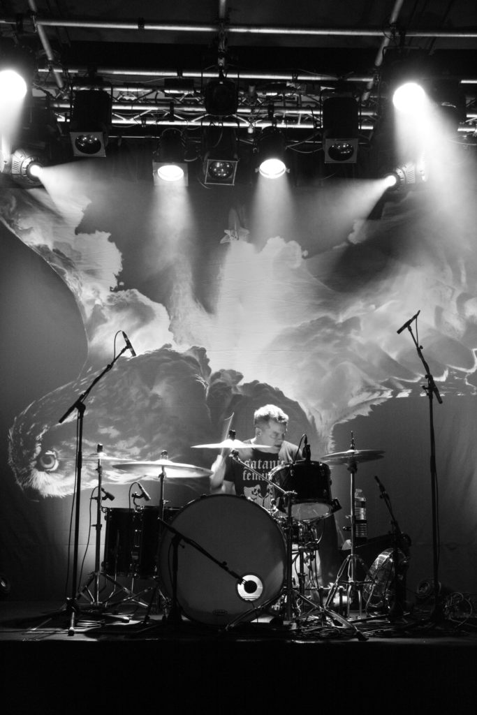 Une heure avant leur concert, j’ai pu rencontrer Esben, Mika et Thomas pendant une vingtaine de minutes (une interview que vous pourrez lire ici dans quelques jours, d’ailleurs…) et j’ai trouvé les gars un peu fatigués. Forcément, je me suis dit bêtement que cela allait se ressentir sur scène… Monumentale erreur ! Dès les premières secondes de « Where Death Meets The Sea » (tiré de l’album « Rust »), l’auditoire est mis au parfum : la distribution de bûches aura bien lieu, pour le plus grand plaisir de tous (après tout, c’est pour çà qu’on est venus, non?). La lumière minimale et la sublime toile tendue sont un bonheur pour les yeux (un peu moins pour les photos…). « Lord Of Suffering » enchaîne sans temps mort et l’instrumental « Audhumbla » (extrait du premier opus « Empress Rising ») est balancé avec une puissance de dingue avant que l’orgue funéraire de « Rust » ne fasse faire hurler le public qui va littéralement se déchaîner (on notera quelques cervicales en miette et plusieurs kilos de cheveux tombés au sol).