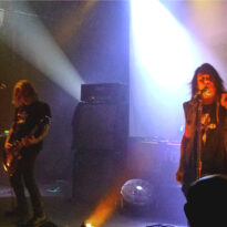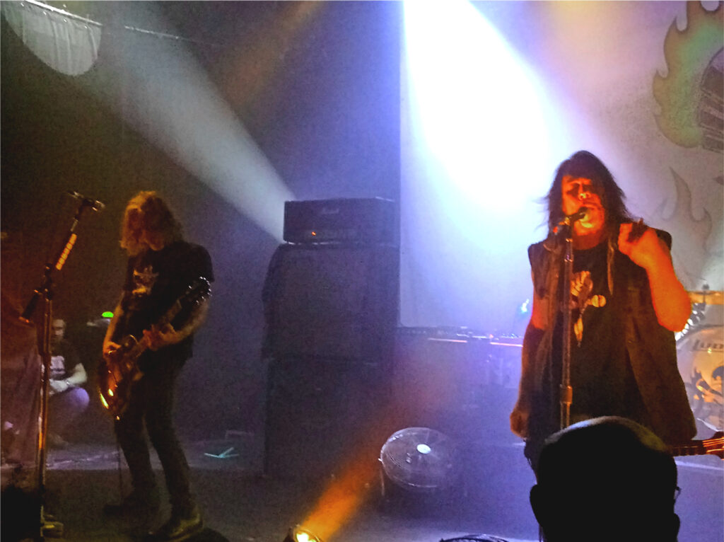 D’emblée la soirée promet d‘être une grosse claque. Une toile de cinéma tendue en fond avec un imprimé du Bull God tout en pots d’échappement crachant des flammes plante le décor. L’enchaînement sur « Rocket Freak » dès le second titre ne laisse pas la salle souffler, Dave Wyndorf se montre hyper communicatif et alpague le public en véritable Story Teller et encourage ses fans à monter en pression. La voix est calibrée sur une très très grosse reverb. Phyl Caivano qui a dû inspirer le look autant de Philippe Manœuvre que de Paul personne assure le set impeccablement derrière ses Rayban et finira par faire tousser les asthmatiques du premier rang remontant sur scène pour le rappel la clope au bec sur « CNN War Theme ». Pantella quant à lui se ferait presque oublier derrière ses fûts si ce n’était quelques frappes ravageuse qui emportent le pit dans plus d’une joyeuse bousculade