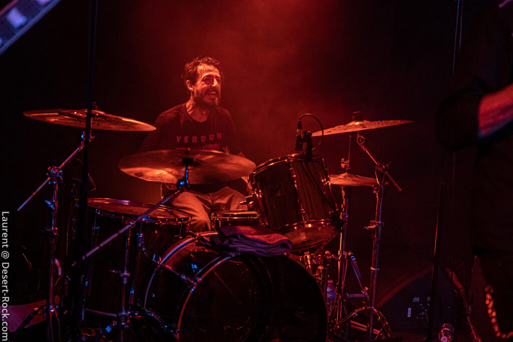 A ses côtés les trois autres musiciens sont loin d’être des guignols. Saïd, taciturne, abat un travail de titan avec une seule guitare, bien aidé par un son à décorner des boeufs. Ses compères à la rythmique ne sont pas non plus là pour cueillir des paquerettes : Xav distille ses patterns puissants et/ou groovy sans faille, ce tandis que Jey (par ailleurs guitariste de Verdun), avec son son de basse ultra-saturé, vient opérer la parfaite jonction entre socle rythmique et support mélodique, renforçant la touche de groove typique du groupe.