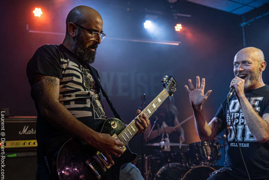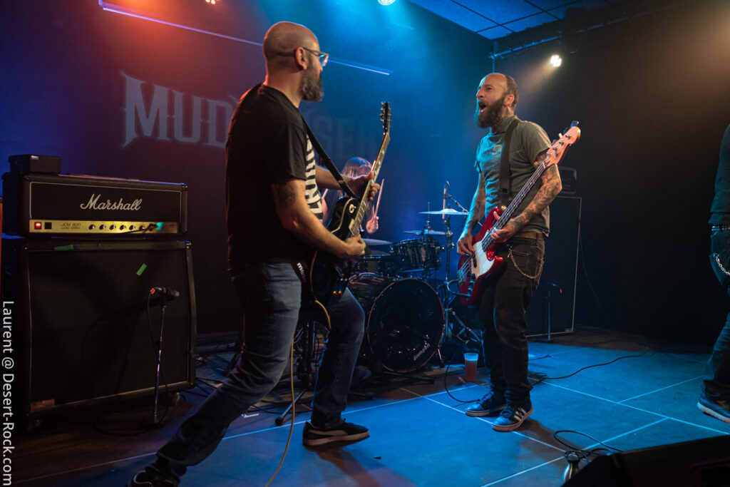 Pas l’affluence des grands soirs aujourd’hui (un week-end ensoleillé de 4 jours a un peu vidé Bordeaux et sa banlieue malheureusement) mais le remplissage de la salle est très correct lors de la montée sur scène de Mudweiser. Rappelons que le quatuor a déjà gratifié la capitale girondine d’une visite il y a six mois environ… mais pas de quoi lasser un public désormais un peu mort de faim côté concerts depuis une paire d’années sur Bordeaux et alentours… C’est donc le cœur léger que l’on prend la première salve en pleine face, avec le très efficace « Invitation », dont le gros riff donne le signal de la translation du bar vers la salle. Confirmation : le son dans la salle est très bon, et la proximité avec le groupe toujours au rendez-vous (les vannes fusent et les échanges entre les membres du groupe et le public interviennent tout au long du concert – il faut dire que Reuno ne se prive pas de mettre à profit chaque transition pour déconner).