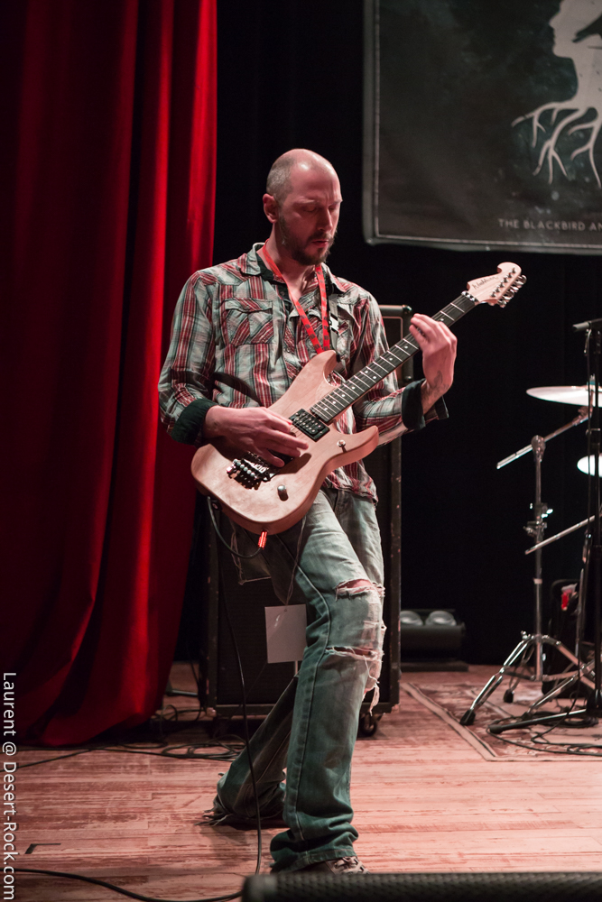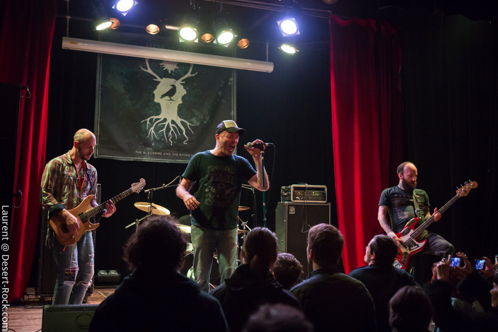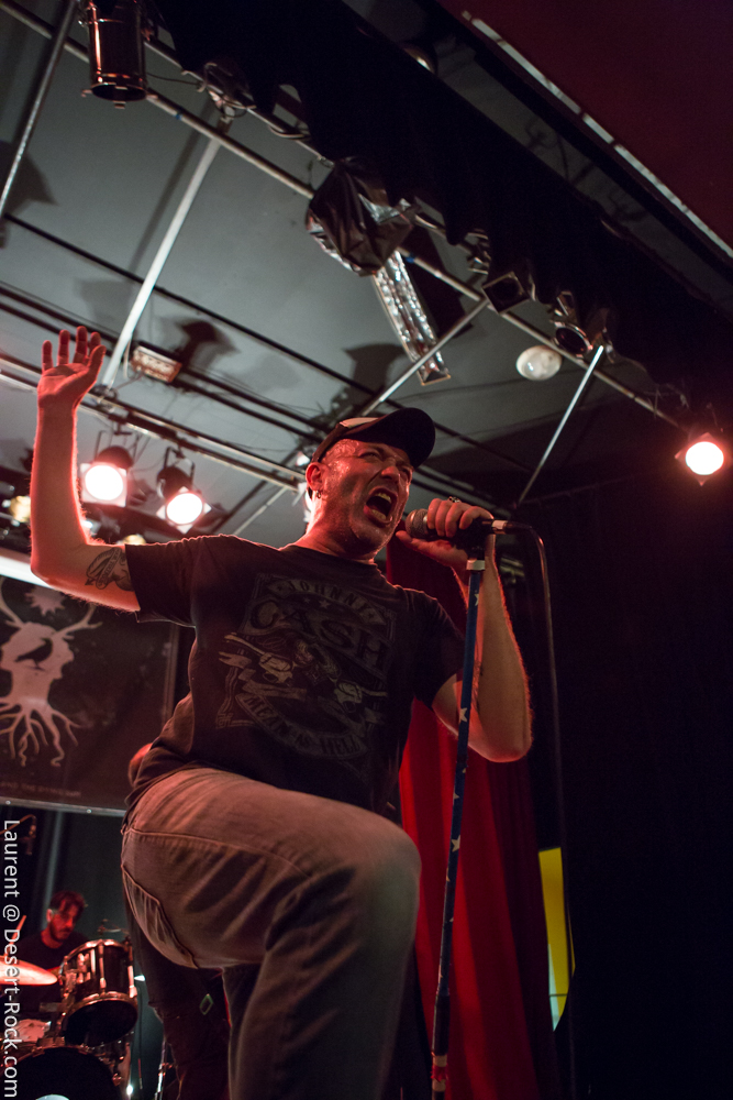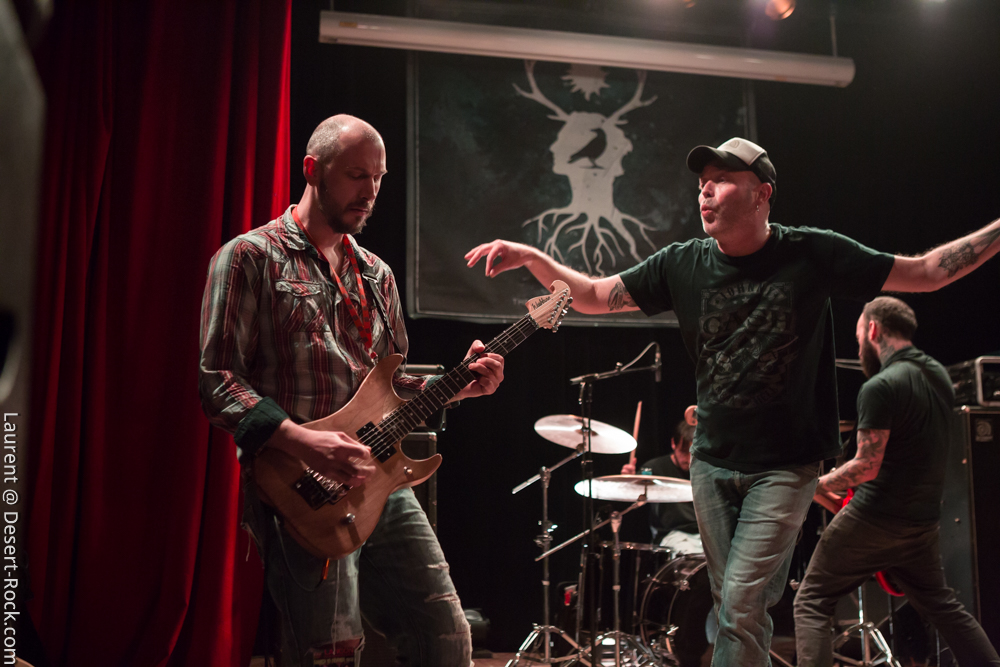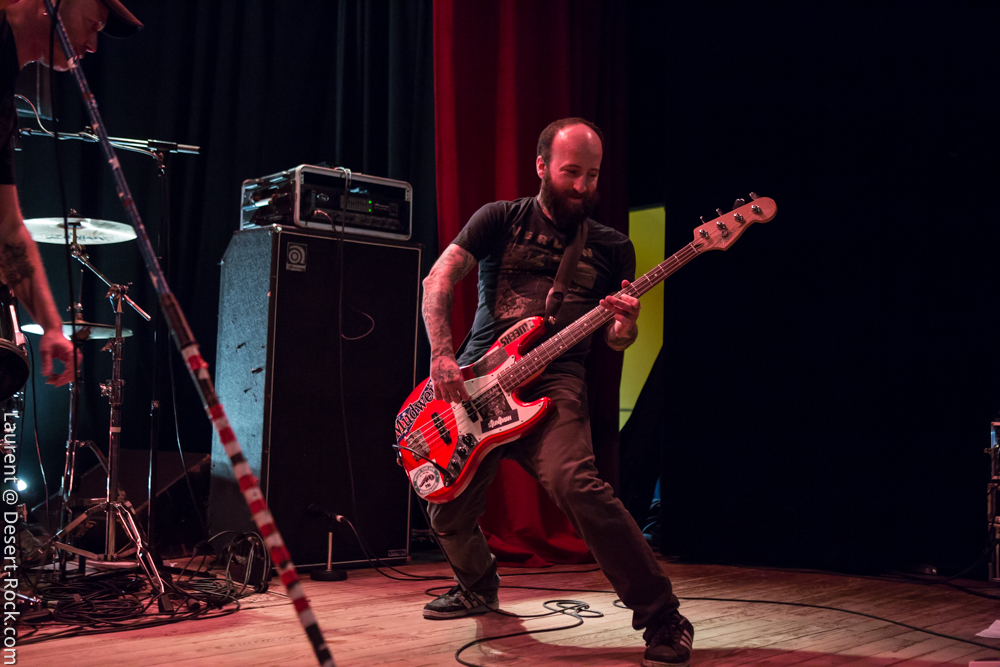 On a d’abord un peu peur en arrivant dans cette salle Langonnaise, on craint un peu le syndrome « salle des fêtes » avec un son dégueulasse ; heureusement les premiers accords de Karmapolis nous rassurent, il n’y aura aucun soucis de mise en son ce soir. Karmapolis, donc, un duo guitare/chant et batterie, est sur scène quand on rentre dans la salle. On connaît l’exigence du format « binôme » et on constate vite que non seulement le duo est en place, mais aussi que l’alchimie est là. Musicalement, on se retrouve sur un gros rock qui navigue ici ou là dans des embardées stylistiques variées : rock indé, metal, psyche, ça part un peu dans tous les sens, mais tout est sous contrôle. Disons-le tout de go : l’amateur de rock y trouvera son compte, mais l’esthète du rock bitumé option huile de vidange trouvera la guitare un peu légère… Mais quel batteur en revanche ! Et on passera sous silence le malaise du wall of death le plus maladroit de l’histoire du rock…