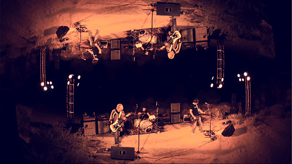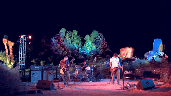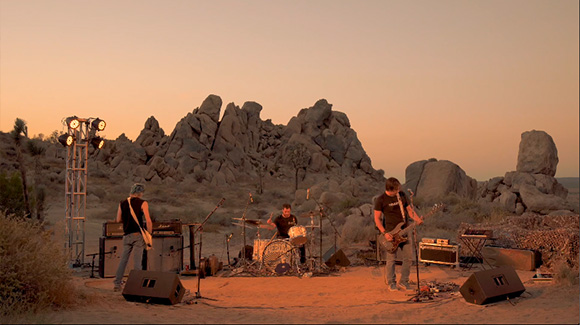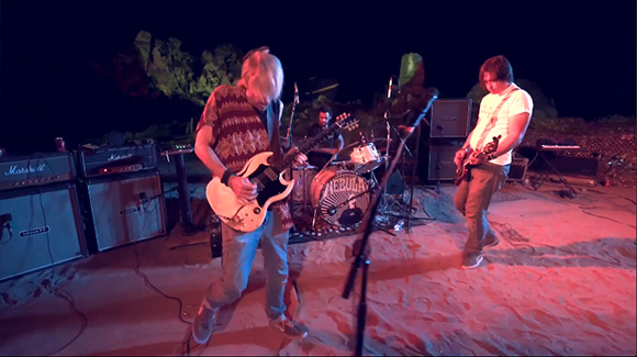 Le concert commence donc réellement au bout d’1h après la « prise d’antenne » (avec un petit générique et quelques plans aériens de la prod : tous ces éléments désynchronisés nous rappellent donc que ce n’est pas une captation en direct, mais un enregistrement effectué il y a plusieurs mois, en octobre 2020, ayant bénéficié d’un montage vidéo significatif depuis). Le premier titre joue la sécurité : le classique « To the Center », étiré dans tous les sens et chargés de jams et soli un peu partout, nous rappelle de quoi est fait Nebula en live – de l’imprévisible… la vie quoi ! Le titre est capté dans une ambiance un peu irréelle, entre chien et loup, sous un soleil crépusculaire aux couleurs un peu fantasmatiques.