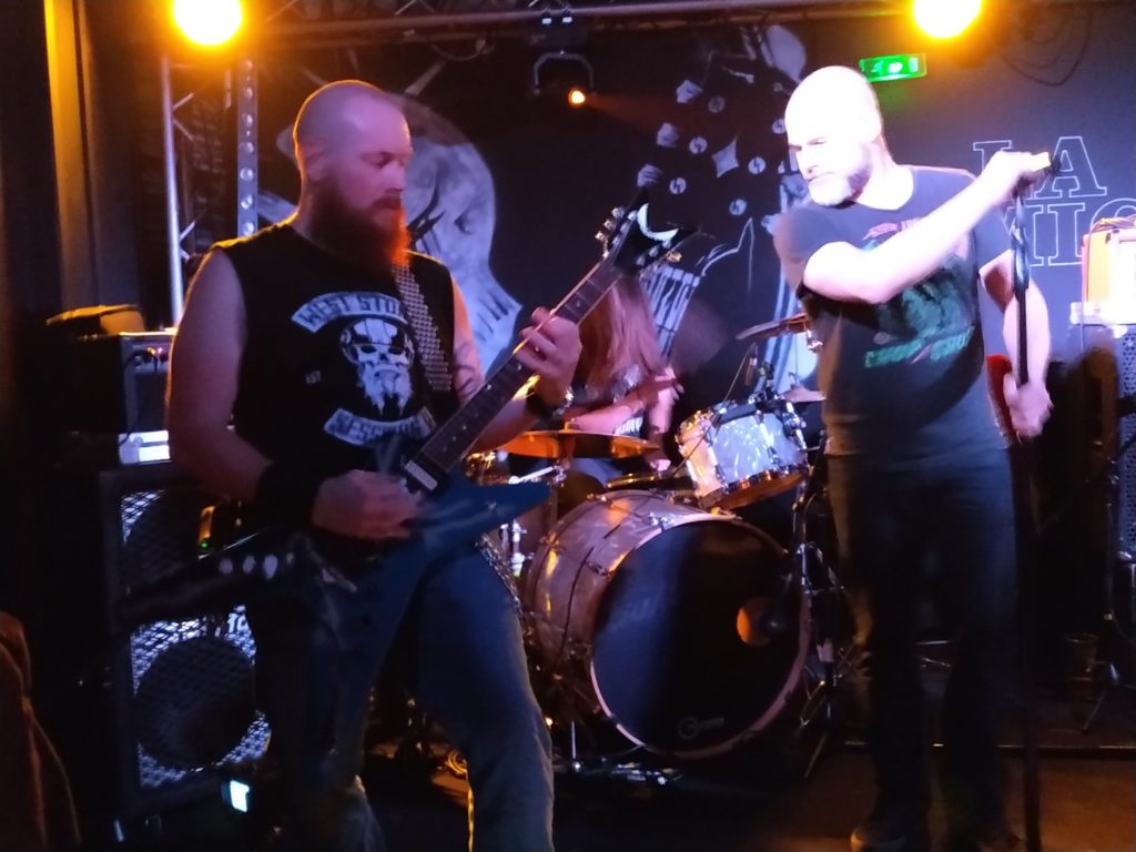 Le gratteux accroché à sa Dean From Hell (Guitare inspirée de celle de Dimebag Darell) livre des bûches de 40. Le son est trapu et efficace et plus le set avance plus le premier rang joue l’interaction avec des vannes auxquelles Hangman’s Blood prend un malin plaisir à rétorquer. Ce n’est pas qu’à cause de l’orientation des spots en direction du public que la salle s’échauffe, la tessiture de voix qui agit dans les basses vient s’érailler lorsqu’il s’agit de mettre la gomme et le public s’y complait. Le groupe semble inépuisable, il ne perd rien de son énergie et je serais curieux de les voir sur un long format pour savoir si celle-ci reste entière