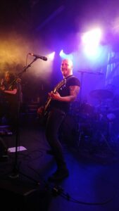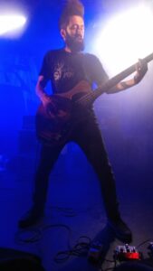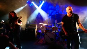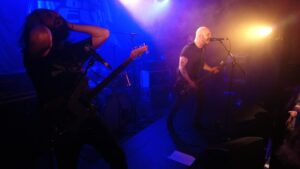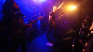 Si le growl de Babis me semble un peu usé en début de set, très vite il montre qu’il n’en est rien. Il hurle son chant, l’appuyant de nombreuses grimaces et joyeuses mimiques qui caractérisent son approche de la scène. La salle en redemande et se chauffe rapidement, l’atmosphère est moite et les corps commencent à prendre vie. La cohésion est parfaite sur scène et Planet of Zeus offre un set enthousiasmant en balayant toute appréhension, ce n’est plus le même groupe qu’un an auparavant. La qualité de l’éclairage y est pour beaucoup, c’est un appui feu de taille qui augmente l’aura du groupe. La foule ne s’y trompe pas et rapidement commence à remuer violemment.