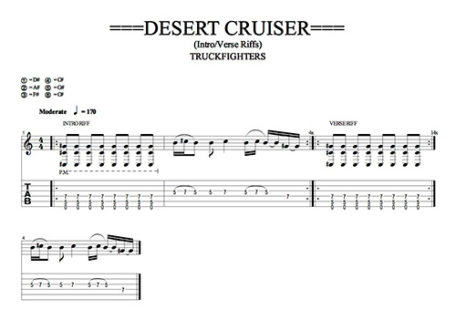 Pas d’inquiétude jeune foufou. Prenons, au hasard, Truckfighters, et son riff badass de « Desert Cruiser ». En plus de la vidéo (en flash ou à l’aide de Quicktime), où le musicien concerné vous explique doigt à doigt où les placer, vous retrouverez en dessous accordage, partition et tablature pour vous aider dans votre quête d’apprentissage.