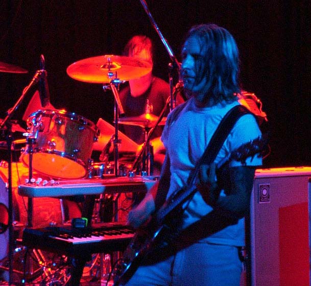 Mais le plus incroyable reste la musique du quatuor (nouvellement quintette), et les chansons qui s’enchaînent sans temps mort sont là pour en attester. Enchaînant les morceaux rapides avec les morceaux les plus lents, les jams expérimentales psychoïdes avec les brûlots tendance punkoïde, les sections instrumentales aériennes avec les morceaux au chant le plus poignant, le concert avance sans le moindre point faible, sans que l’on ne puisse détacher ce stupide sourire béat de son visage. Niveau set list, évidemment une bonne portion de ‘Rated R’ est interprétée live (et sans éviter le cliché, c’est bien là qu’elles prennent une toute autre dimension), mais les amateurs du premier album des Queens en ont aussi eu pour leur argent, avec des morceaux plus anciens ré-arrangés, améliorés, ou transfigurés par des années d’usure sur la route. Mieux encore, même les fans hardcore du combo ont été gâtés, puisque les californiens ont interprété quelques titres rarissimes, comme ce jouissif ‘You think I ain’t worth a dollar but I feel like a millionaire’ ou encore ‘Eccentric Man’, (tous deux issus des mythiques Desert Sessions de Josh et consorts), ou encore ce ‘You’re so vague’, face B de leur dernier single en date. Et que dire encore de cette reprise hallucinée et disjonctée d’un vieux morceau peu connu de ZZ Top (‘Precious and grace’). Au cours de ‘Monsters in the parasol’, c’est ni plus ni moins que le légendaire Chris Goss (Masters Of Reality, et producteur des Queens et de Kyuss) qui monte sur scène pour chanter ; et surtout, au cours d’une bonne demi-douzaine de chansons, Mark Lanegan fait son apparition sur scène comme chanteur du combo (sa première apparition officielle en tant que tel), et même si le bougre se révèle être le plus mauvais frontman de la planète (il ne fait que tenir son micro à deux mains et chante devant, les yeux fermés, immobile), il apporte aux chansons une émotion incroyable. Etonnant de voir même lors de ces morceaux Josh et Nick s’effacer un peu ‘scéniquement’, et surtout Josh se concentrer uniquement sur ses somptueuses parties de guitare ; les chansons en ressortent largement grandies. Et que dire du batteur Gene Trautmann et du multi-instrumentiste Brendon McNicholl, parfaits, discrets et efficaces…