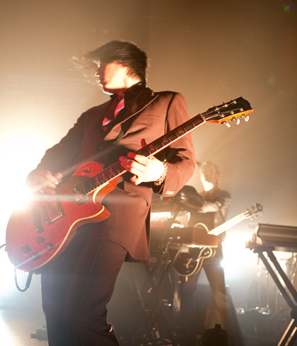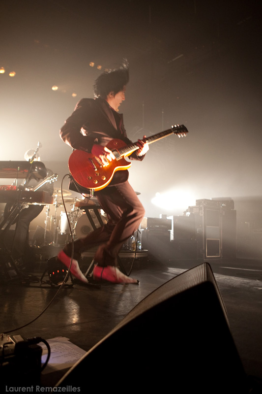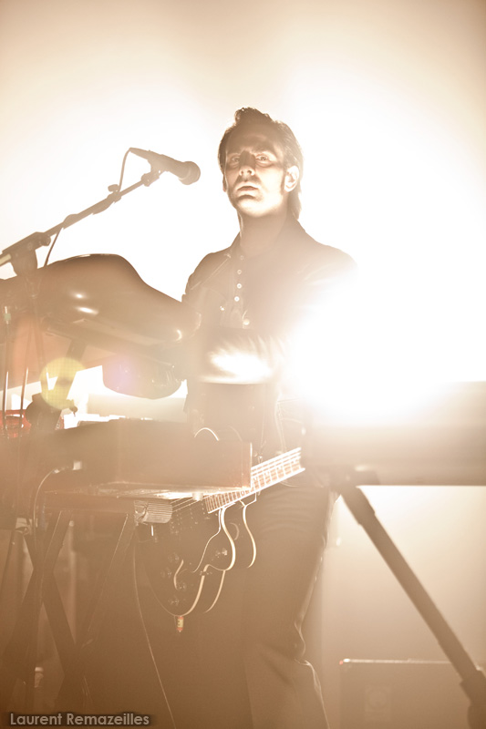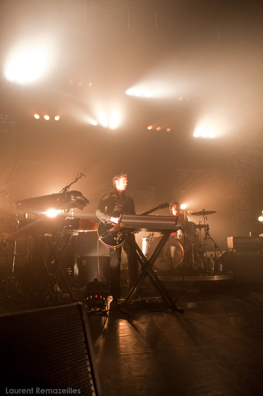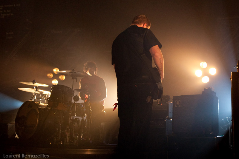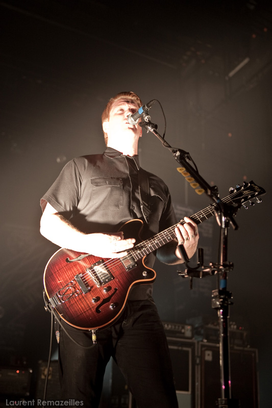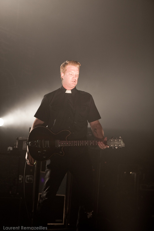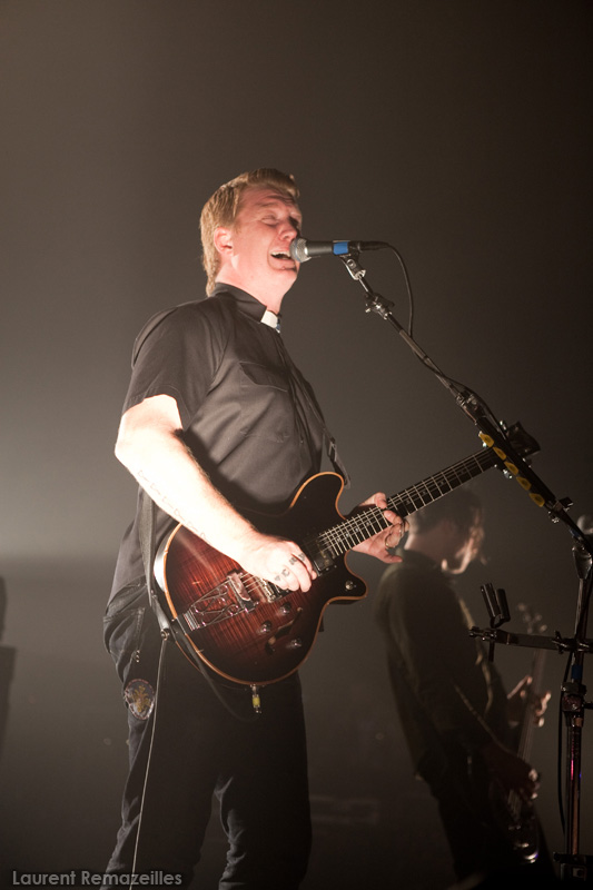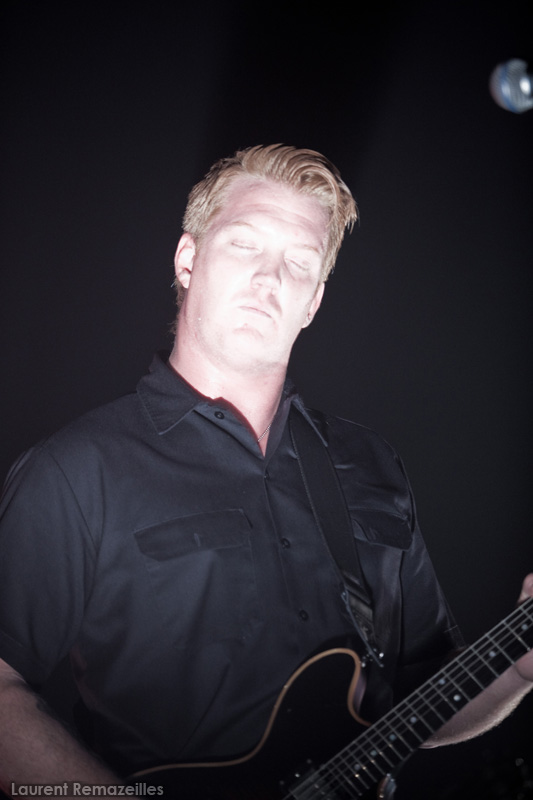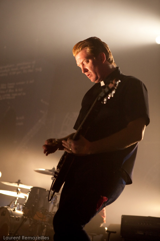 Le public a l’air bien chaud et c’est là une excellente nouvelle. Plus le public est bouillant, plus le groupe, et en particulier Josh Homme, se donnera à fond. La première note n’a pas encore retentie que cela crie, hurle et applaudit à tout va. Et nous voilà partis pour une soirée mémorable, un des sommets de la tournée à n’en pas douter (à en juger par moi-même ayant fait trois dates, et d’autres ami(e)s ayant fait jusqu’à cinq dates !). Pour connaître les attitudes du rouquin sur le bout des doigts, tous les signes d’un bon concert étaient présents. Tout d’abord un Josh qui parle au public assez régulièrement et qui bouge sur scène en utilisant au maximum l’espace (il passe « Hispanic Impressions » monté sur je-ne-sais-quoi à côté de la batterie). Ensuite une interaction directe avec son public, n’hésitant pas à répondre à quelques cris lancés à la volée ou demandant même à plusieurs reprises d’allumer les lumières de la salle pour voir le public (chose assez rare).