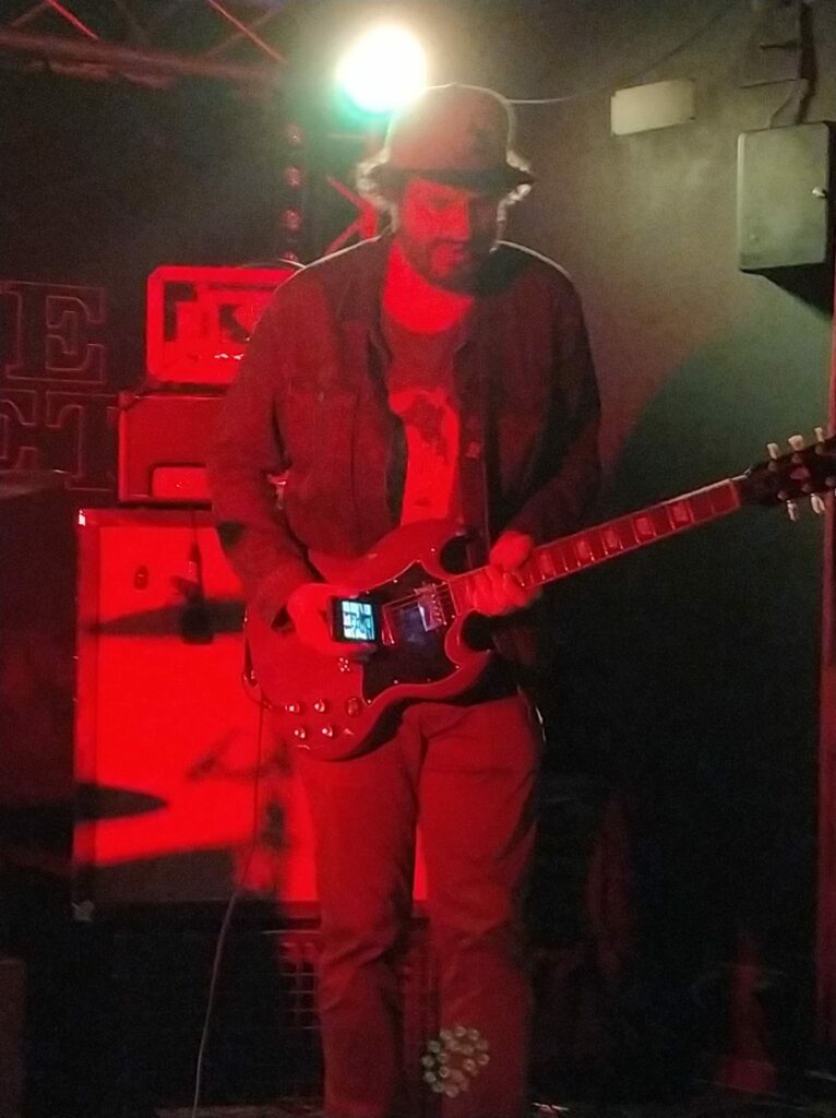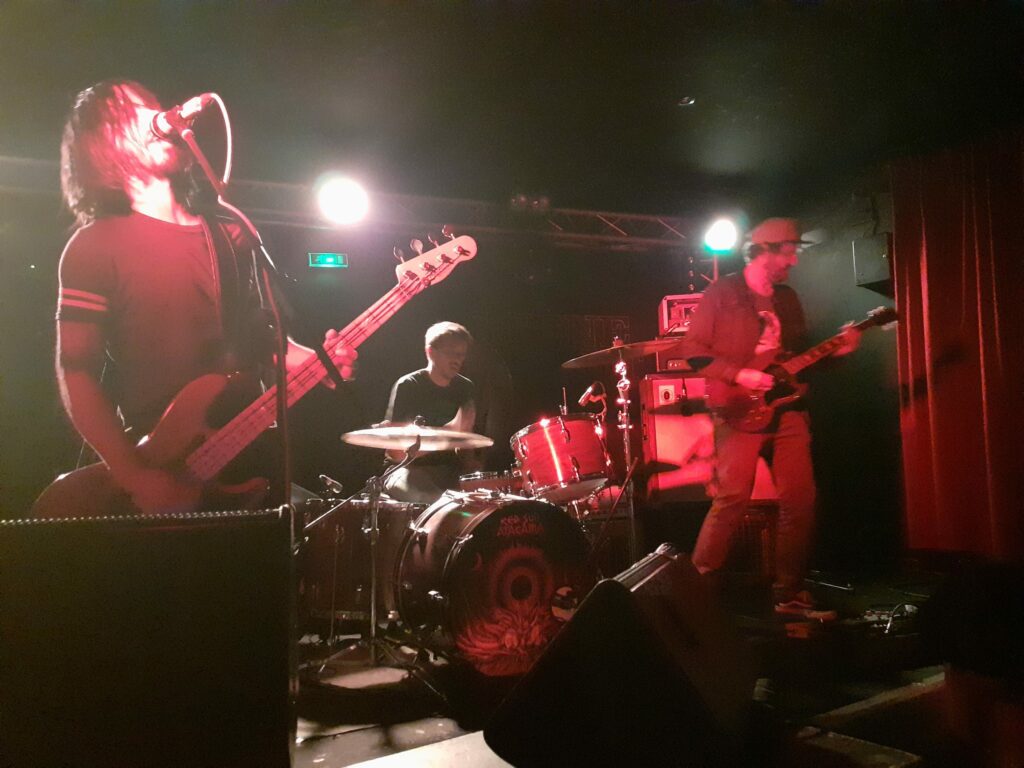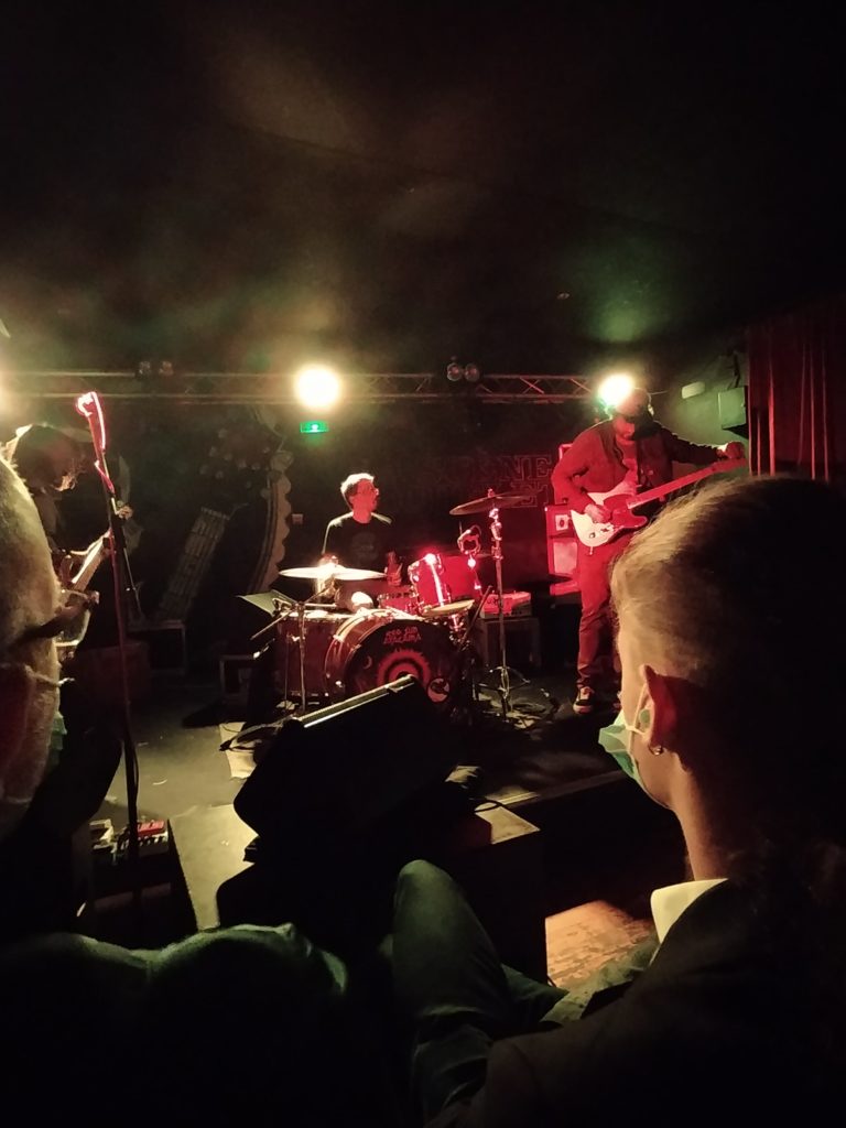 Ce soir le trio vient proposer ses nouveaux titres, on ne s’arrête pas de vivre parce qu’on a pas repris la scène depuis longtemps et c’est après une intro à l’orientation très blues que les gonzes font voler en éclat ce qui aurait pu rester de calme dans chaque auditeur présent et faisant ainsi naître des sourires que l’on imagine plein de dents derrière les masques.