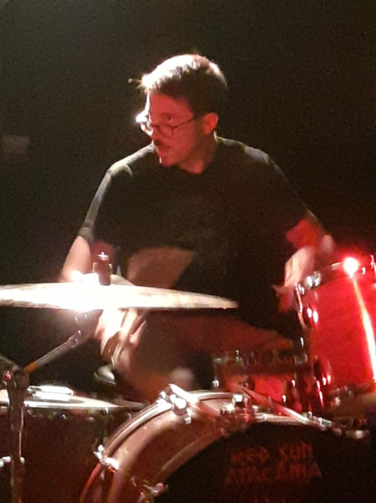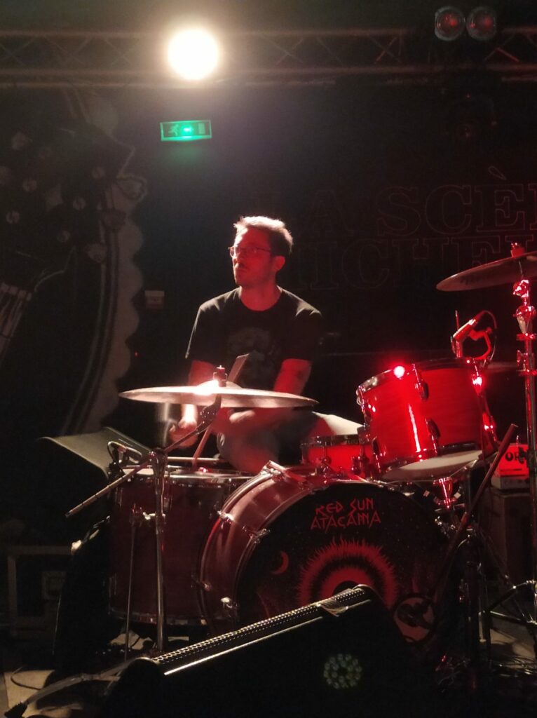 A peine la salle remplie, déjà Clém le bassiste demande si le temps imparti permet de se lancer dans une jam session. On sent bien que les gars ont besoin de se défouler avant d’attaquer les choses sérieuses. Le trio n’attend pas, il démonte la salle à coup de riffs et on se demande comment le public accepte la frustration de rester assis. On se demande aussi comment le premier rang évite la baguette qui glisse de la main du batteur à la fin du premier échange. Le plaisir est communicatif et le titre « Gold » ajoute de la pression sous le couvercle de la salle. Red Sun Atacama offre un investissement total dans le show. Jamais poseurs les gratteux se mettent en avant juste ce qu’il faut pour enivrer le public et valoriser leur musique.