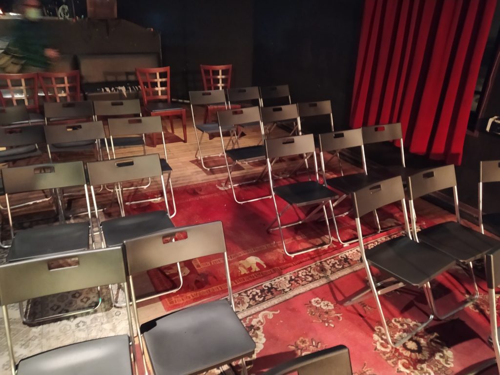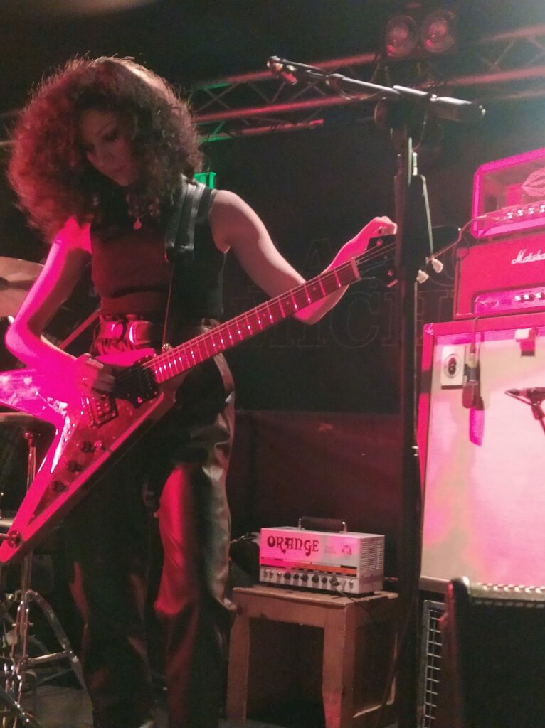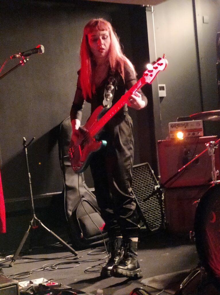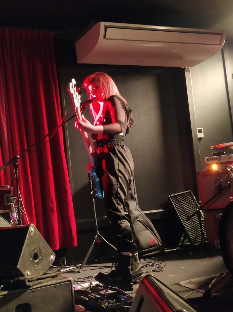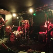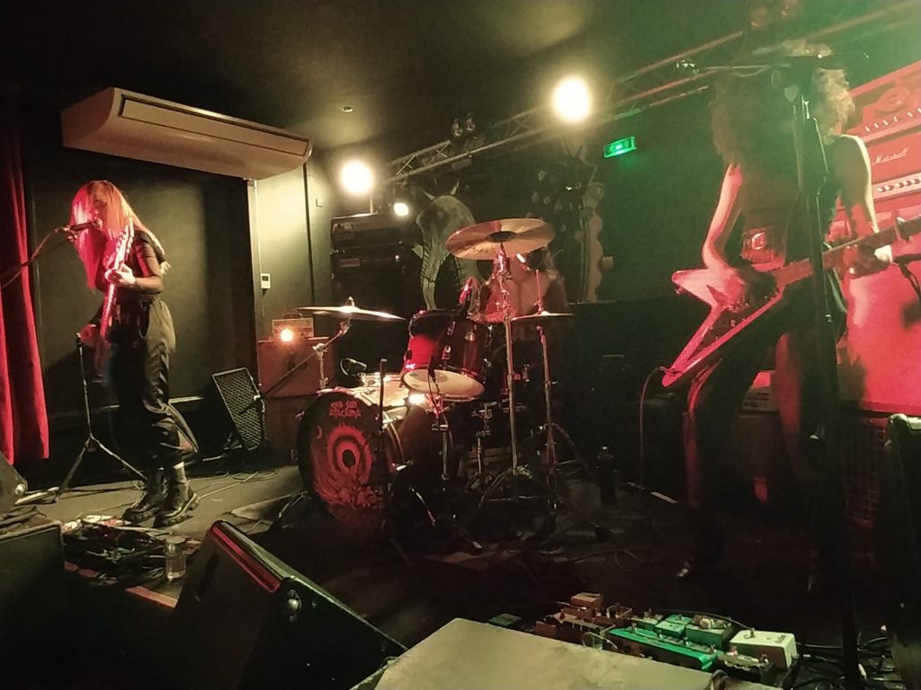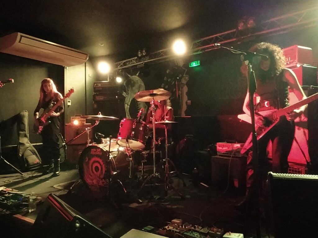 Il est 20h10 et Chloé chanteuse de Djiin et organisatrice vient gueuler en terrasse l’ouverture de la salle. Chacun monte alors prendre place sur chaise et c’est un acte toujours déstabilisant de se dire que l’on va assister à un concert pimenté le cul posé. Les trois musiciennes de Grandma’s Ashes montent sur scène, prennent leurs marques et rapidement enchaînent les riffs de leur musique qu’elles définissent comme un mélange de punk et Stoner notamment.