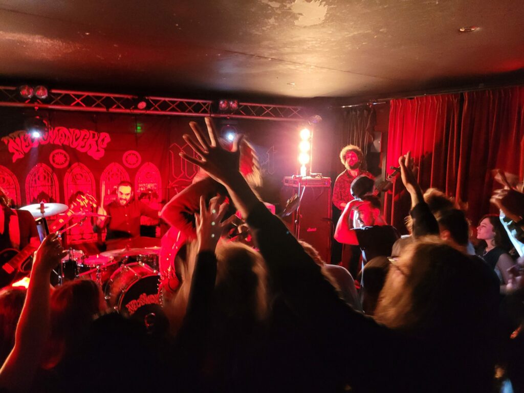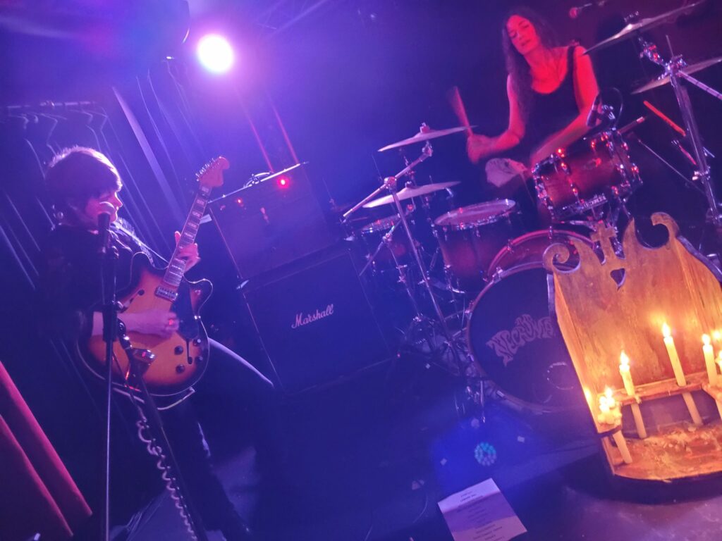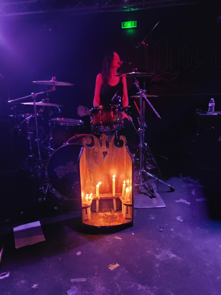 C’est enfin l’heure de rendre hommage à l’ange déchu, The Necromancers est visiblement et comme à chaque fois le groupe le plus attendu. Son line-up qui a encore évolué renverse la salle au figuré et soulève le parquet au propre. Les âmes s’échauffent et Satan s’empare de quelques âmes affaiblies pour en faire des bêtes furieuses dans le pit. A jurer que si le Michelet avait fermé ce soir, une heure de set supplémentaire aurait suffi à le rayer de la carte pour de bon.