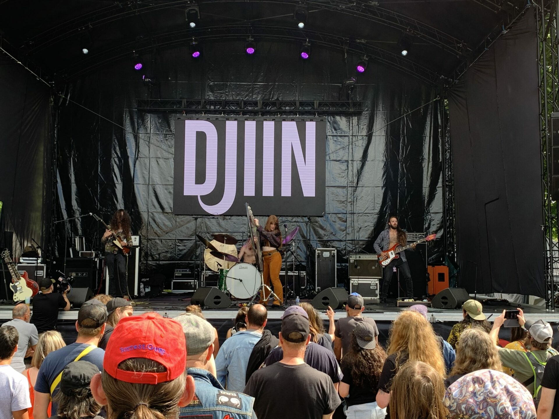 Une mise en bouche qui vient réveiller nos popotins et suivie par les non moins entraînantes mélodies de Djinn, décalant son créneau de l’après-midi pour remplacer la voix rocailleuse de Midnight Ghost Train. Devant une foule qui grossit malgré le concert spécial dans l’église de Bourlon (la chaleur et le monde présent là-bas auront eu raison de notre patience), les bretons marquent par la maîtrise de leur rock psychédélique, guidé par la voix rocailleuse de Chloé, et gagnent en assurance scénique au fur et à mesure que les morceaux passent, Chloe se jetant carrément dans la fosse sur le dernier morceau !