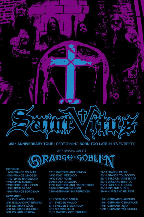 Saint Vitus sera en tournée en Europe en octobre et novembre pour célébrer leur 35 ans d’existence. Ils en profiteront pour jouer l’album Born too Late dans son intégralité. Déjà en soit voilà une news qui en fait frémir plus d’un. Sauf que voilà que Orange Goblin annonce qu’ils seront de la partie pour faire la promo de leur 8ème album (à venir cet automne chez Candlelight Records).