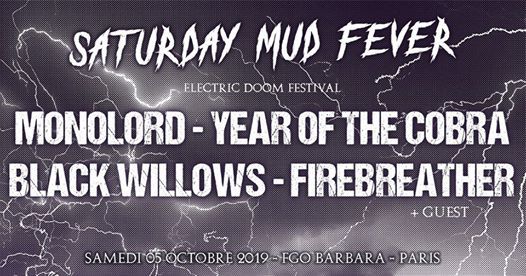 Ces réjouissances se tiendront le 05 Octobre 2019 à Paris au FGO Barbara, préventes et infos ici : https://www.weezevent.com/saturday-mud-fever?fbclid=IwAR3PIjDC3UmWD_DjiXqFnURM2dInWRslJE5C0mHfzWz_tLyfUY1M5M5bBVk