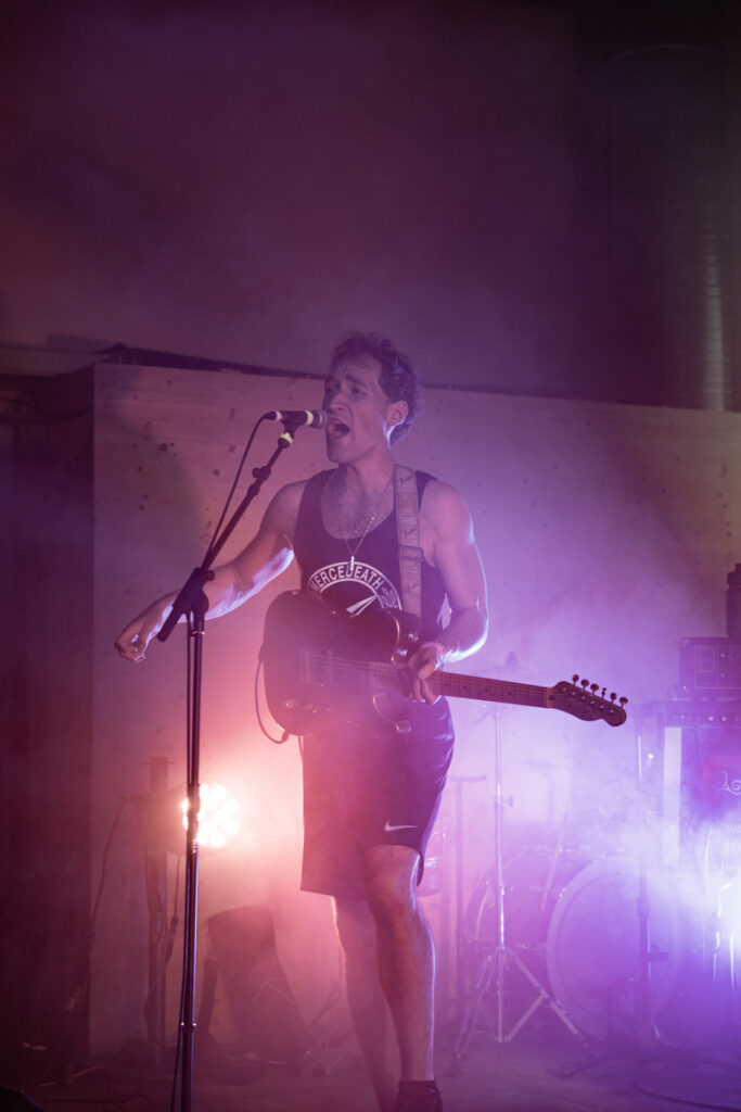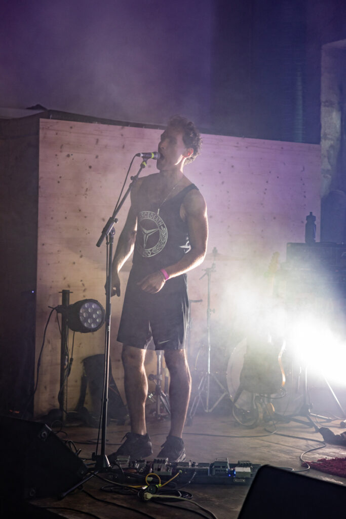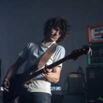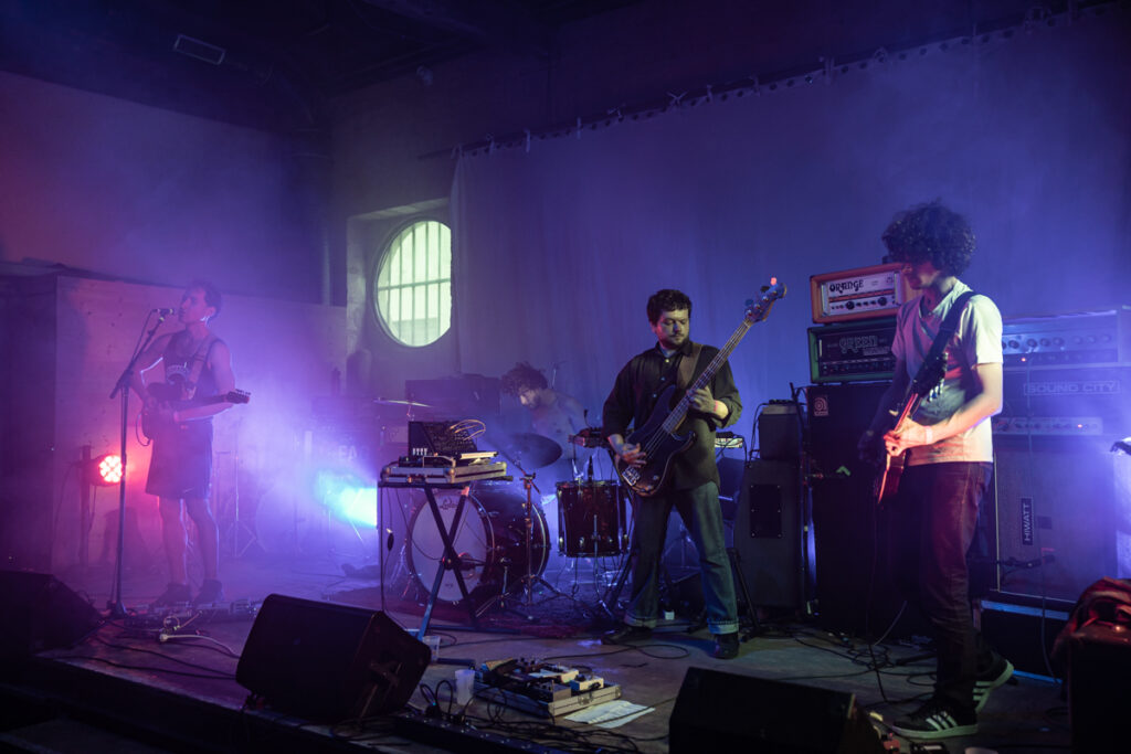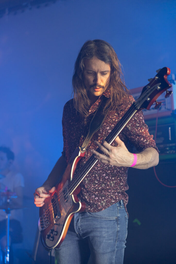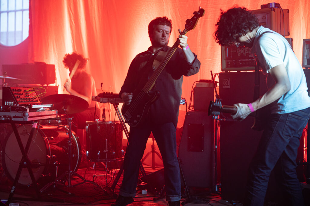 On rejoint donc ce haut lieu de la culture bordelais (une belle salle de concert, bien décorée, une cour extérieure pleine de structures fun et sculptures métalliques et autres…) dans une ambiance propice au chill absolu (coucher de soleil, DJ set crépusculaire, météo tee shirt / short, sourires…). On empoigne une blonde (une bière, esprits mal tournés !) et on rejoint la belle scène alors que Guadal Tejaz crache ses premiers décibels. On se laisse rapidement emporter par le groove des rennais, qui mêlent une énergie garage limite punk avec une base rythmique lancinante qui confère une tonalité psyche incontestable à l’ensemble. Scéniquement, on s’ennuie pas non plus, avec le guitariste et le bassiste s’échangeant occasionnellement leurs instruments, le batteur se calant derrière un pupitre pour lancer des séquences électroniques plutôt que frapper ses futs, et un frontman déjanté. Original et séduisant.