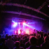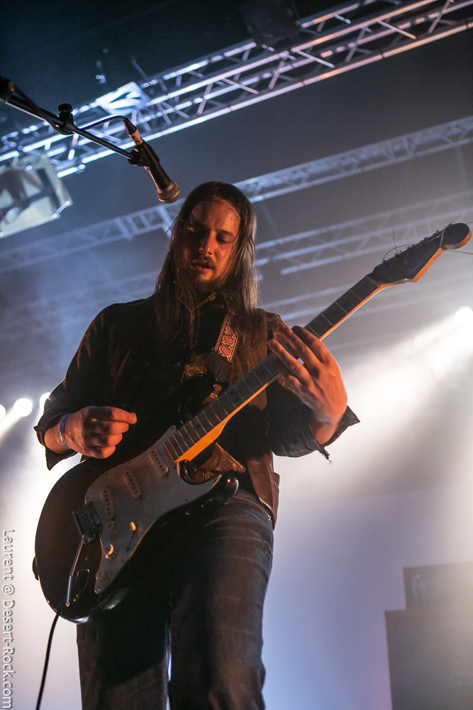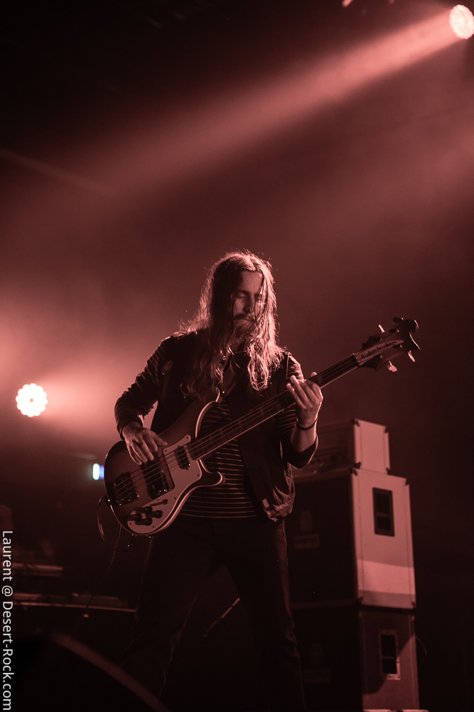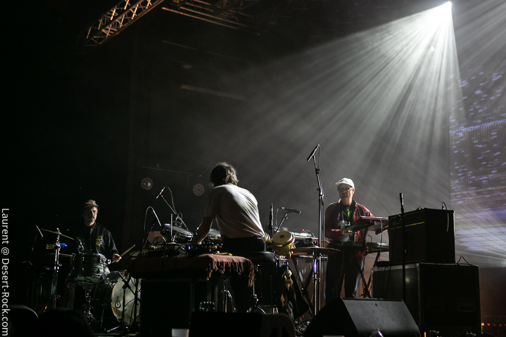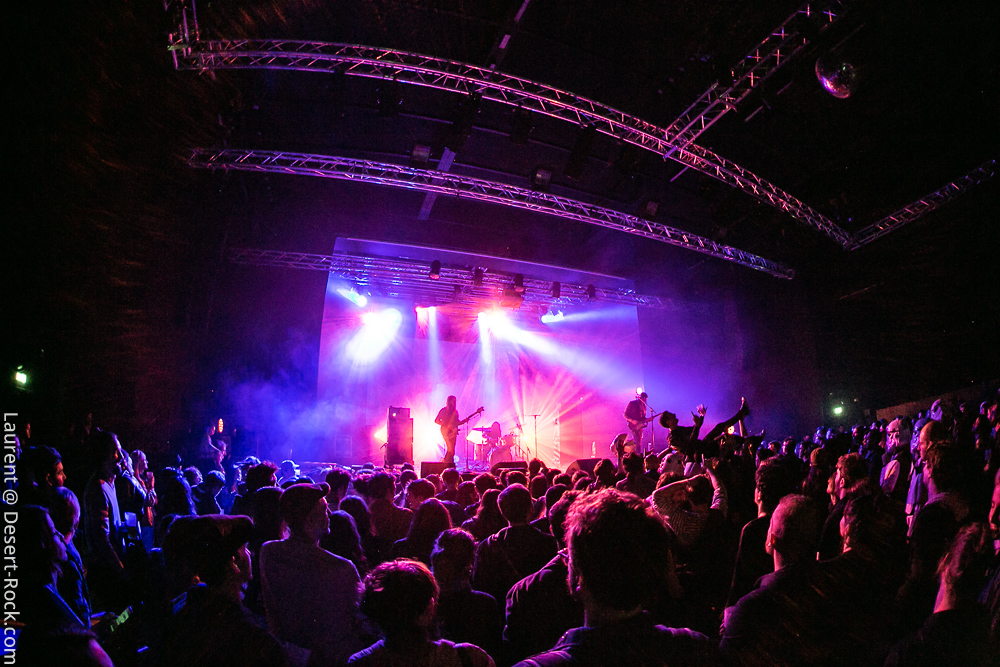 Petit passage au food truck et repas au clair de lune vite fait, et il est déjà temps d’aller jeter une oreille à Electric Moon. Les sets du trio allemand sont rares, et celui de ce soir est attendu. Loin de profiter de leur aura ou de l’attente autour d’eux pour « cérémonialiser » l’événement, le groupe improvise l’intro la plus foutraque imaginable, en lançant son set d’affilée avec un sound check rapide, lumières de la salle encore allumées, autour de trois blagounettes à l’attention du public. Puis le set monte en tension pendant de longues minutes, ce qui ne surprendra personne au vu du genre pratiqué : Electric Moon fait désormais référence dans le pur space rock, en piochant ici ou là chez Hawkwind et autres ténors, et en y injectant des jams sans fin et quelques plans lancinants dérivés du krautrock plus proche de leurs racines culturelles « géographiques ». Sans compromission, leur premier titre propose donc une ascension d’une bonne trentaine de minutes, menant progressivement à une sorte de maelstrom space rock fuzzé assez jouissif, une fois l’immersion opérée. Souriants mais très statiques sur scène (quasiment tournés les uns vers les autres non stop) les trois teutons développent leur propos pendant un peu moins d’une heure avec une réelle maîtrise de leur sujet. Ils appuient ce soir encore un peu plus leur statut de référence du genre.