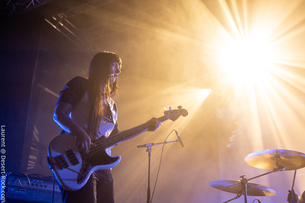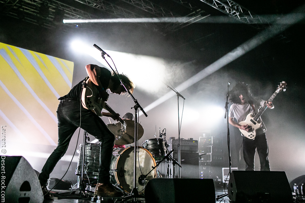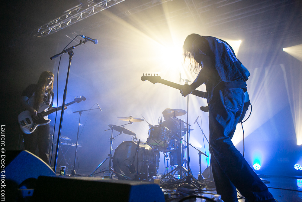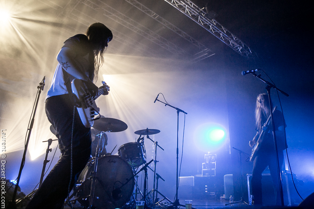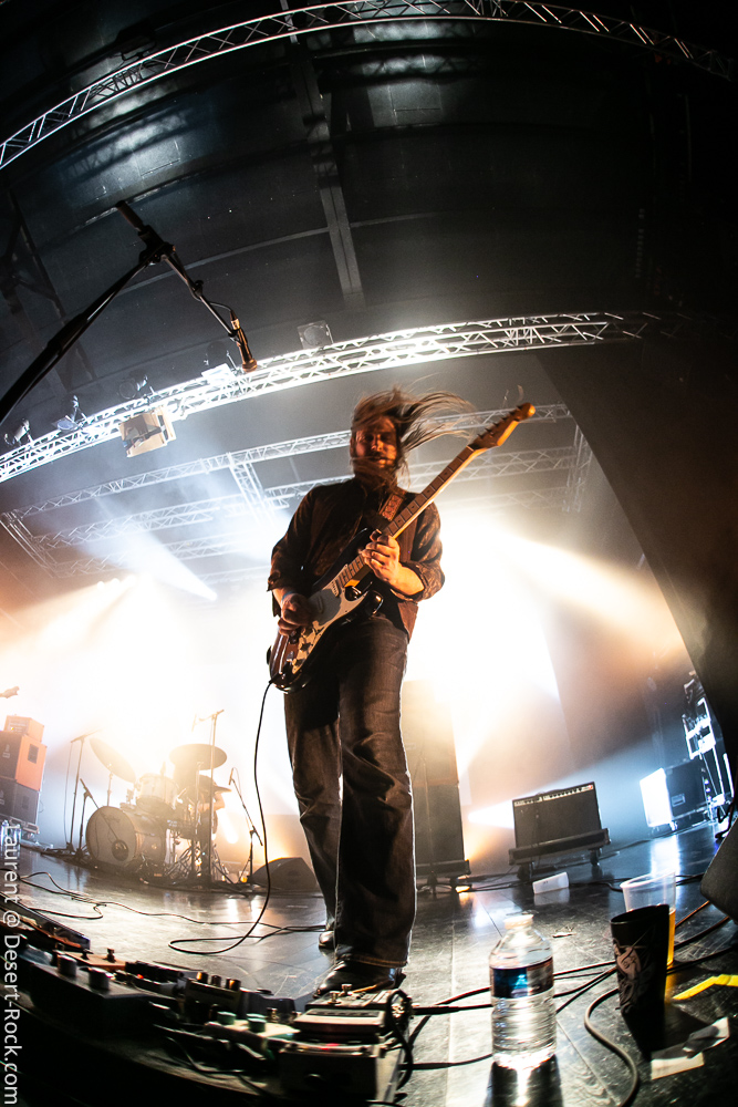 A peine le temps de siroter un premier breuvage dans les coursives et la petite cour de la salle (le soleil radieux ajoute au bon feeling de la journée !) et il est déjà temps de regagner la salle pour assister au set de Slift : le trio toulousain propose une entame pleine d’énergie qui met immédiatement le public dans leur poche. Leur rock psyche nerveux a tout pour séduire un public assez large, ce qui est le cas de l’assistance aujourd’hui, provenant de toutes les obédiences du rock au sens large. Les premières compos ne s’éternisent pas, le set tourne bien et les riffs fusent. Le chant, rare et chargé d’effet, ajoute à cet esprit vaguement space rock, tandis que la formule trio fait le job comme on s’y attend, avec d’innombrables envolées de guitare lead s’appuyant sur une base rythmique solide (et en particulier un jeu de basse solide et mélodique). La deuxième partie du set laisse un peu plus de place aux sections instrumentales, sans jamais toutefois laisser court aux jams débridées sans queue ni tête. Les gaillards n’ont rien inventé, mais ils le font avec talent et conviction. Un très bon set !
