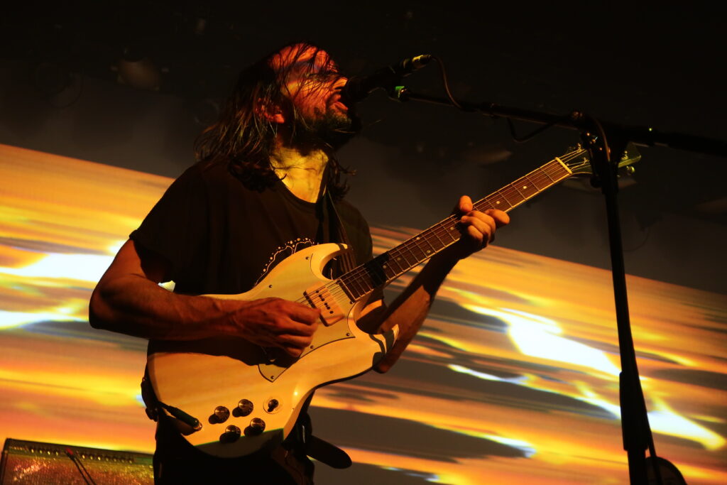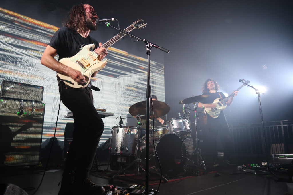Très vite les perceptions se confondent et les murs de son commencent à nous balayer comme des bateaux de noix dans la tempête. L’énergie du groupe est stupéfiante, à l’image de son guitariste Jean Fossat effectuant de frénétiques aller-retour entre micro et ampli, ne lâchant sa Gibson SG que pour poser les doigts sur son clavier. La basse de son frangin Rémi ne s’arrête pas non plus, en atteste les frasés exaltés d’« Ilion ». Et que dire du batteur, capable d’enchaîner de longs staccatos entraînants avec de puissantes séquences à déchausser les dents. Côté foule, la réponse est au rendez-vous : dès l’arrivée d’« Ummon », joué pour l’occasion plus rapide que sur l’album, les passions se déchainent et explosent aussitôt en pogo. Plus tard, des slams se succèdent même sur ce monument à briser des nuques « Weavers’ Weft » et sur « Altitude Lake ». Bien évidemment, ces déchainements perdraient de leur superbe sans les découpages planants qui les séparent, permettant ainsi à l’auditoire de reprendre son souffle, et dans le même temps de reculer pour mieux sauter.